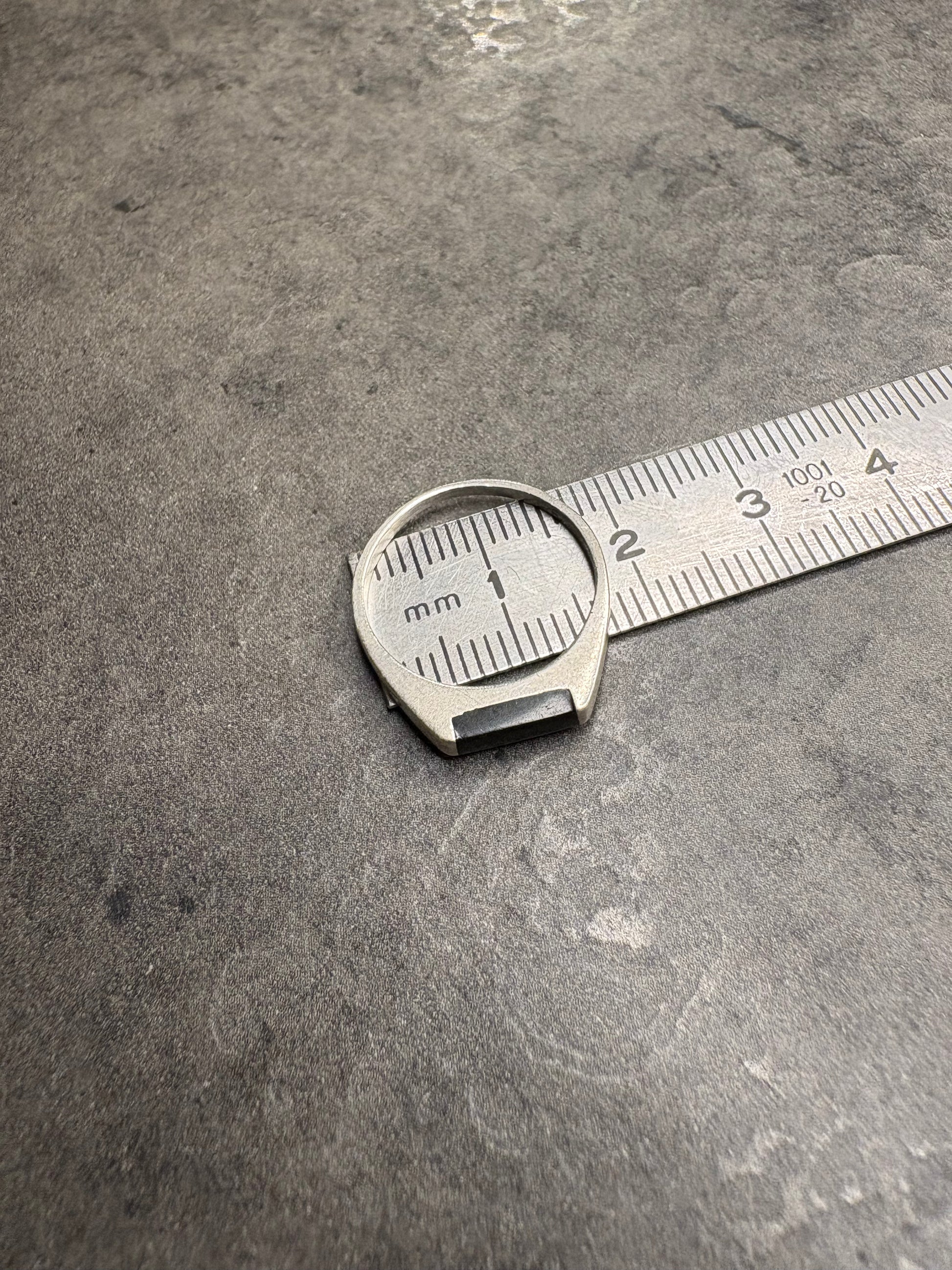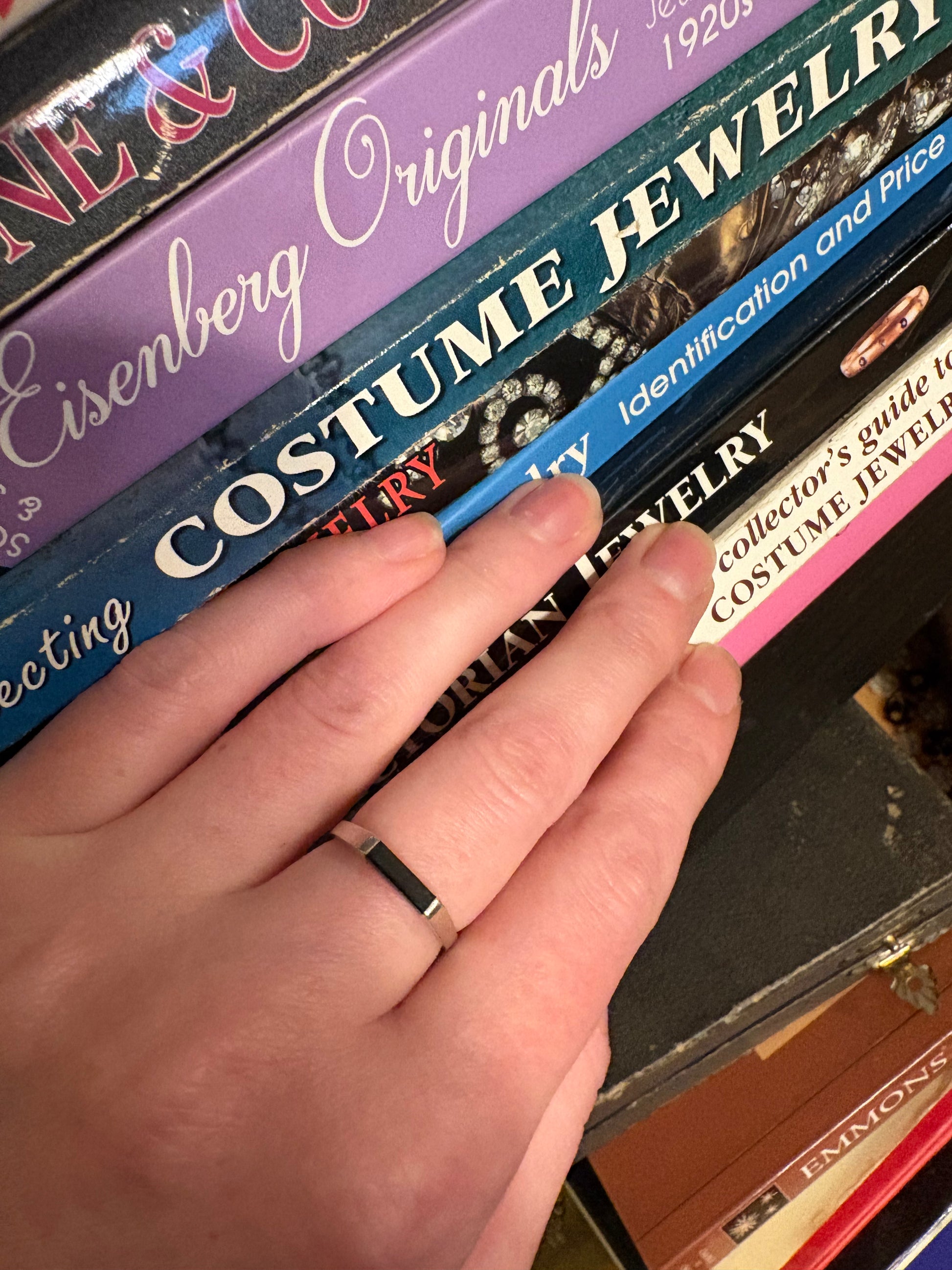 Raffinato anello vintage in argento 925, dal design minimalista ed elegante. La montatura sottile e leggermente squadrata accoglie una pietra rettangolare di onice nera, incastonata in modo lineare per un effetto sobrio ma di grande classe.