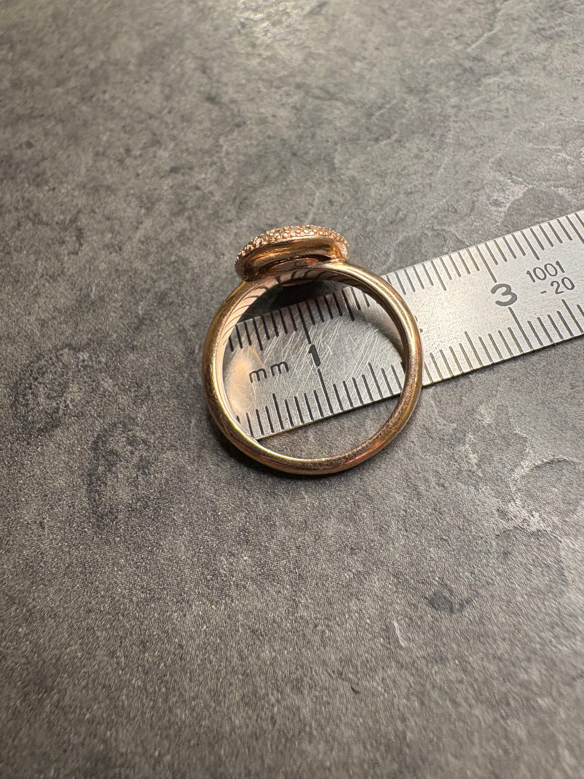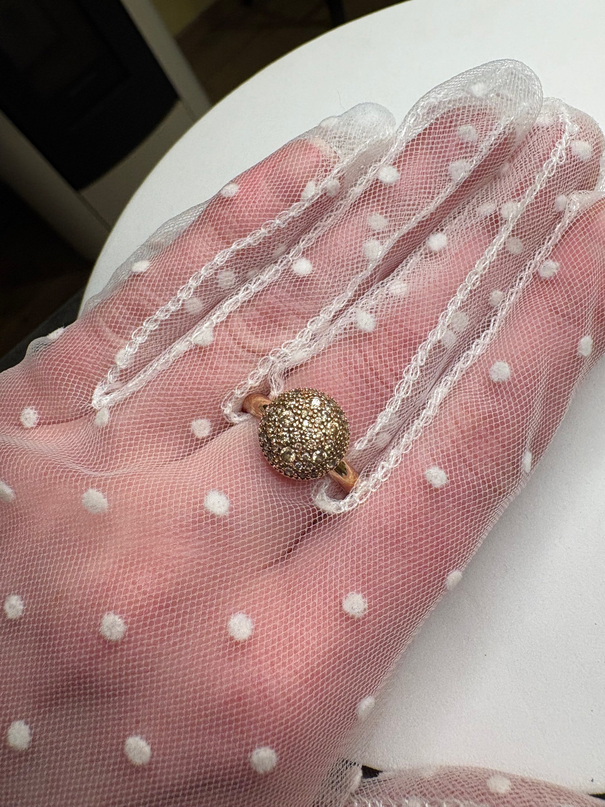 Delicato anello vintage in argento 925 con placcatura color oro caldo, impreziosito da una sfera centrale con pavé di piccoli cristalli nelle tonalità giallo-rosa che creano un effetto luminoso e romantico. La superficie micro-incastonata riflette la luce con eleganza, mentre il gambo sottile e lucido mantiene l’anello comodo e raffinato. Perfetto da indossare da solo per un tocco discreto o abbinato ad altri anelli vintage per uno stile più moderno.