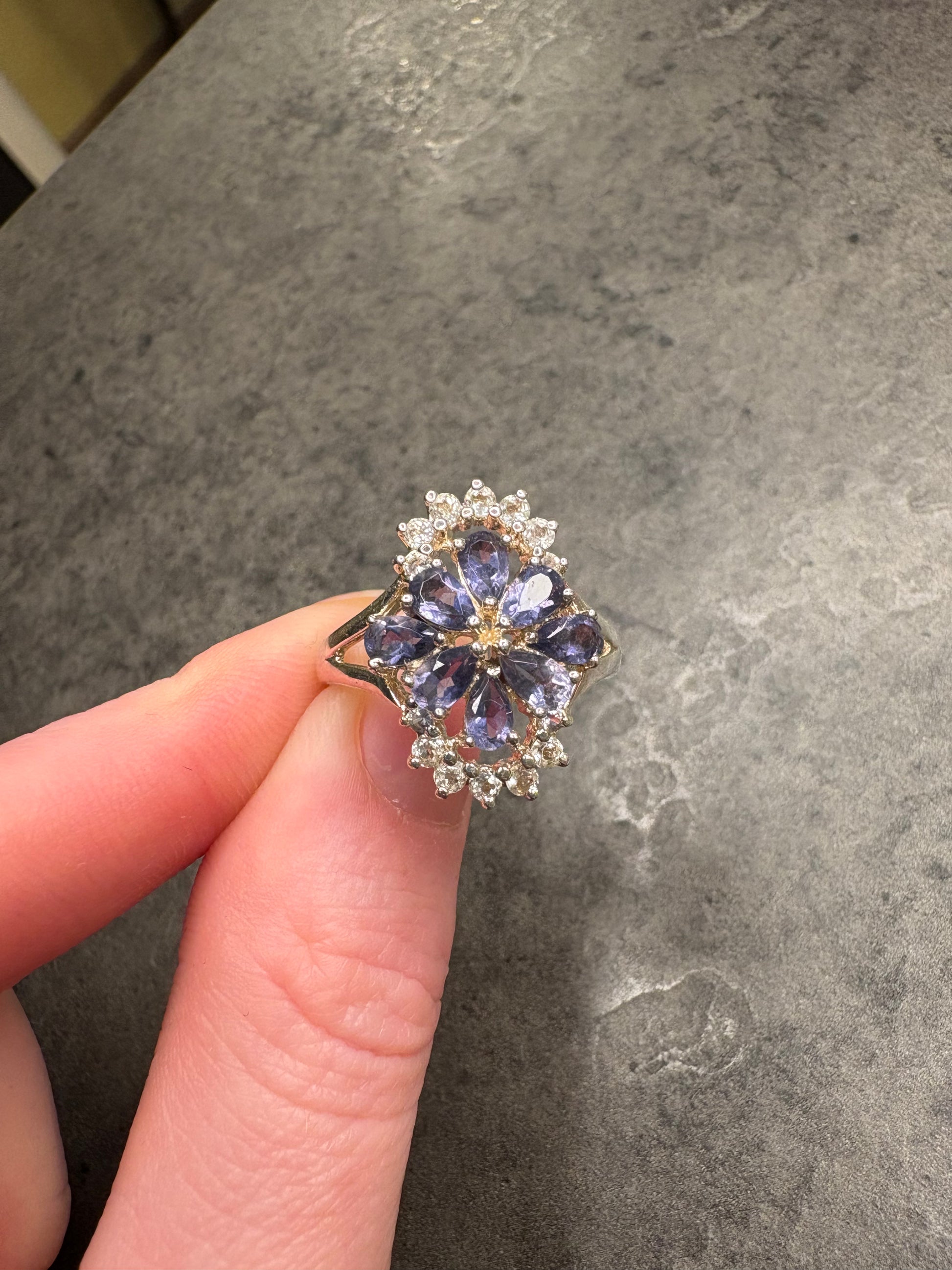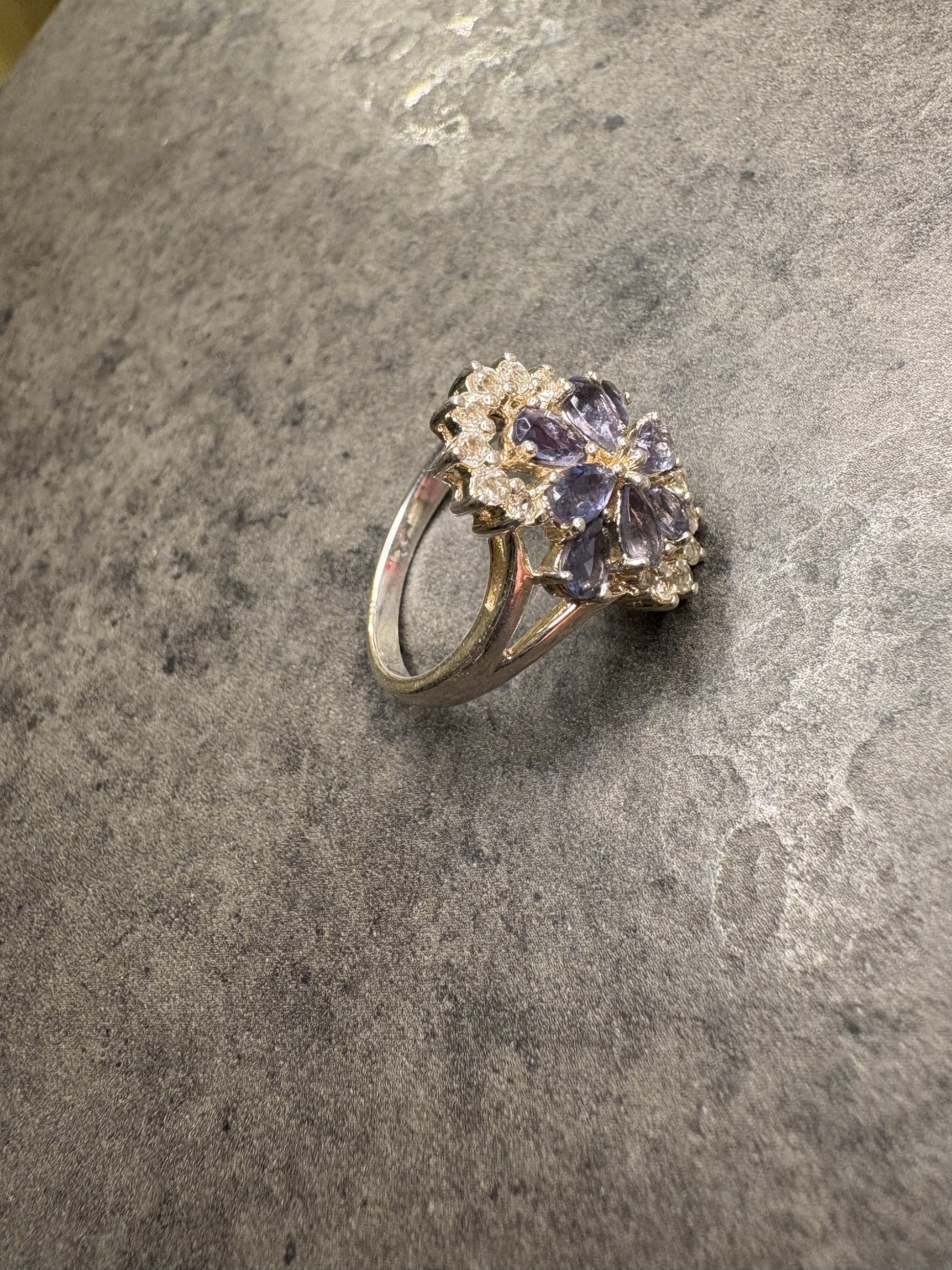 Il design presenta un motivo floreale centrale composto da petali di iolite sintetico taglio marquise, dalle intense sfumature azzurro-violacee, incastonati a griffe in una montatura a giorno che ne esalta la trasparenza.