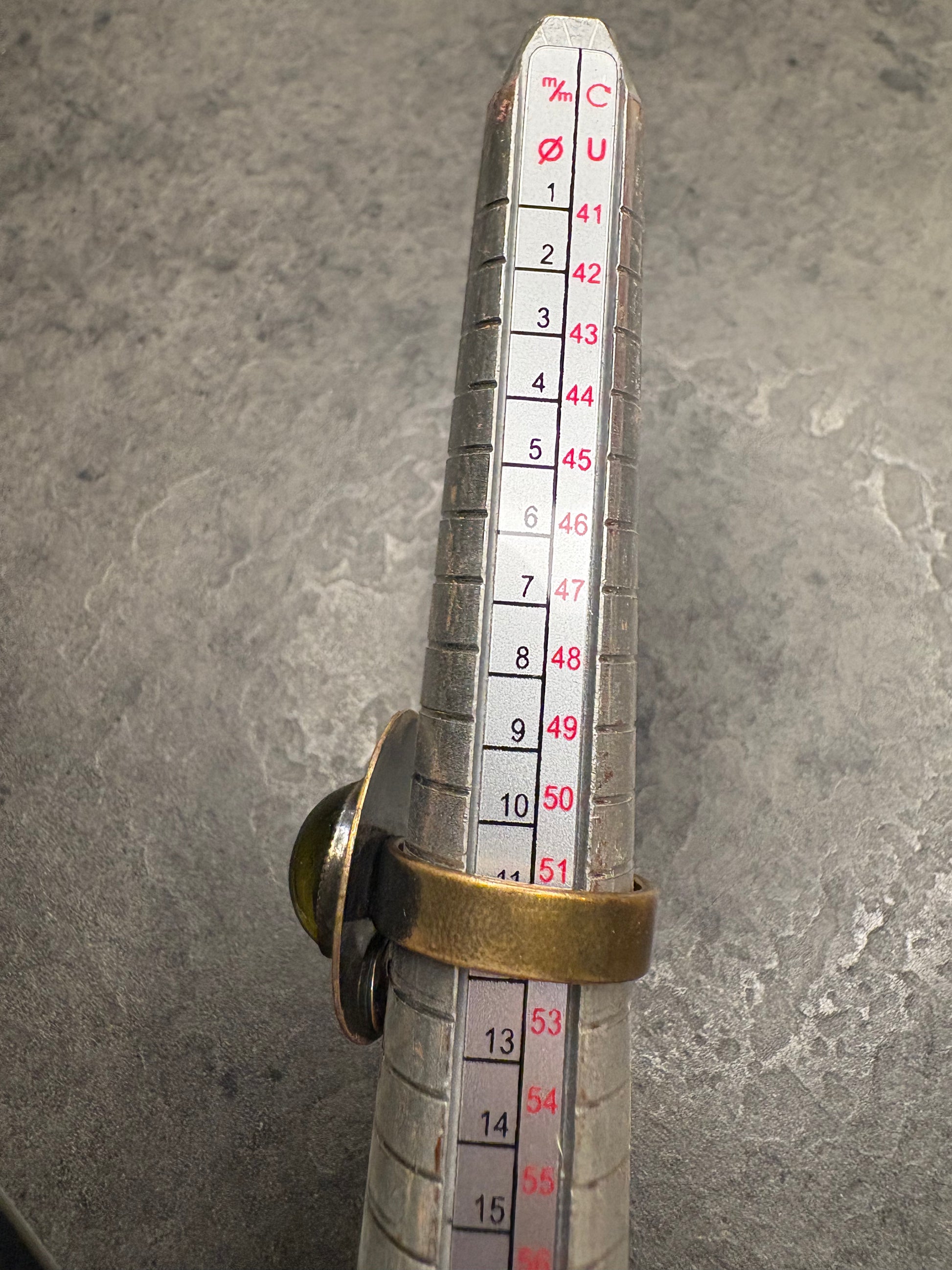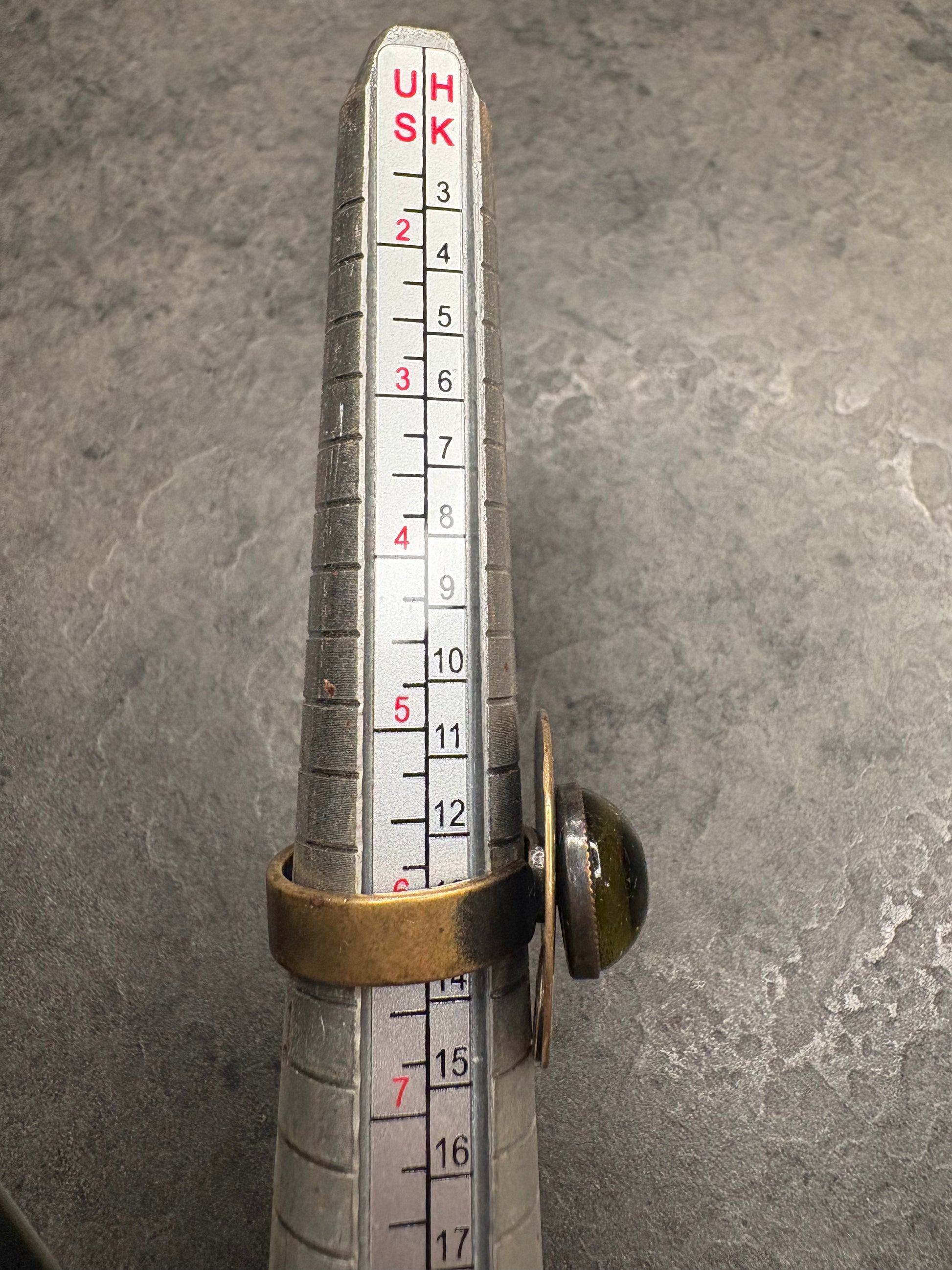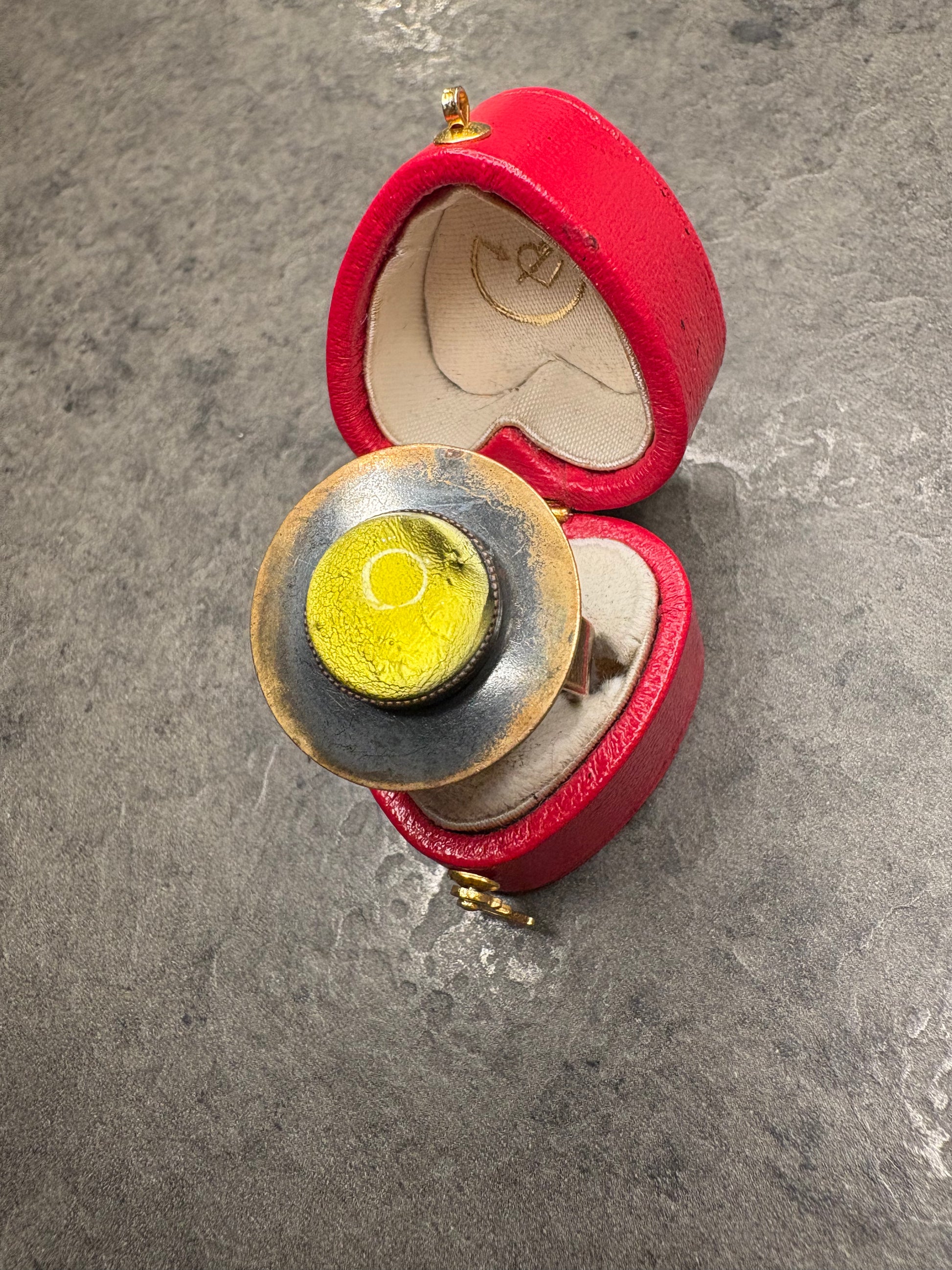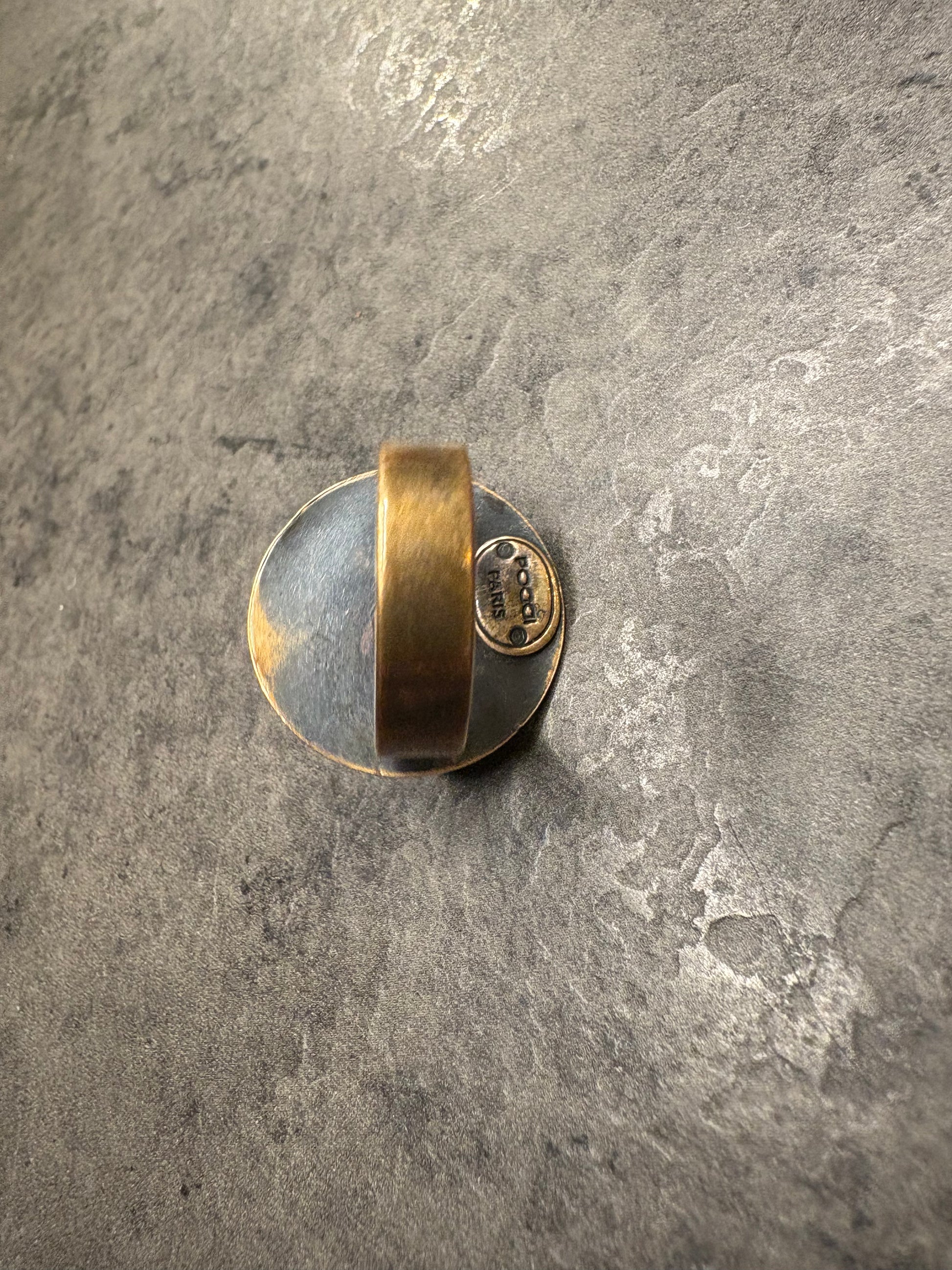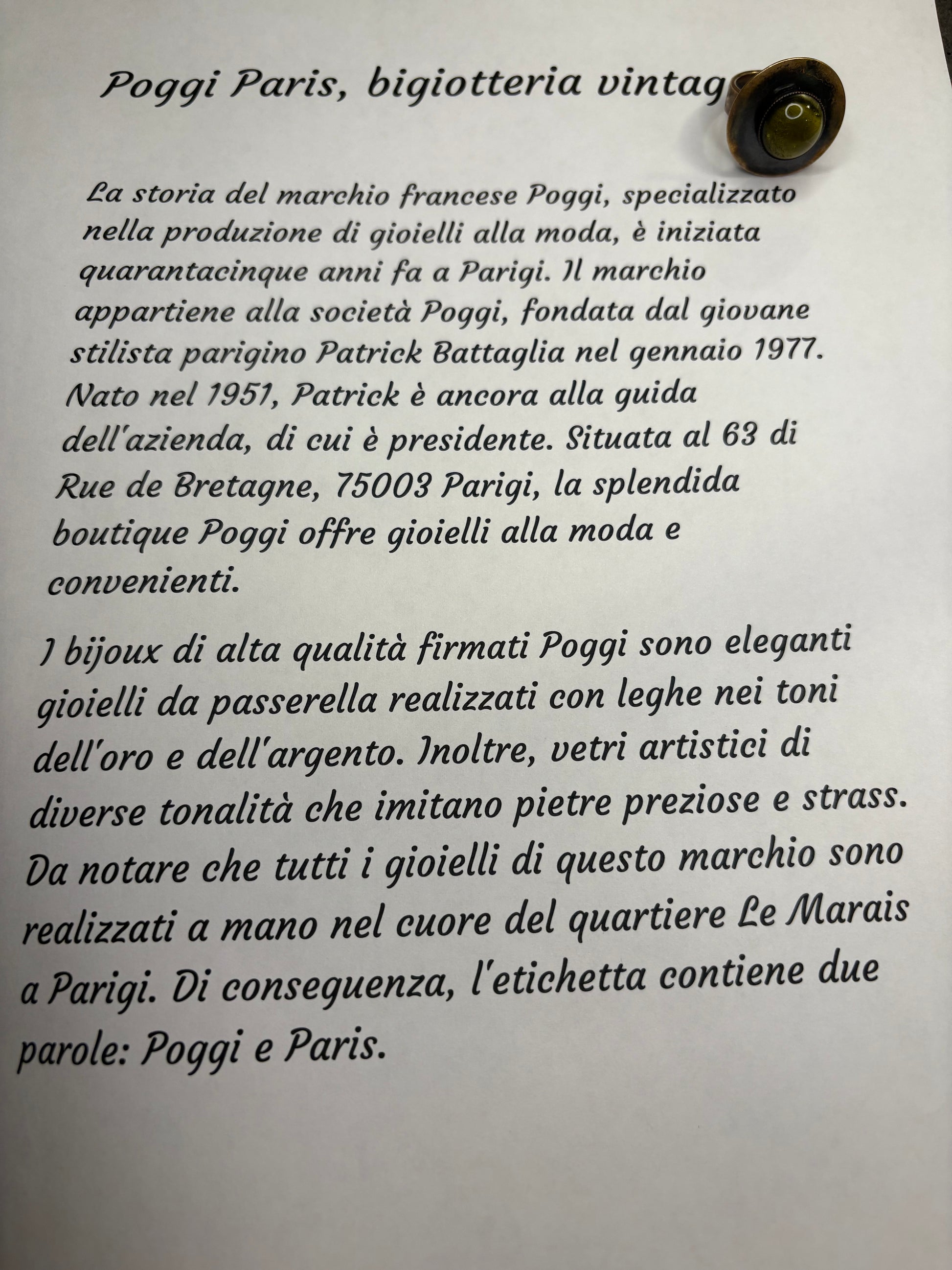 Anello vintage firmato Poggi Paris, dal design audace e raffinato, realizzato a mano in metallo dorato brunito con una splendida patina anticata che ne esalta il carattere artistico. Al centro è incastonato un cabochon in vetro artistico verde chiaro, luminoso e ricco di sfumature grazie all’elegante effetto craquelé tipico delle creazioni Poggi. La fascia, leggermente regolabile, permette una perfetta vestibilità e rende l’anello adatto a diverse misure. Un gioiello dallo stile contemporaneo e ricercato, che esprime pienamente l’eleganza e la creatività della bigiotteria parigina più iconica.