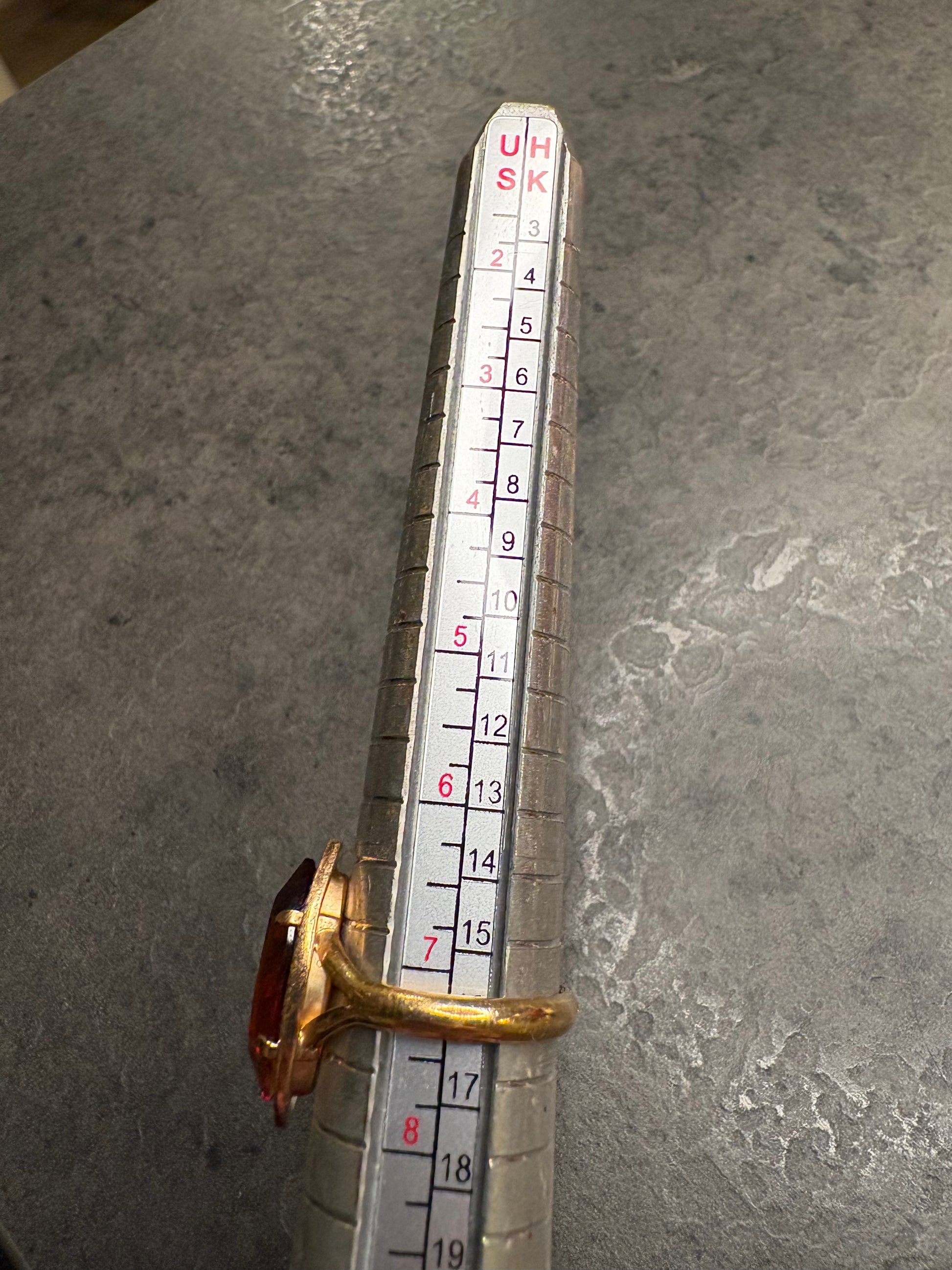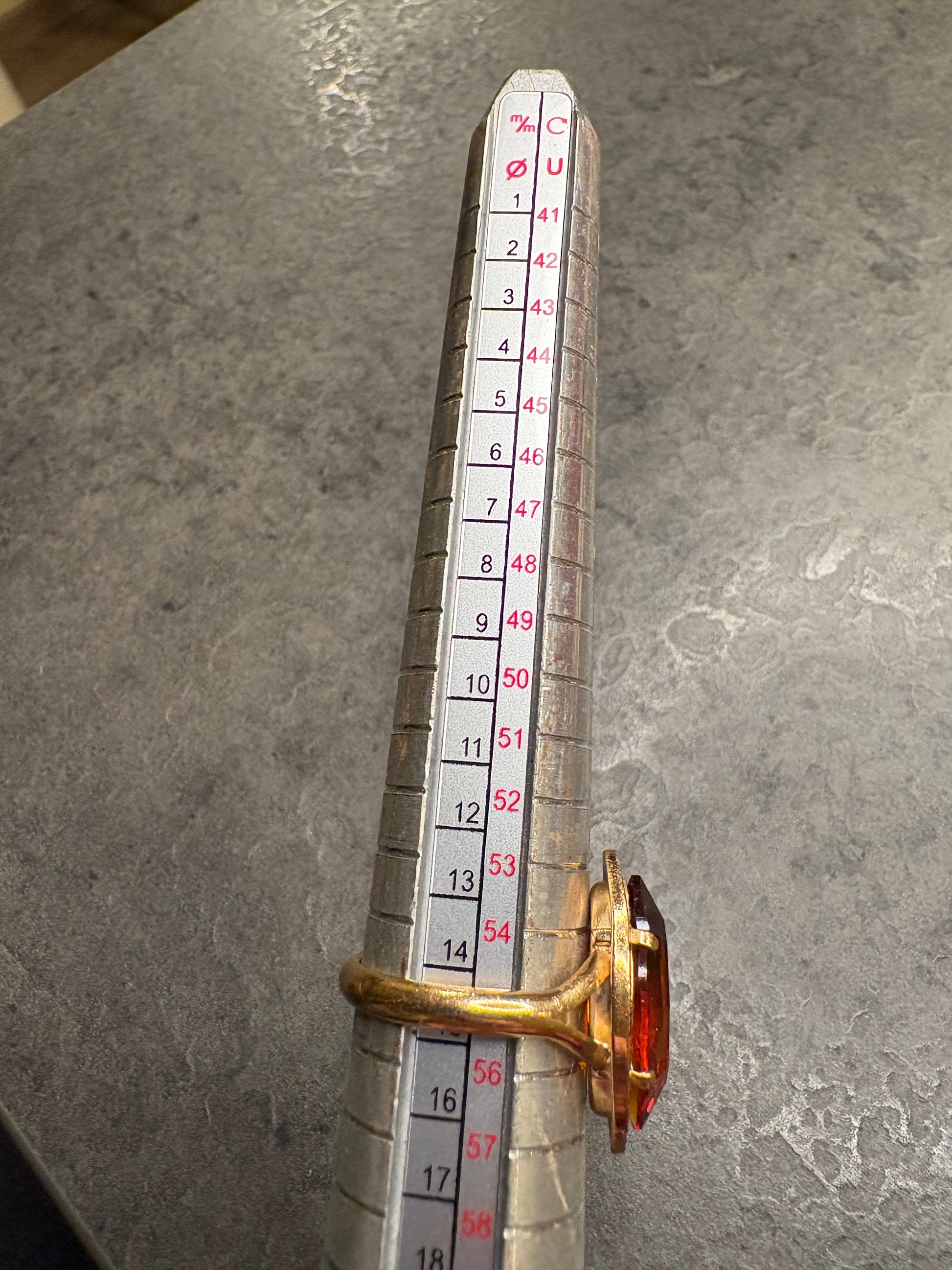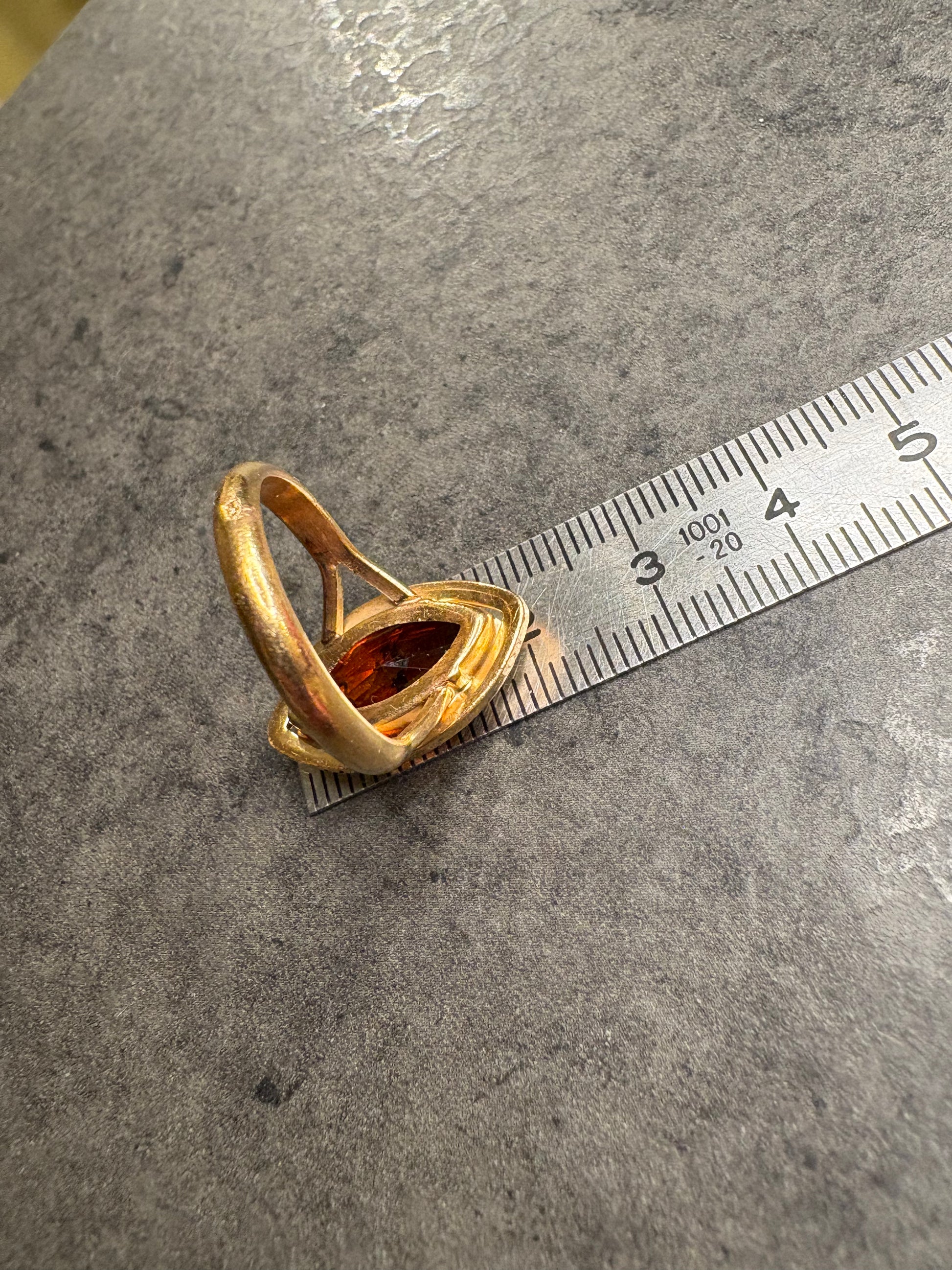 Splendido anello vintage di bigiotteria, caratterizzato da un design audace e scenografico tipico degli anni ’60-’70. Al centro troneggia una grande pietra sfaccettata taglio marquise, in un’intensa tonalità ambra/arancio bruciato, capace di catturare la luce con riflessi caldi e vibranti.