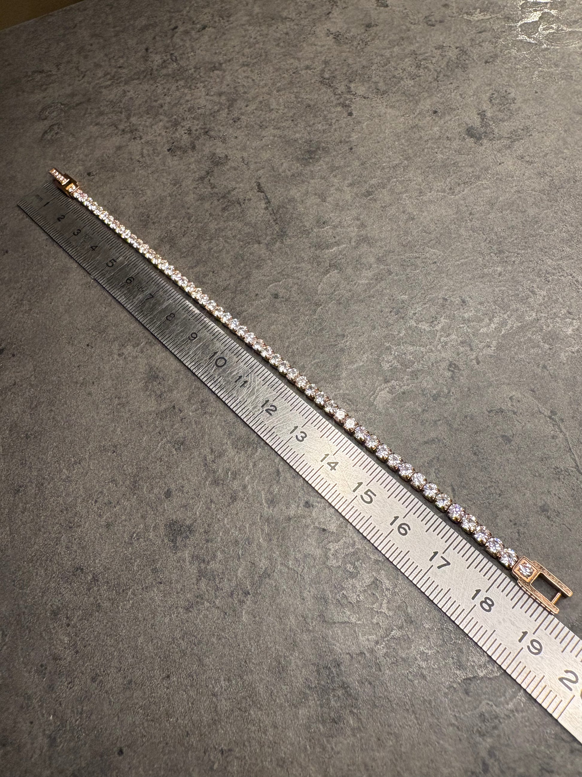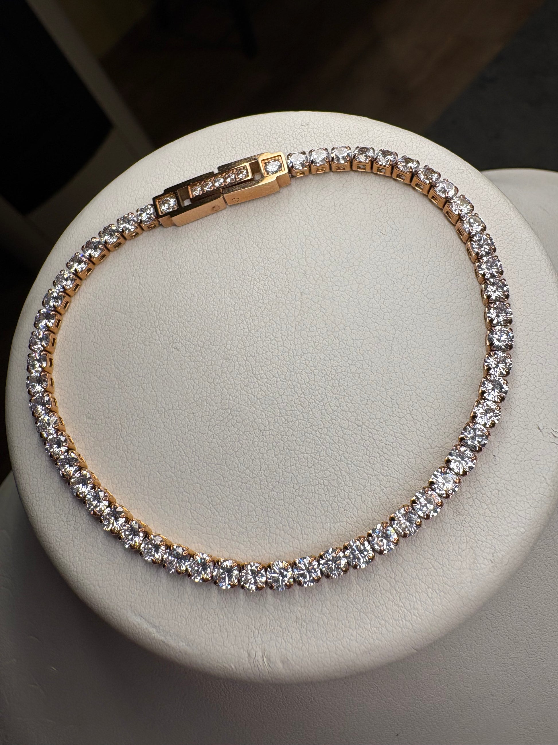 Bellissimo e luminoso bracciale tennis vintage, realizzato in acciaio inox placcato oro rosa. È impreziosito da una sequenza continua di cristalli tondi taglio brillante, incastonati a griffe, che regalano una luce straordinaria a ogni movimento. La chiusura è a scatto con sicura, anch’essa arricchita da piccoli cristalli per un dettaglio di classe.