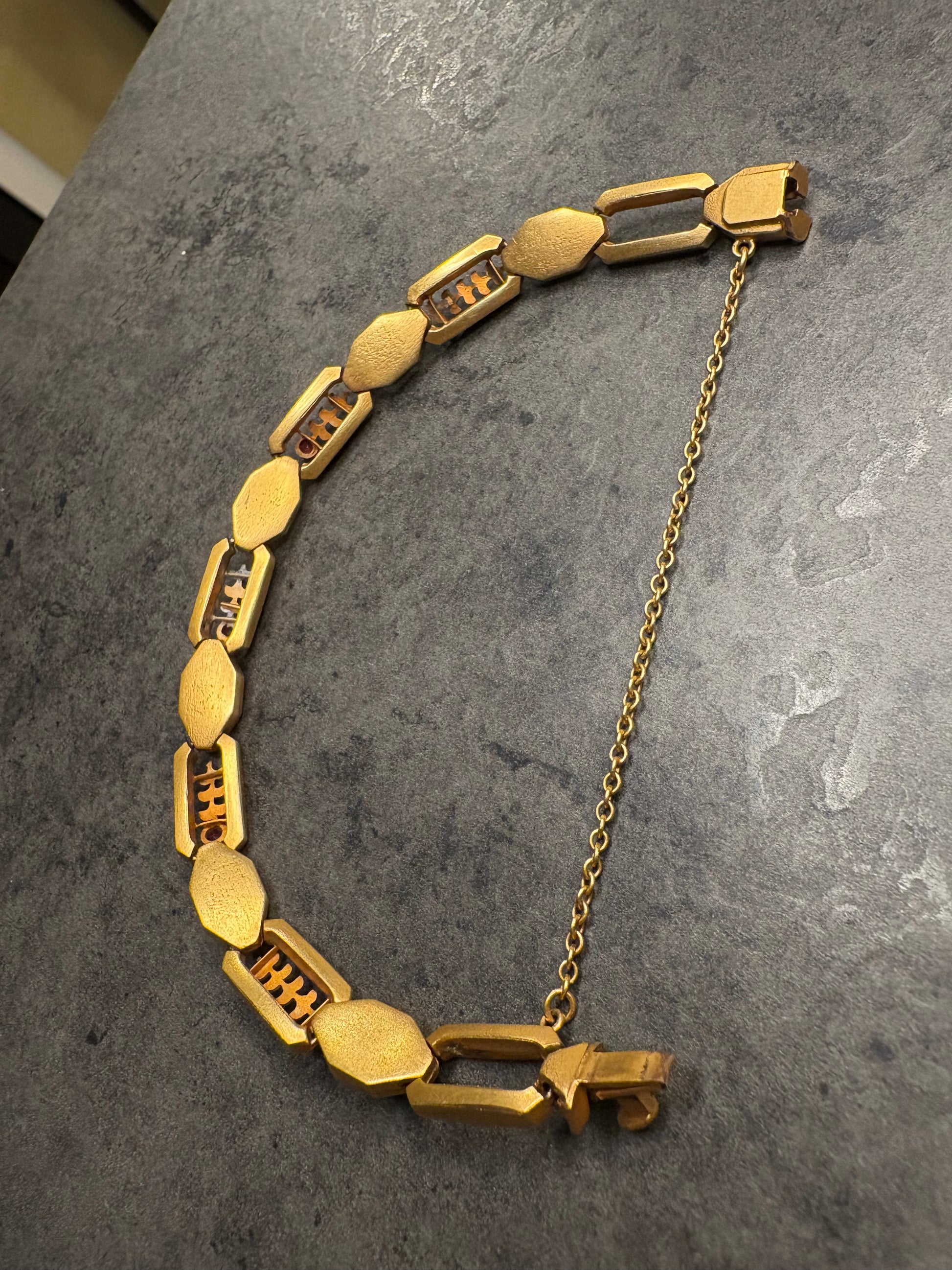 La chiusura è a scatto sicuro, completata da una catena di sicurezza, dettaglio tipico dei gioielli di pregio d’epoca, che ne sottolinea l’attenzione alla qualità e alla durata. La lunghezza complessiva è di circa 19 cm, una misura ideale per adattarsi comodamente al polso.