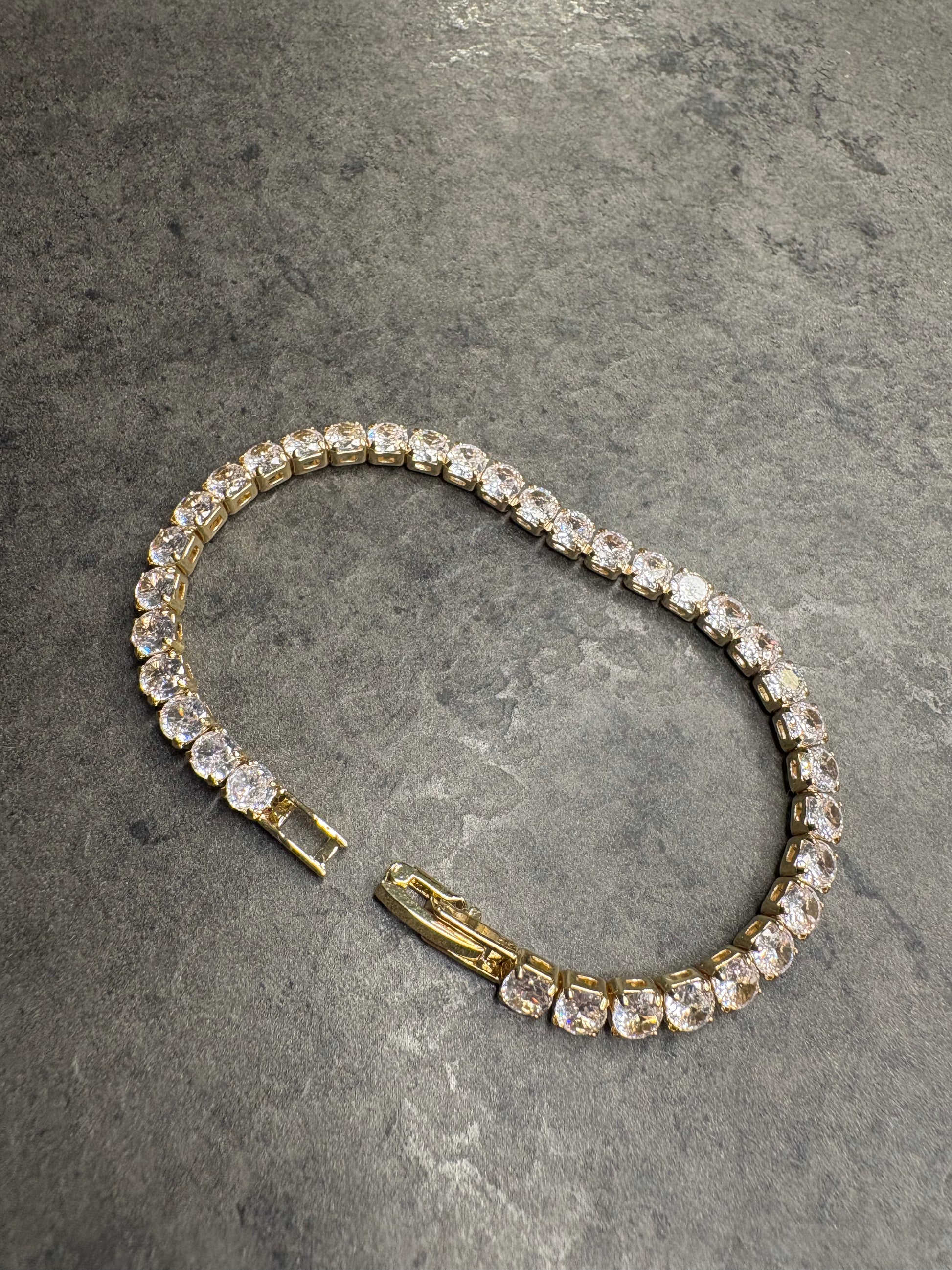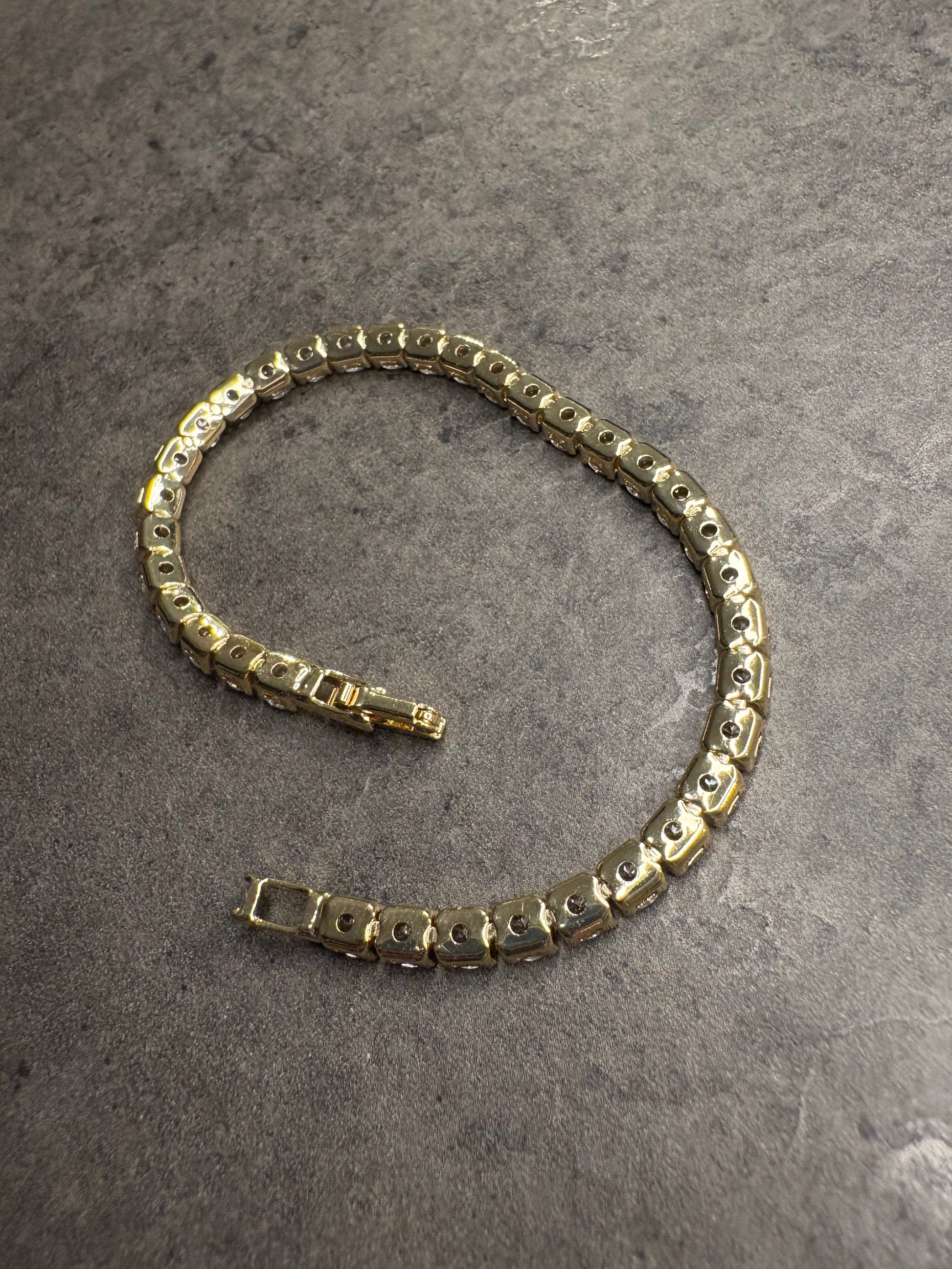 Elegante bracciale tennis, realizzato in metallo color oro lucido, caratterizzato da una fila continua di cristalli luminosi taglio brillante che donano un effetto raffinato e senza tempo. Ogni pietra è incastonata con cura in una montatura quadrata, creando un gioco di luce e riflessi ad ogni movimento. La chiusura a scatola con sicura laterale garantisce stabilità e comfort al polso.