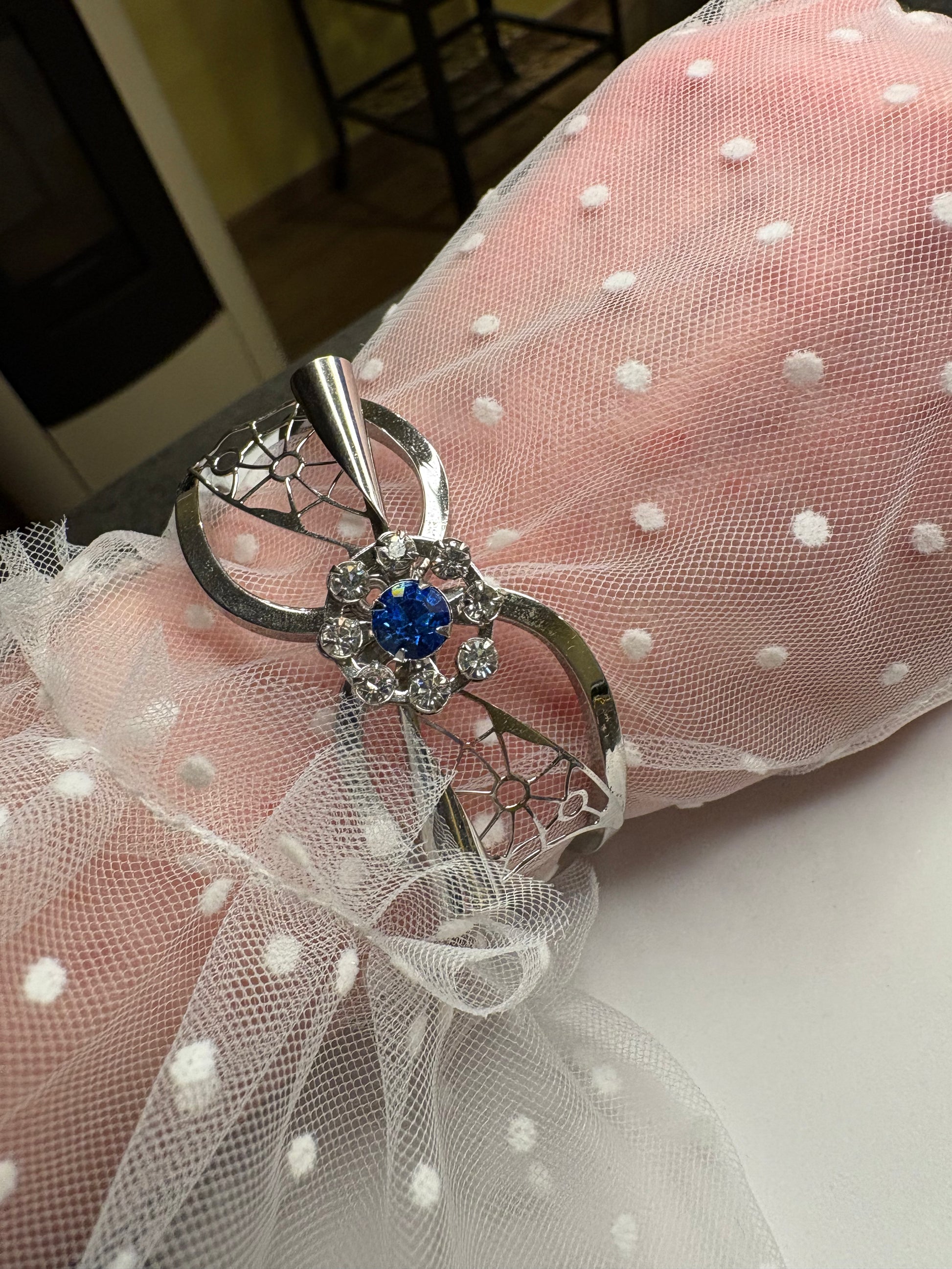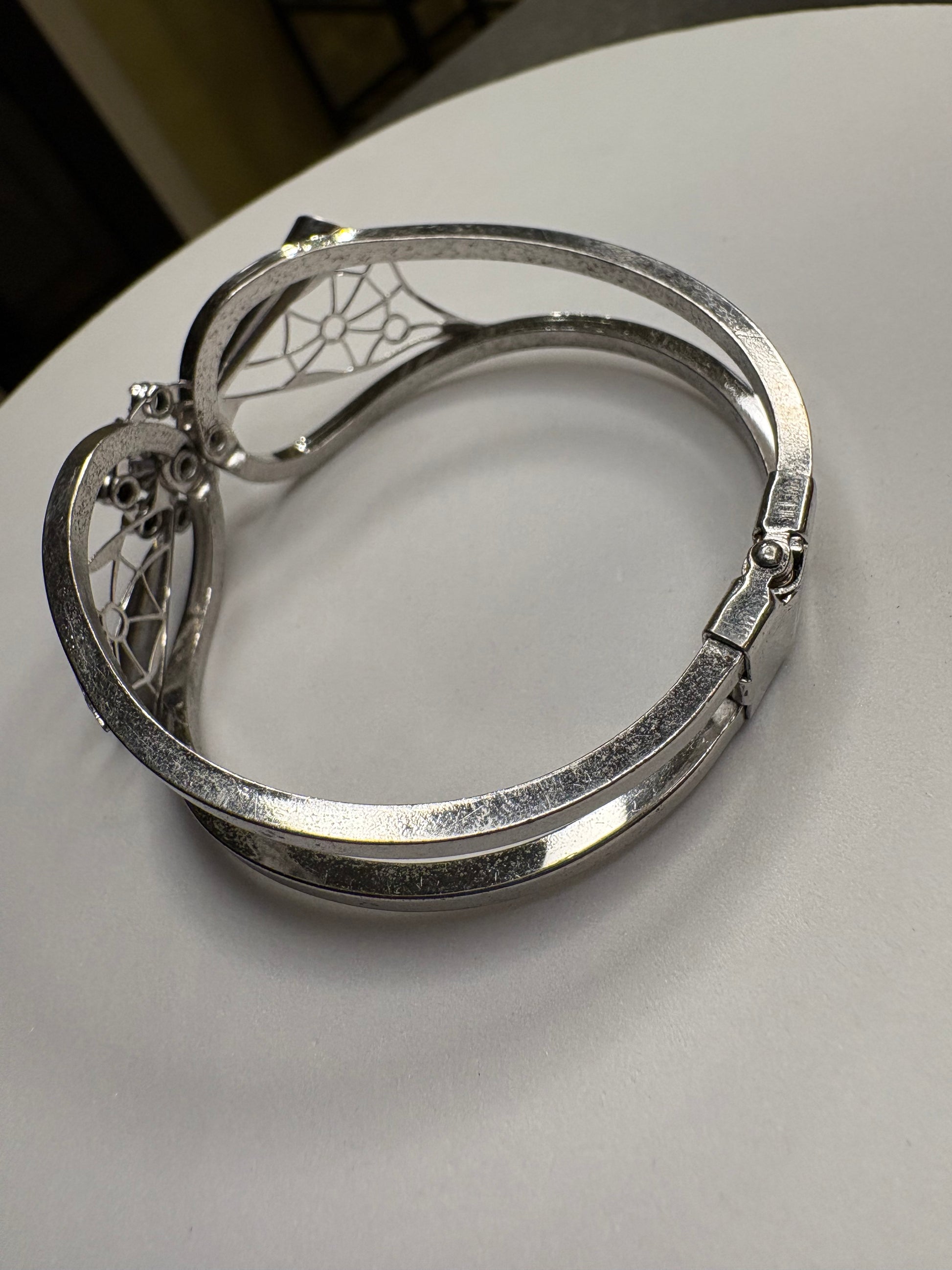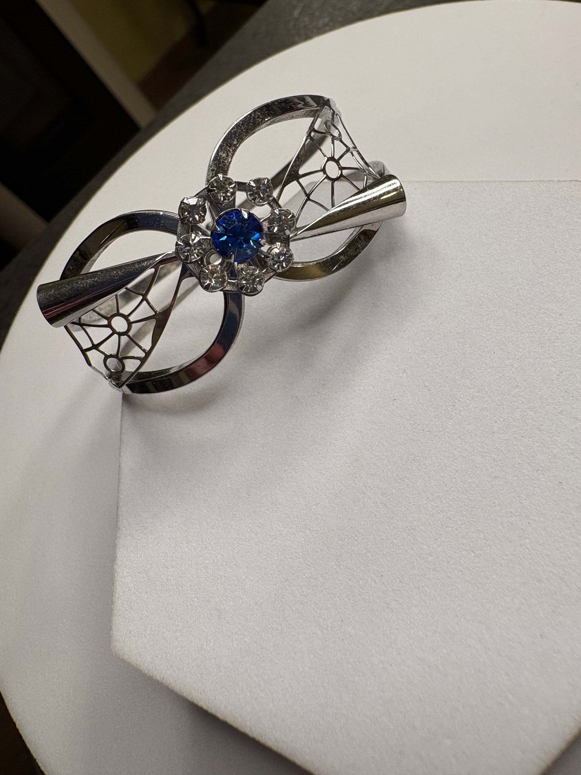 Bellissimo bracciale vintage rigido con apertura frontale, realizzato in metallo color argento lucido. La parte centrale è impreziosita da una raffinata lavorazione a traforo con delicato motivo floreale decorato da piccoli cristalli trasparenti luminosi. Al centro spicca un cristallo blu intenso di dimensione maggiore che dona profondità e carattere al gioiello. Elegante e femminile, perfetto sia per occasioni speciali che per impreziosire outfit quotidiani.