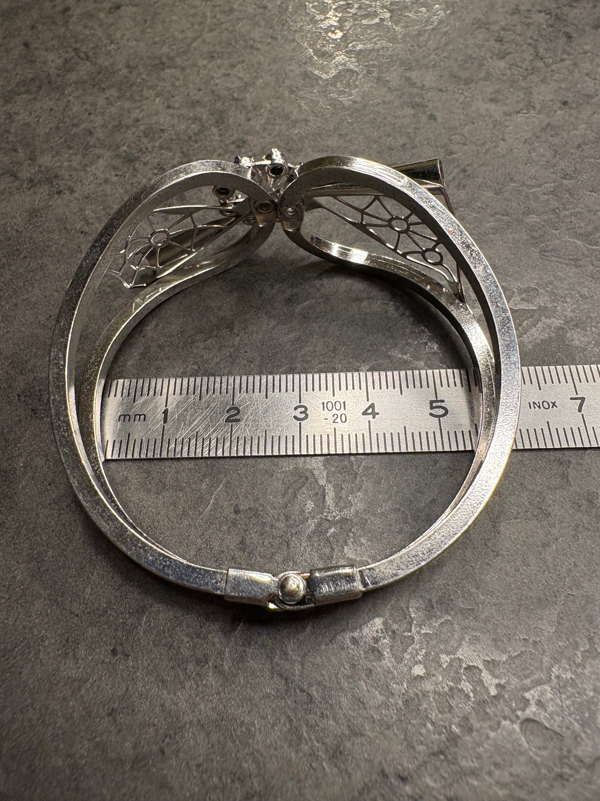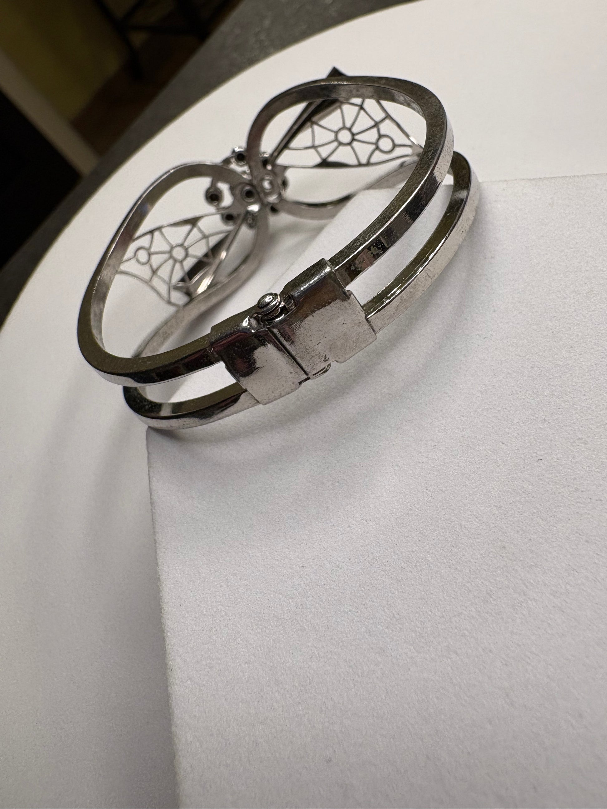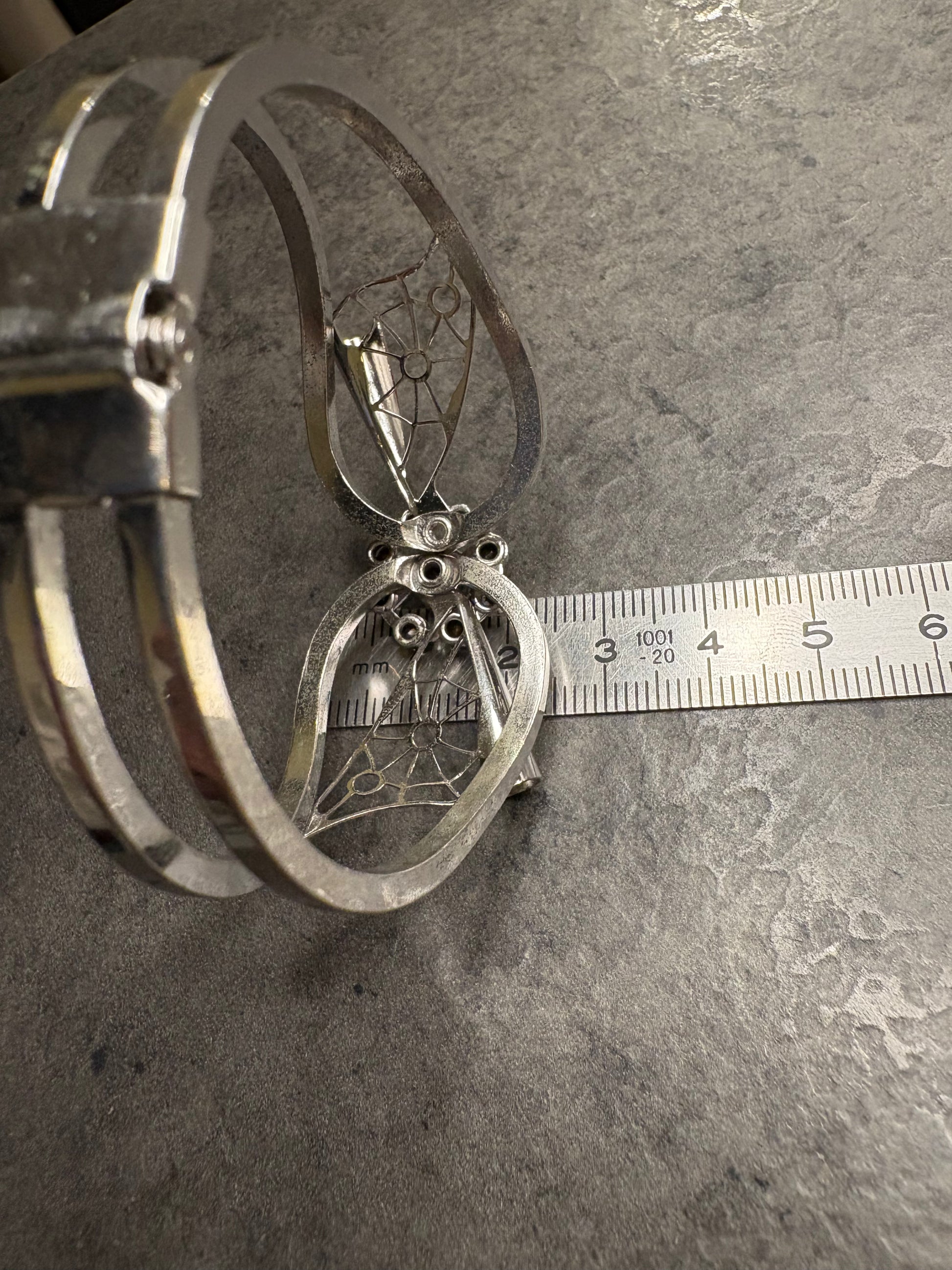Bellissimo bracciale vintage rigido con apertura frontale, realizzato in metallo color argento lucido. La parte centrale è impreziosita da una raffinata lavorazione a traforo con delicato motivo floreale decorato da piccoli cristalli trasparenti luminosi. Al centro spicca un cristallo blu intenso di dimensione maggiore che dona profondità e carattere al gioiello. Elegante e femminile, perfetto sia per occasioni speciali che per impreziosire outfit quotidiani.