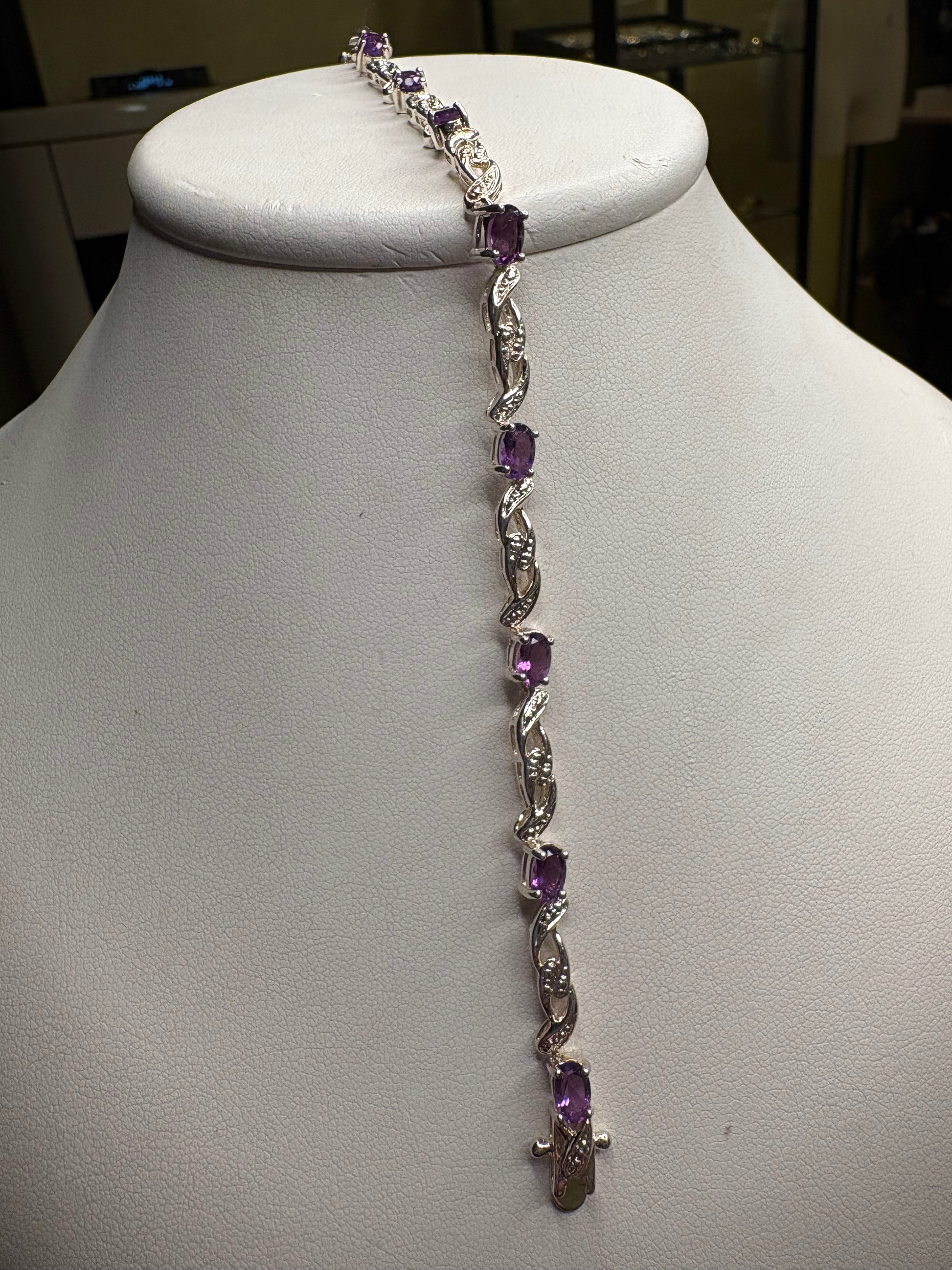 Elegante bracciale vintage realizzato in metallo argentato, impreziosito da una sequenza di cristalli lilla-viola, alternati a maglie intrecciate decorate. Il design raffinato e armonioso richiama lo stile classico dei gioielli degli anni ’80-’90, con un gioco di luci e riflessi che esalta la luminosità delle pietre. La chiusura a scomparsa con doppia sicurezza ne garantisce stabilità e comfort al polso. Un accessorio dal fascino romantico e sofisticato, perfetto per completare look eleganti o da sera.