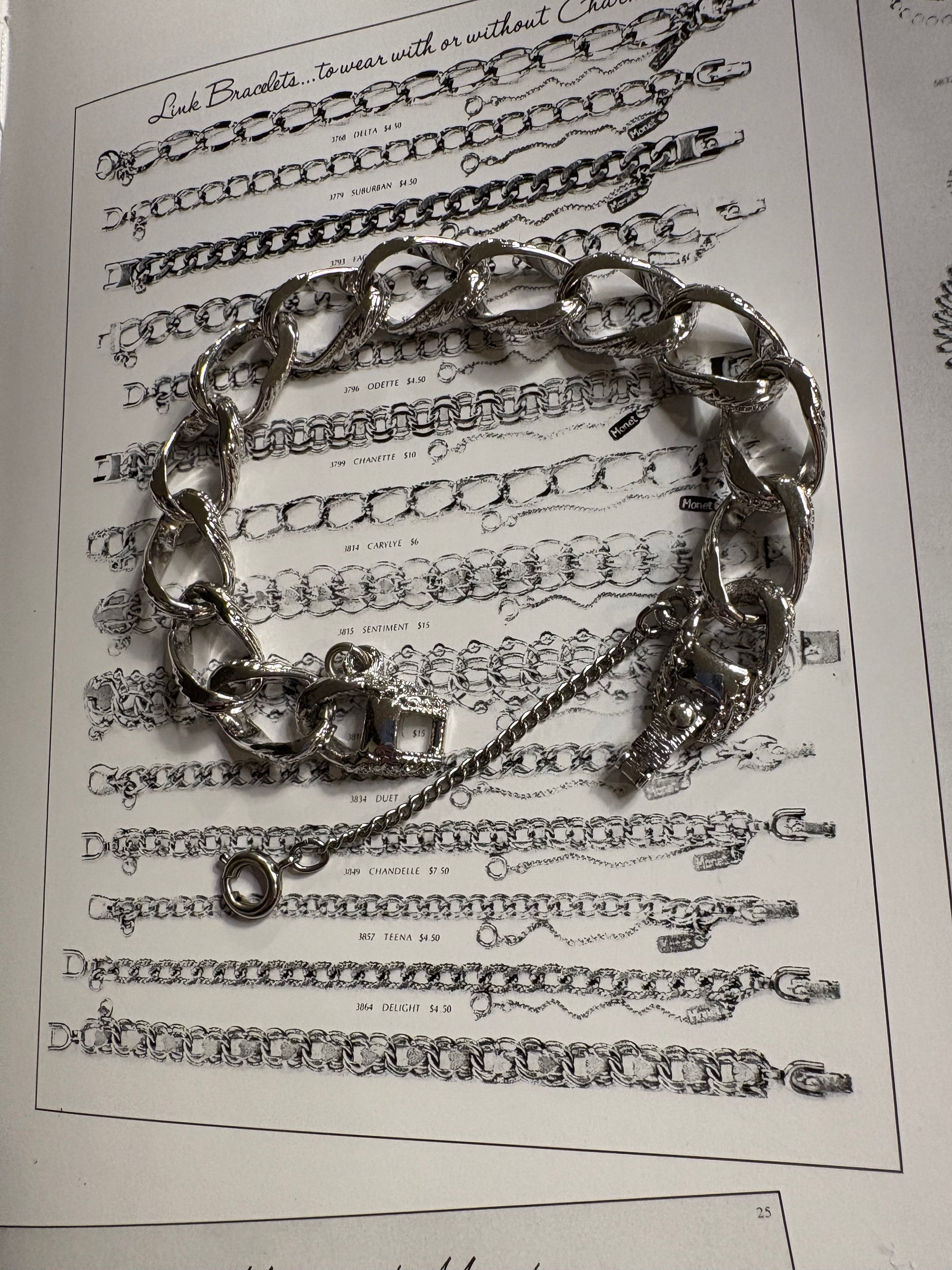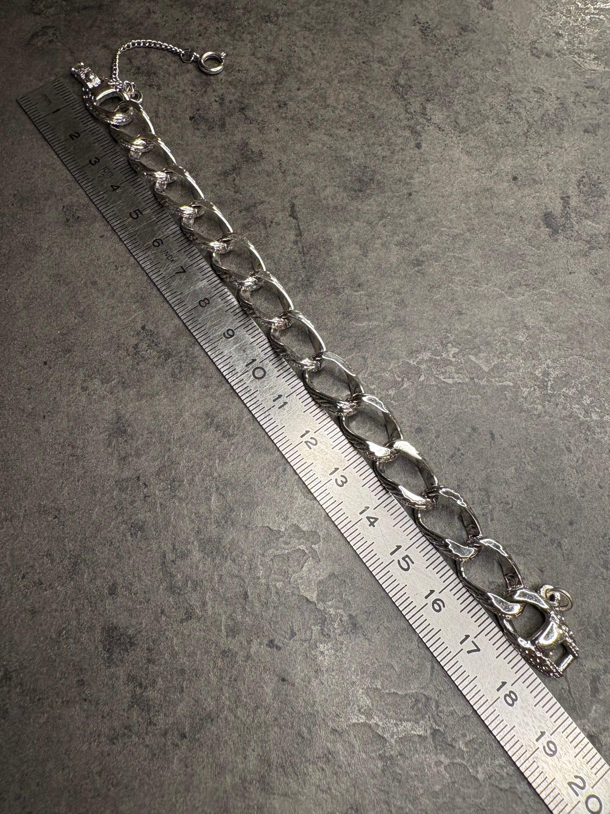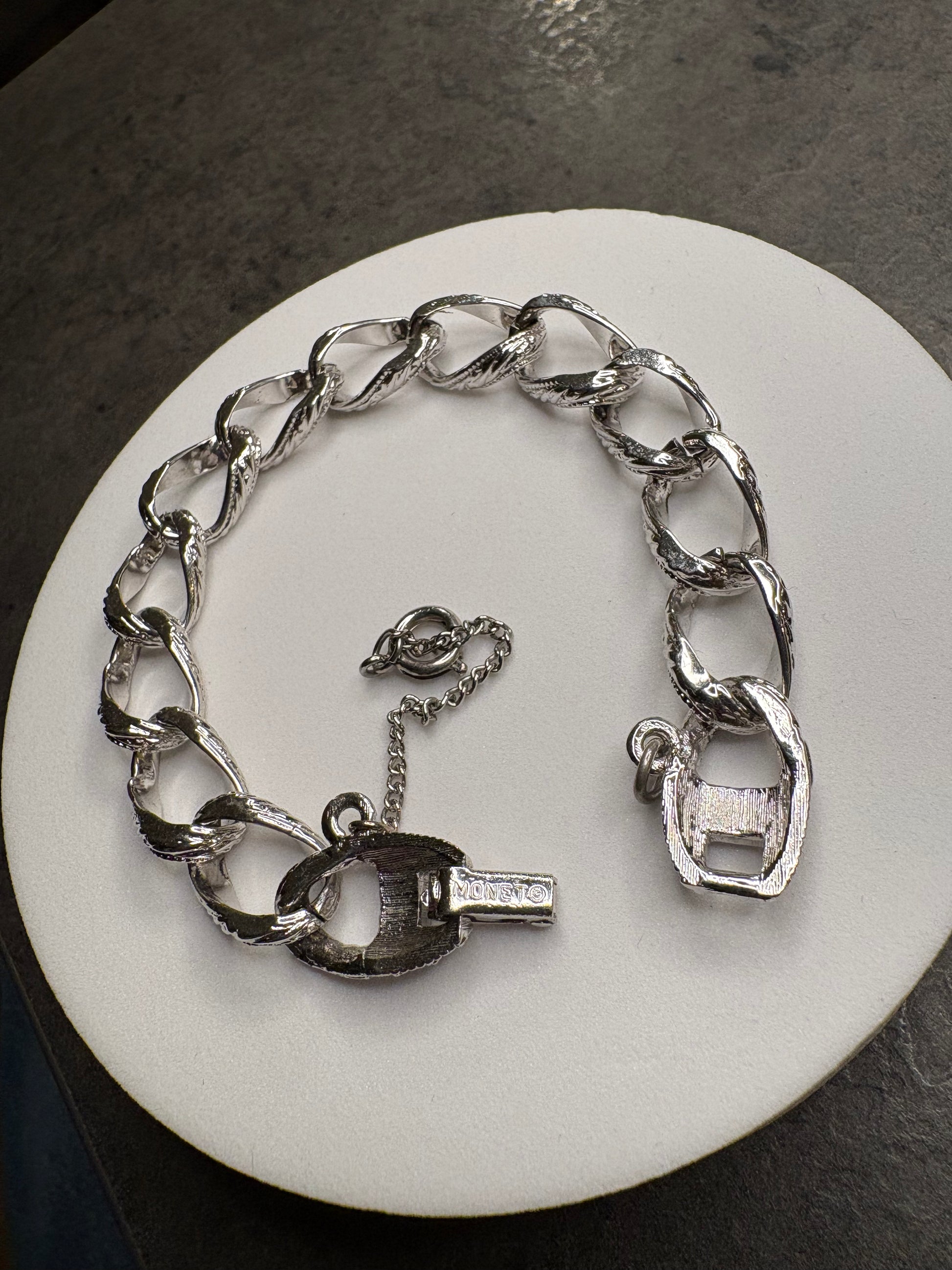 Questo splendido bracciale vintage firmato Monet si distingue per il suo design deciso ed elegante, tipico della maison americana. Realizzato in metallo argentato di alta qualità, presenta una catena a maglie importanti e sinuose, finemente lavorate con una texture leggermente incisa che dona profondità e riflessi luminosi alla superficie. Le maglie, robuste ma armoniose, creano un effetto scultoreo al polso, esprimendo uno stile sofisticato e senza tempo. La chiusura è solida e ben strutturata, arricchita dalla catena di sicurezza, dettaglio prezioso che unisce funzionalità e raffinatezza, garantendo comfort e tranquillità nell’indosso. Un gioiello di grande carattere, perfetto per chi ama il vintage di qualità e desidera un accessorio iconico, capace di valorizzare sia look eleganti che più contemporanei.