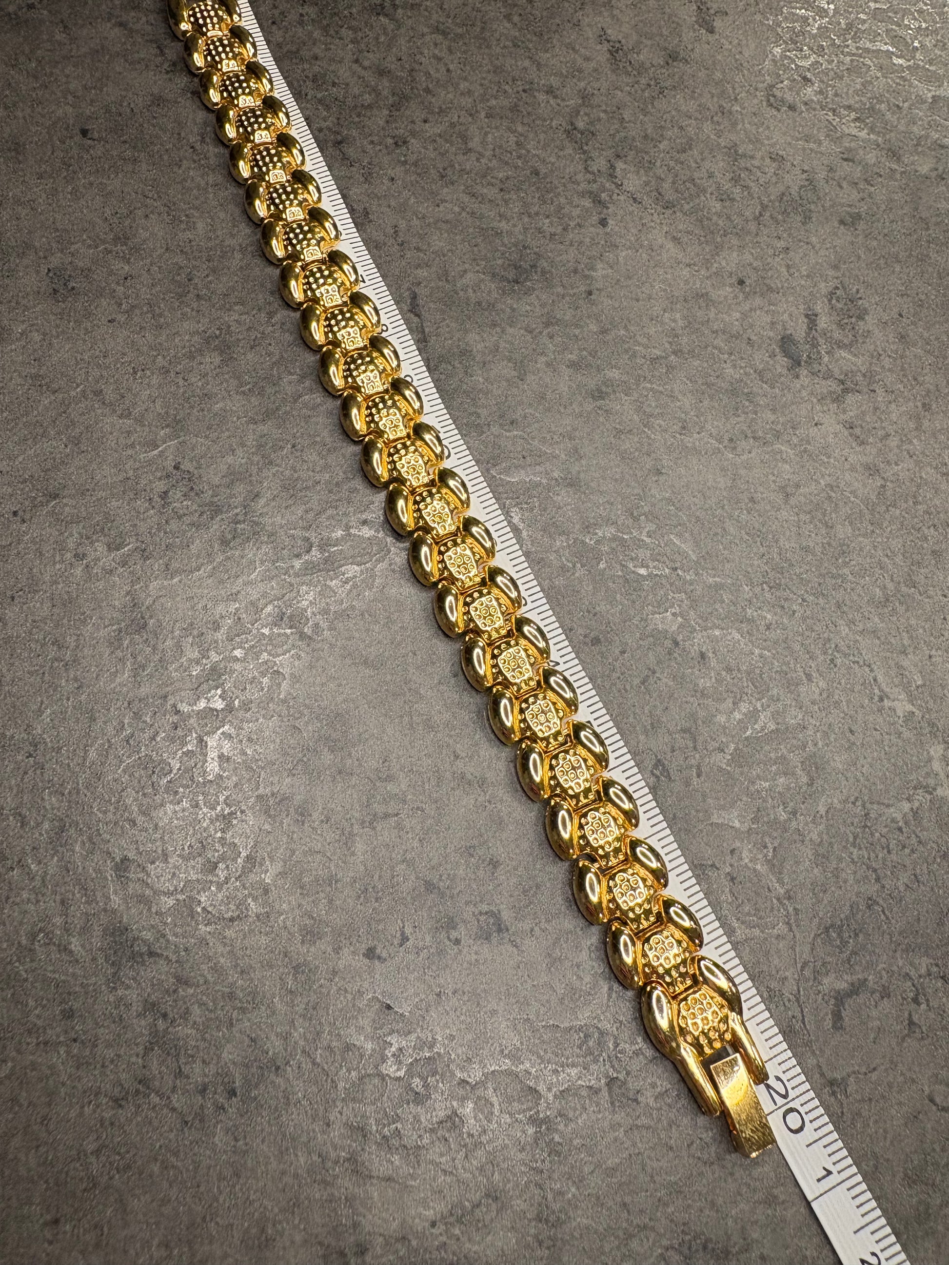 Bracciale vintage in metallo color oro, lungo circa 20,2 cm. Realizzato con una raffinata maglia doppia e bombata che alterna elementi lisci e punzonati, crea un elegante gioco di luci e riflessi. La superficie dorata, lucida e ben conservata, dona luminosità e un tocco di classe, mentre la struttura articolata ne assicura una vestibilità morbida e confortevole. Un gioiello dallo stile deciso e sofisticato, perfetto per completare con eleganza sia un look quotidiano che un outfit più ricercato.