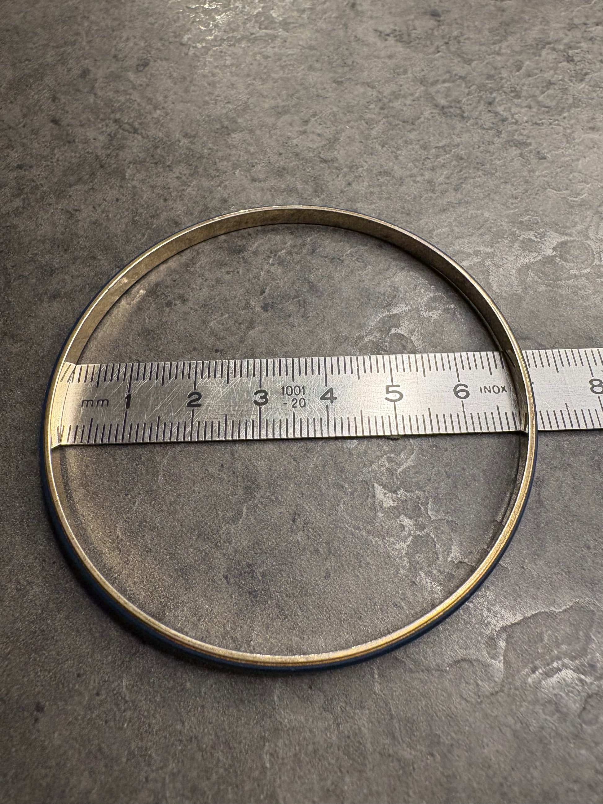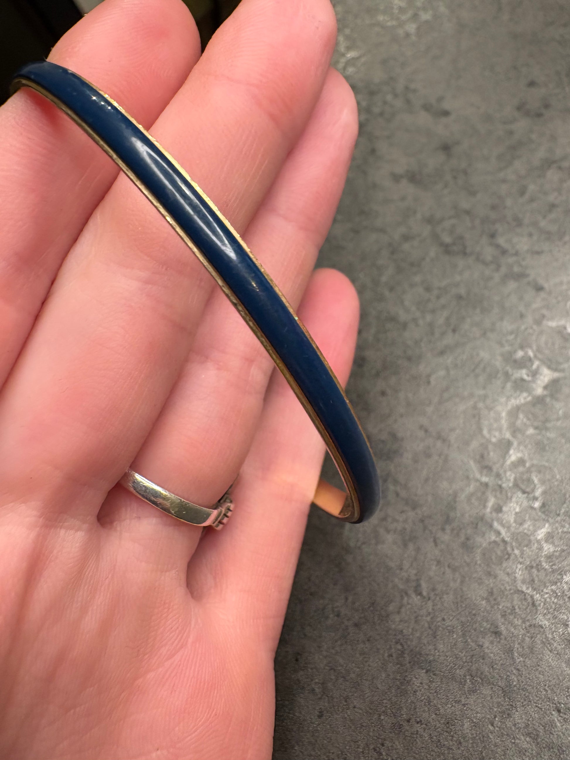 Delicato bracciale rigido vintage in metallo dorato con smalto blu intenso, dal design sobrio e raffinato.