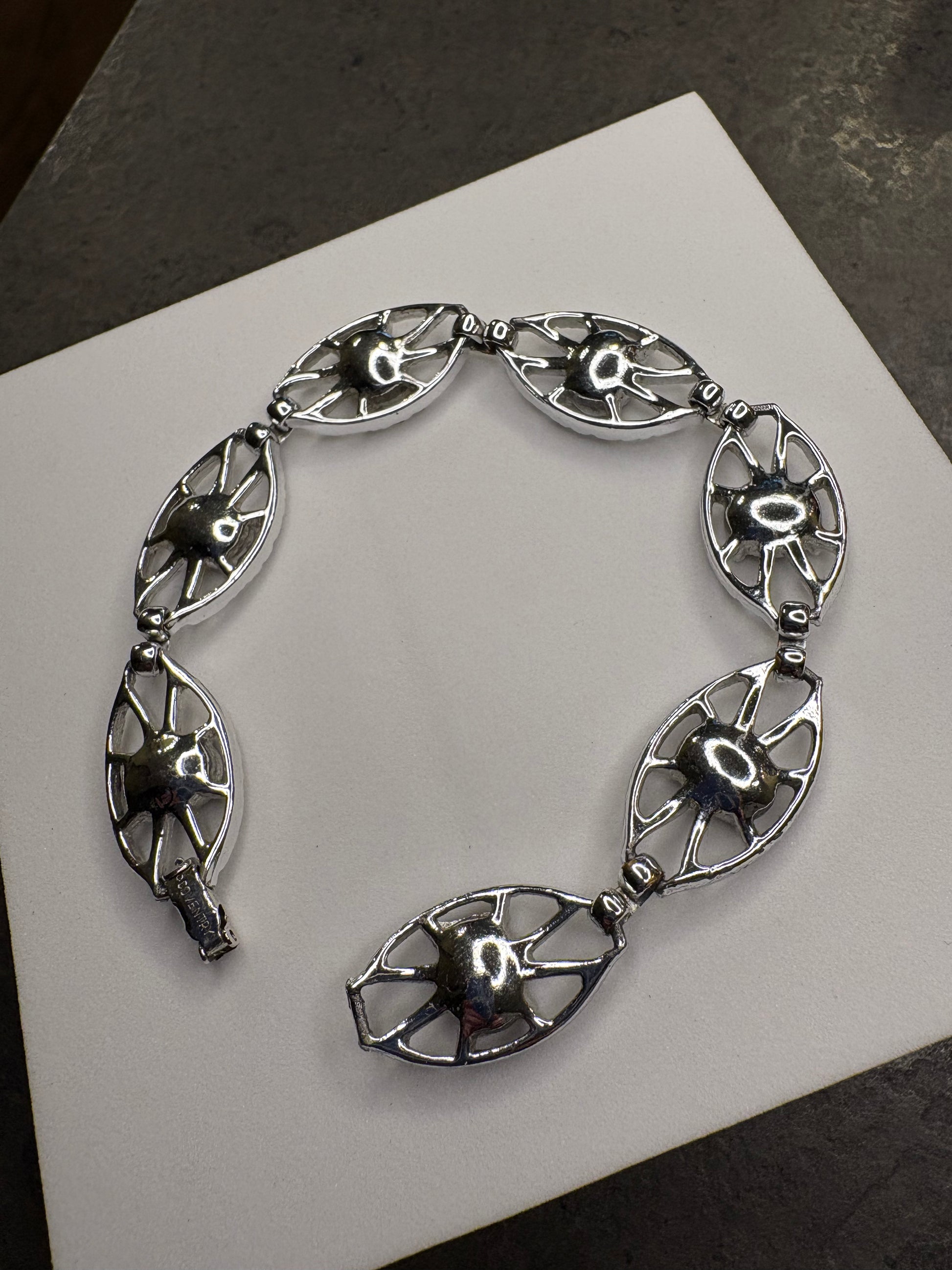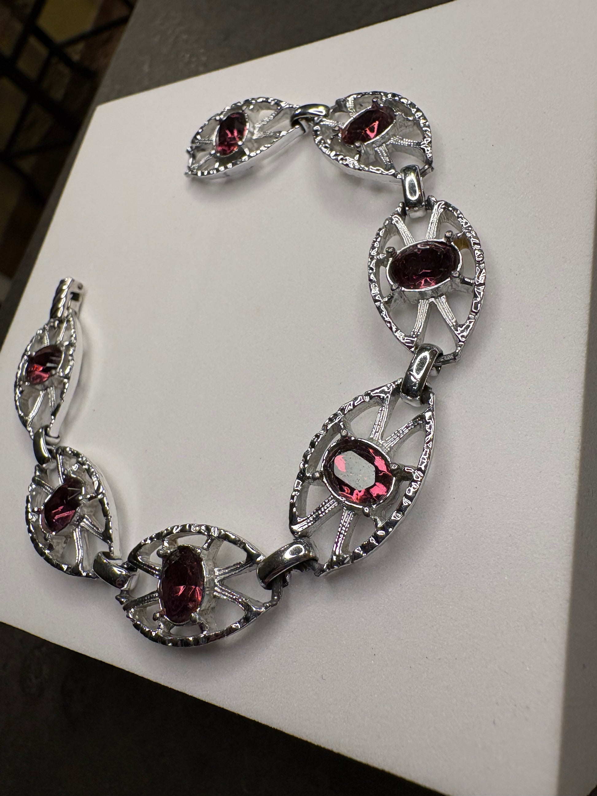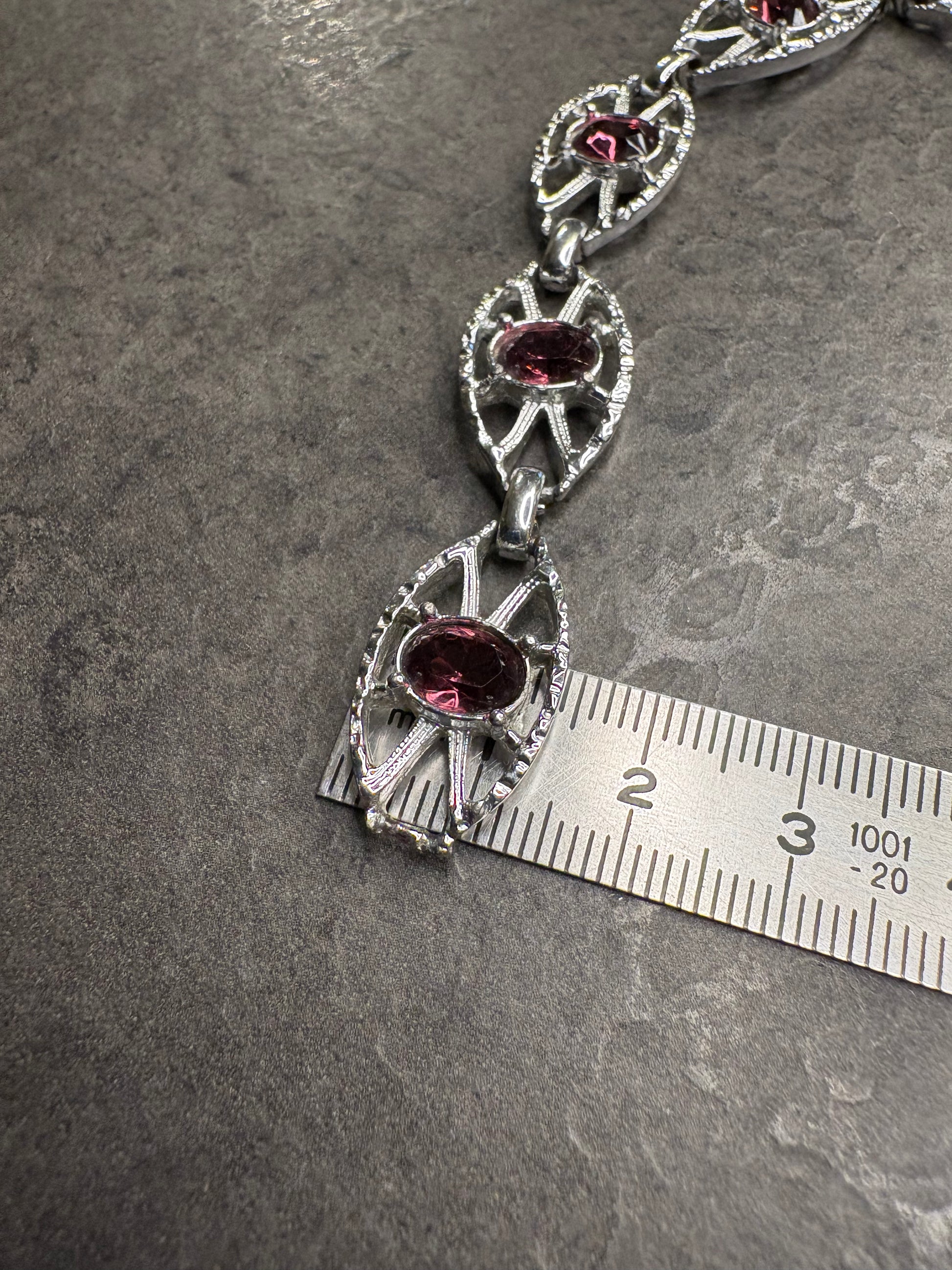 Splendido bracciale vintage Sarah Coventry della collezione “Mistique” del 1974, oggi molto raro e ricercato. Realizzato in metallo color argento, presenta una sequenza di maglie dalla forma allungata e traforata, ognuna impreziosita da un cristallo viola sfaccettato che dona profondità e un raffinato gioco di luce.