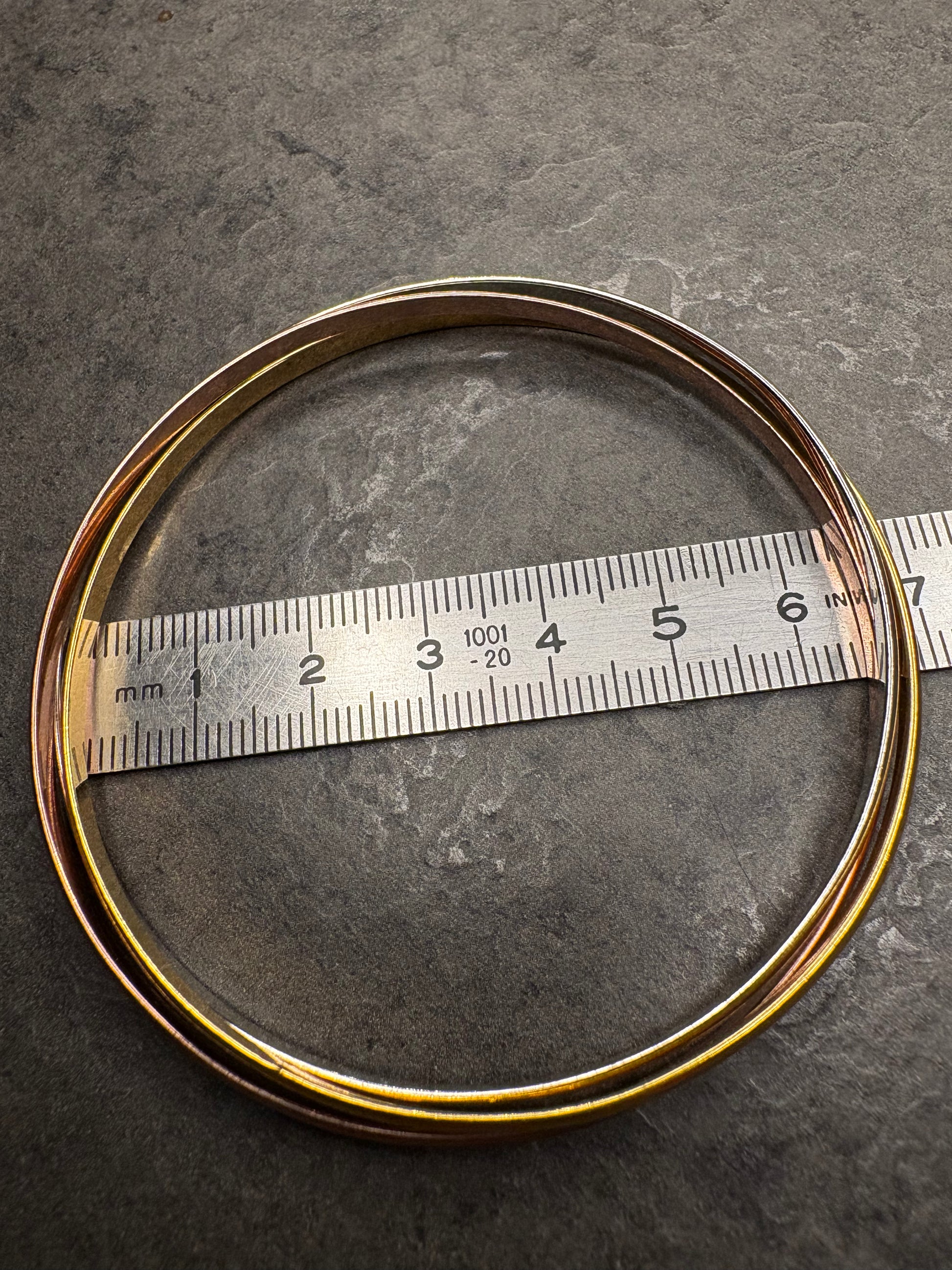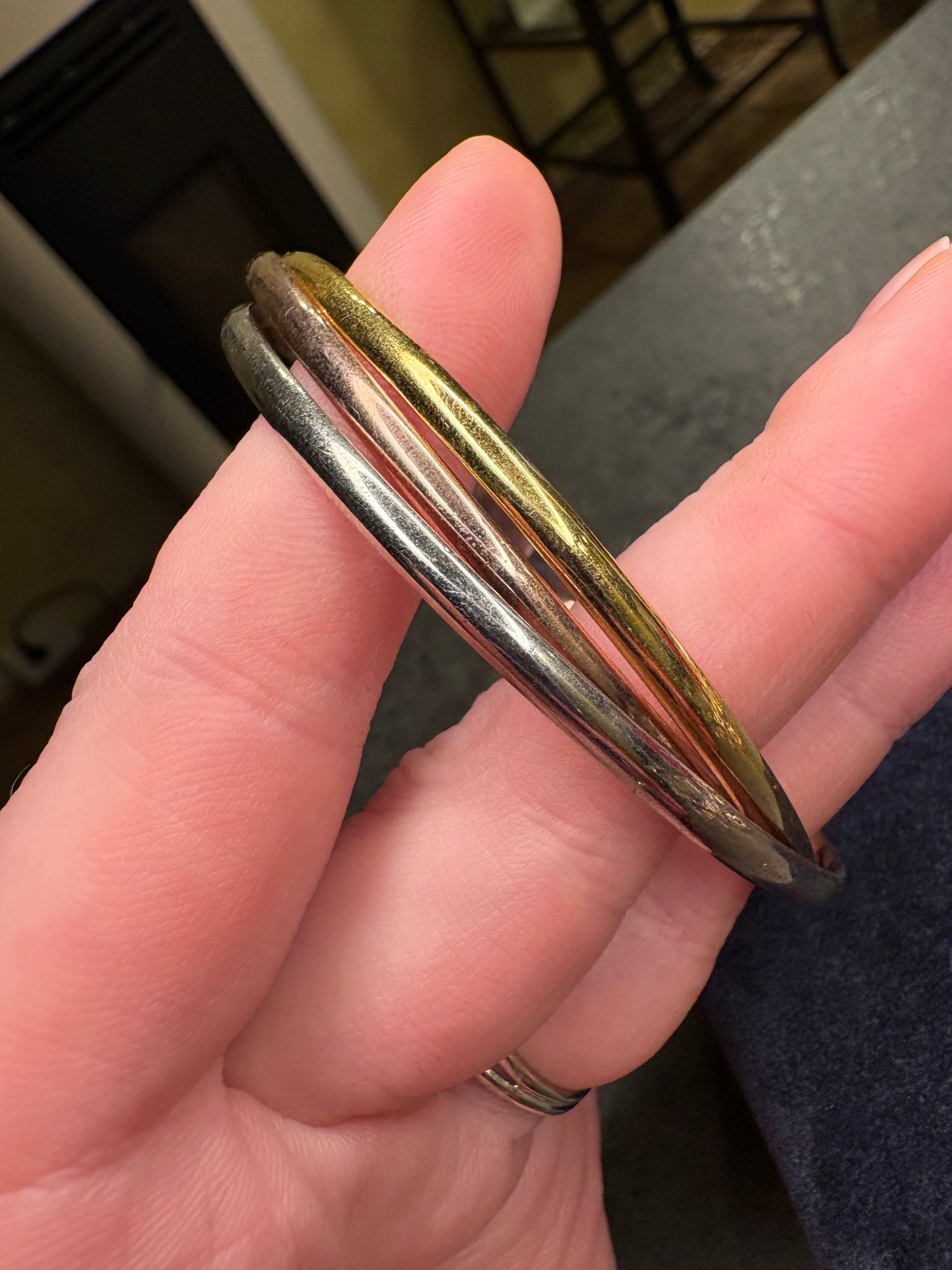 Composto da tre bracciali rigidi sottili e perfettamente armonizzati, ognuno con una differente finitura metallica — oro caldo, argento luminoso e rame rosato —, che si muovono insieme creando un delicato intreccio fluido al polso.