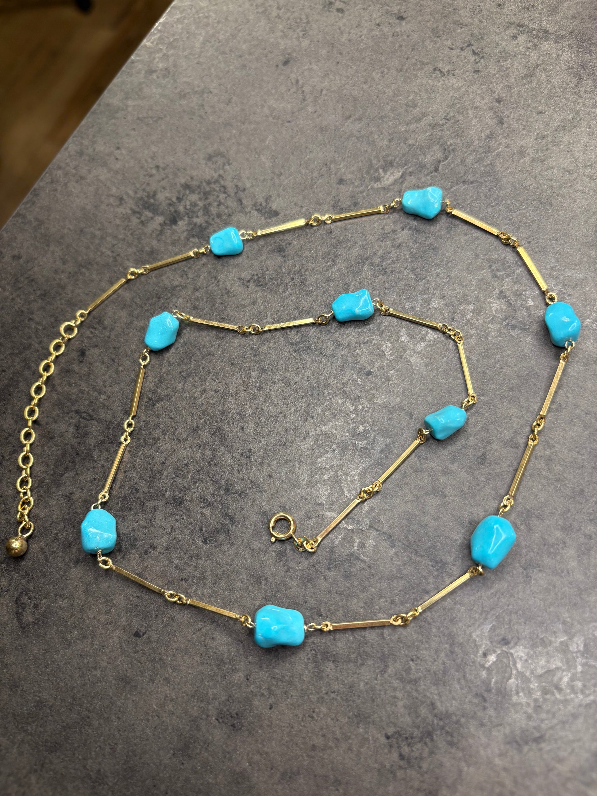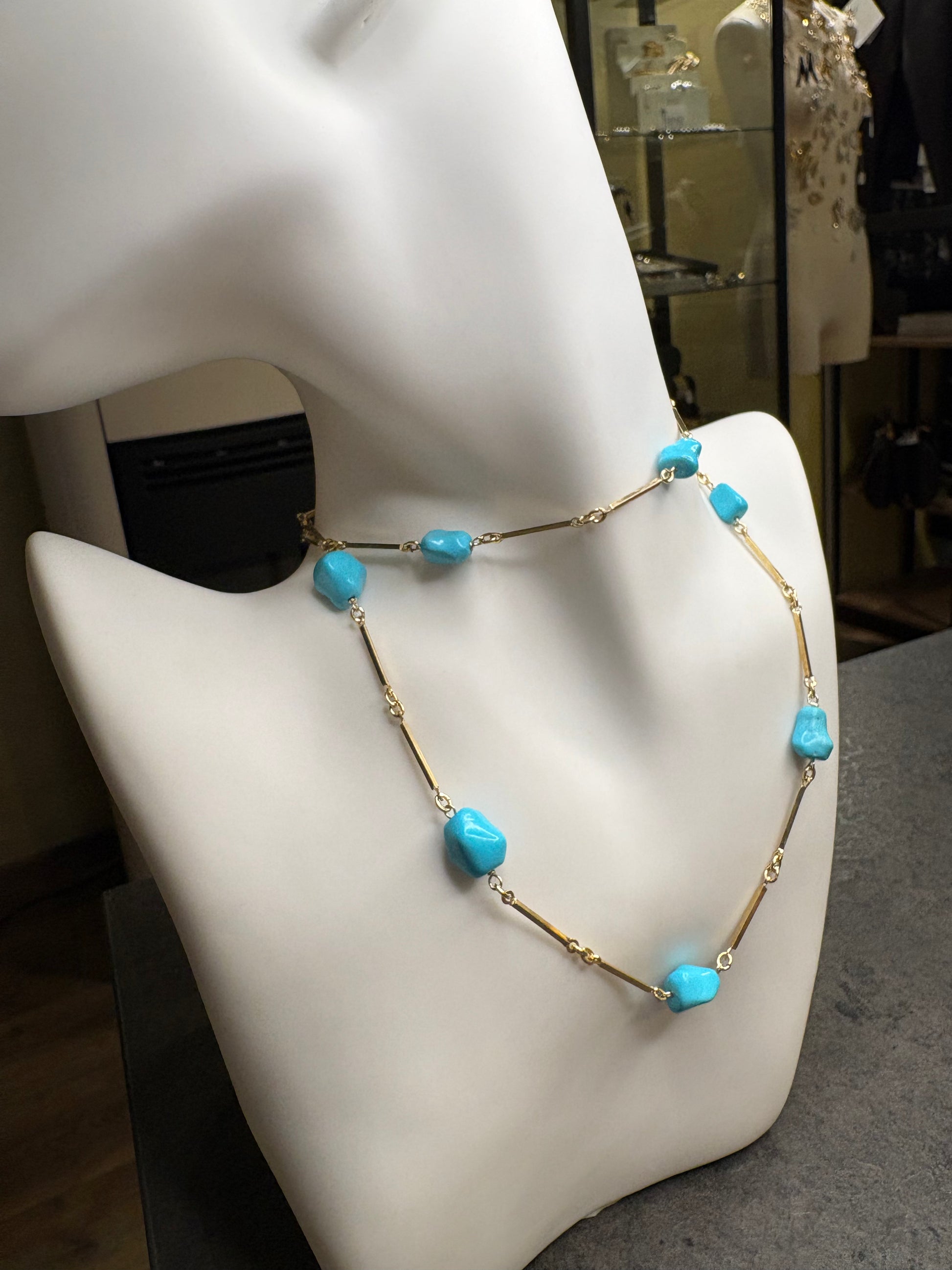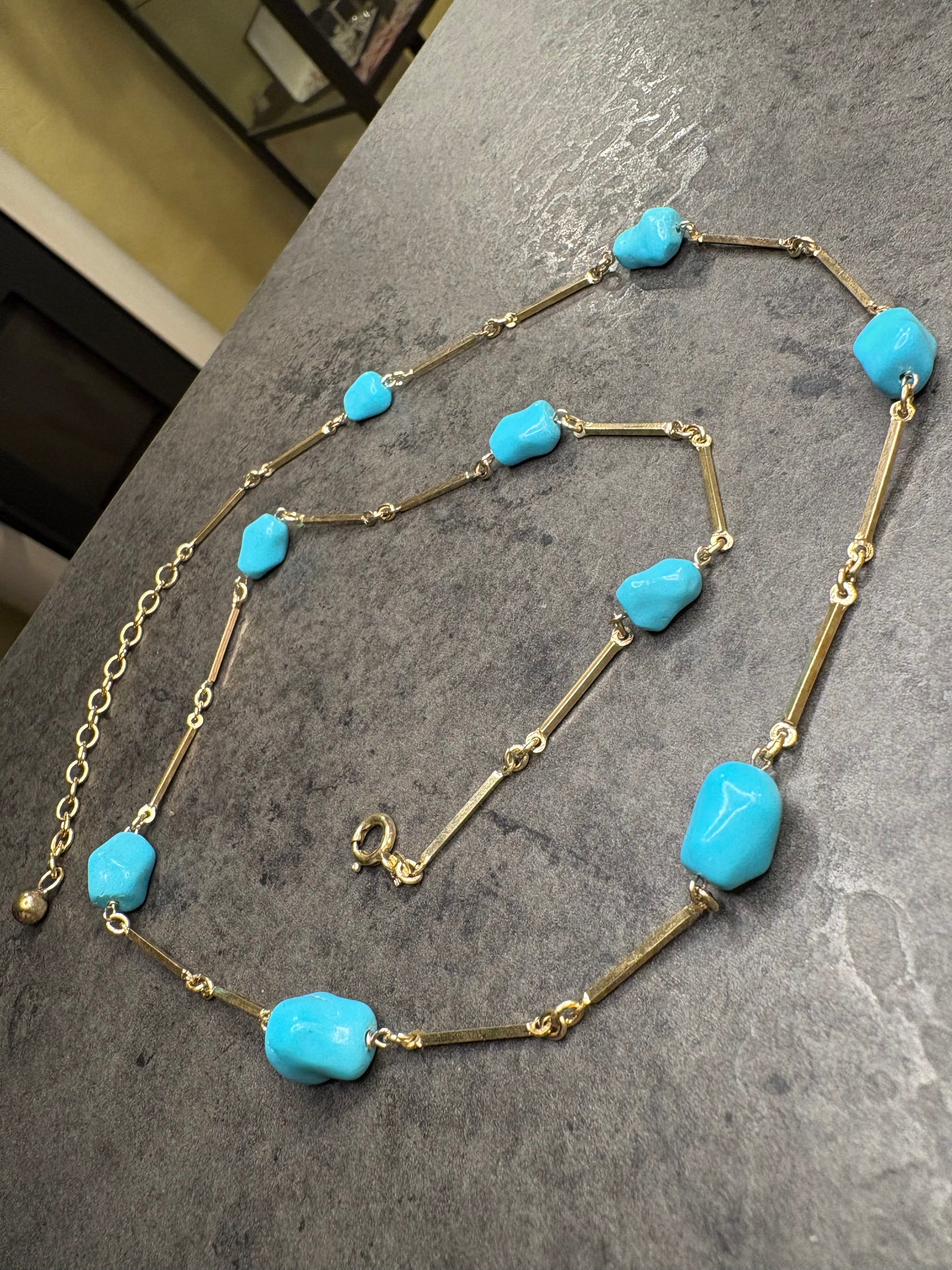 Raffinata collana vintage realizzata in metallo dorato Amerikaner, impreziosita da splendide pietre irregolari color turchese, probabilmente autentiche o in pasta vitrea di alta qualità.