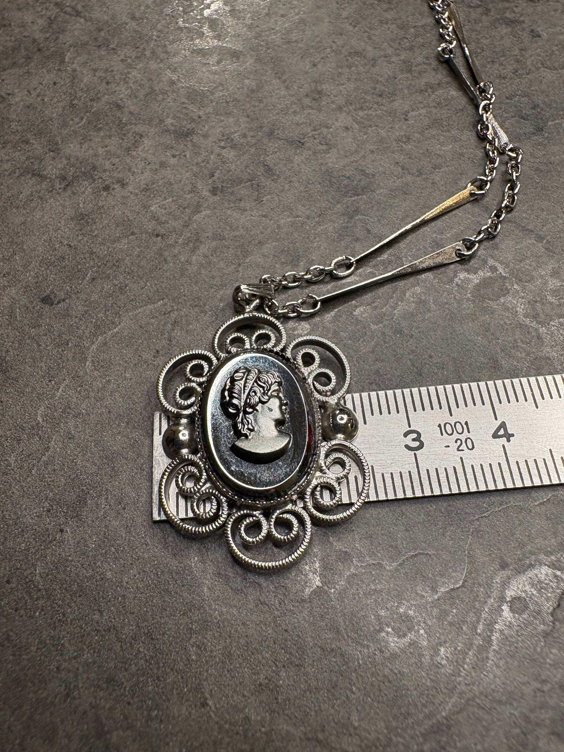 Elegante collana vintage caratterizzata da un cammeo centrale di forma ovale, raffigurante un profilo femminile in stile classico su fondo nero. Il cammeo è incastonato in una montatura in metallo color argento decorata da raffinati motivi a ricciolo e piccole sfere in rilievo, che donano equilibrio e leggerezza all’insieme.