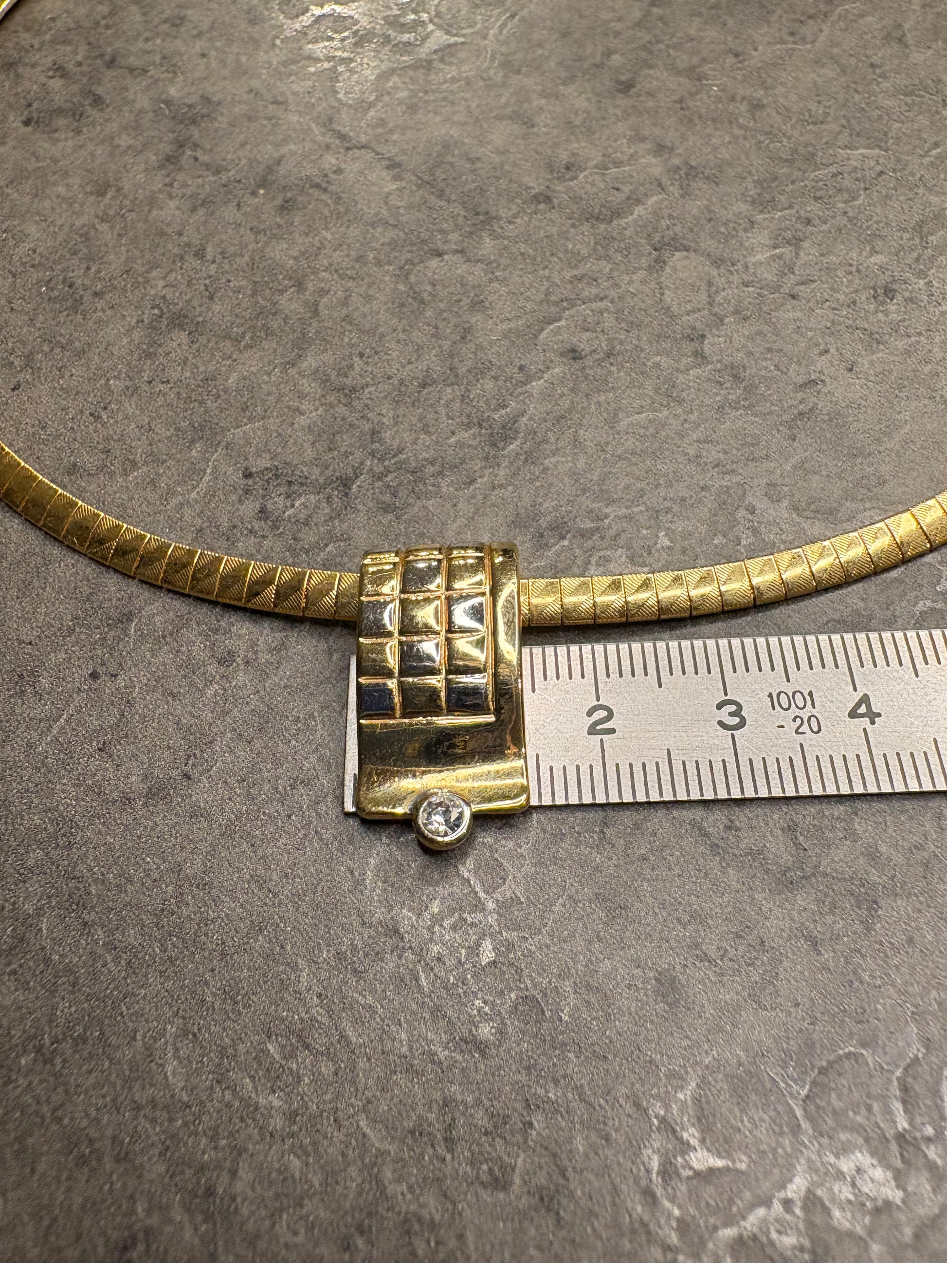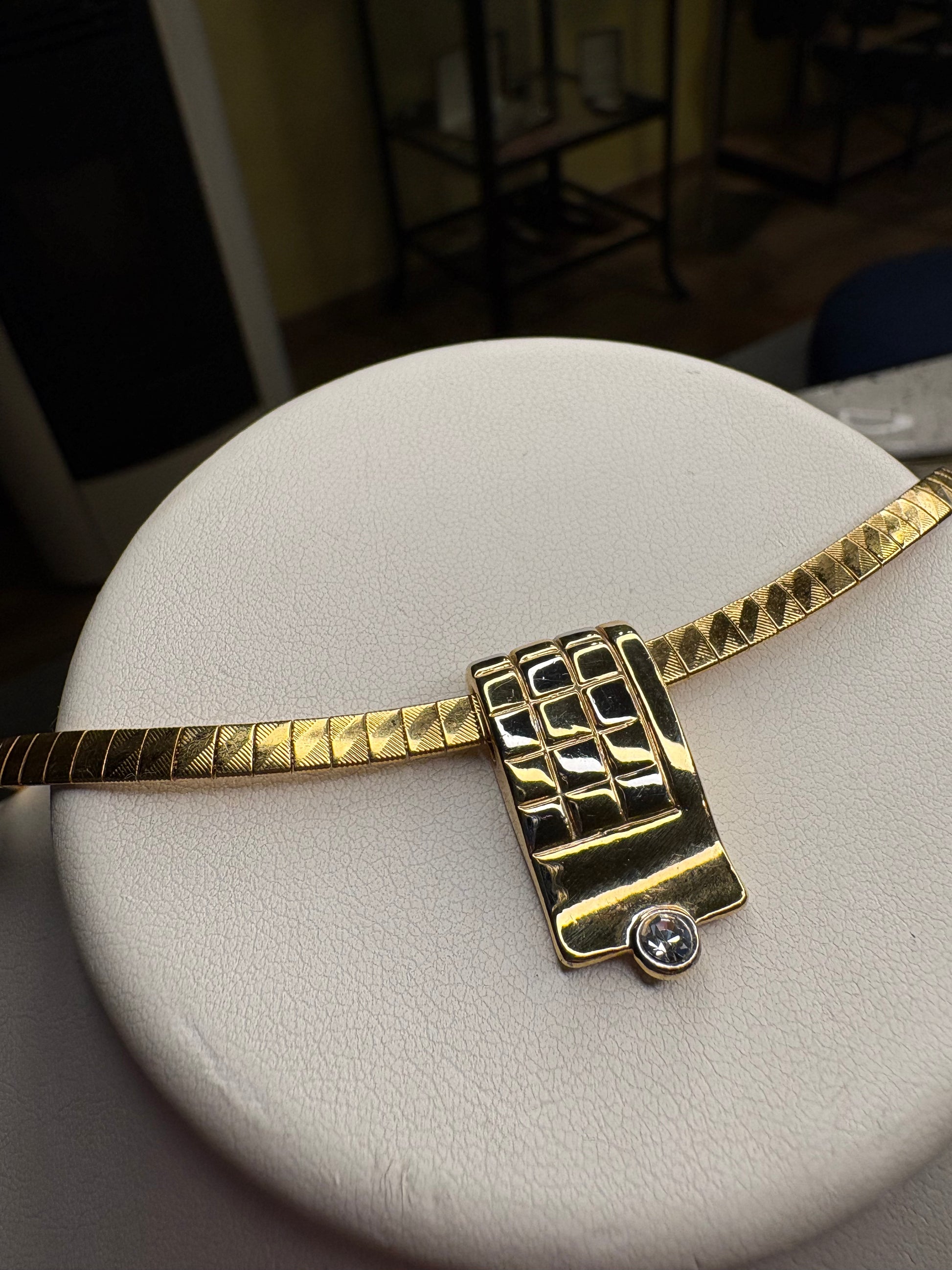Raffinata collana vintage lunga 44,5 cm, realizzata in metallo dorato lucido con lavorazione a maglia tubolare rigida dal fascino elegante e senza tempo.