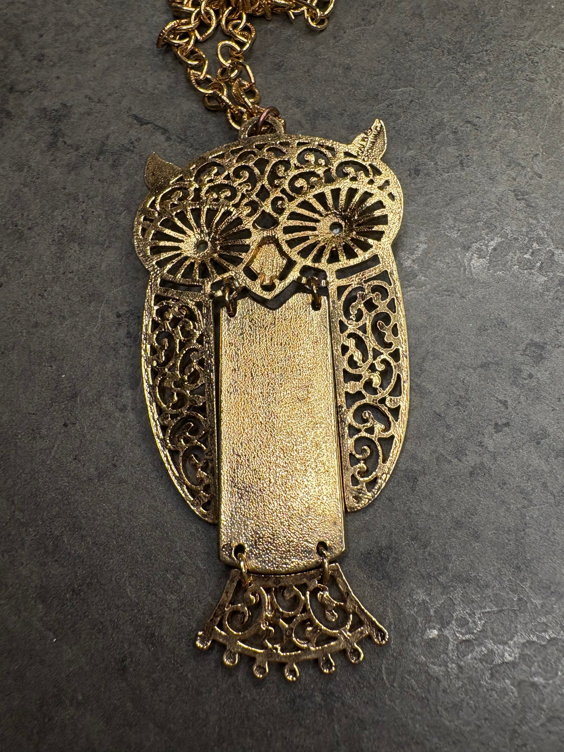 Magnifica collana vintage con grande pendente mobile a forma di gufo, simbolo di saggezza e mistero. Realizzata in metallo dorato lavorato a traforo, presenta un elaborato motivo decorativo che alterna rilievi e trame cesellate, donando profondità e luce al design.
