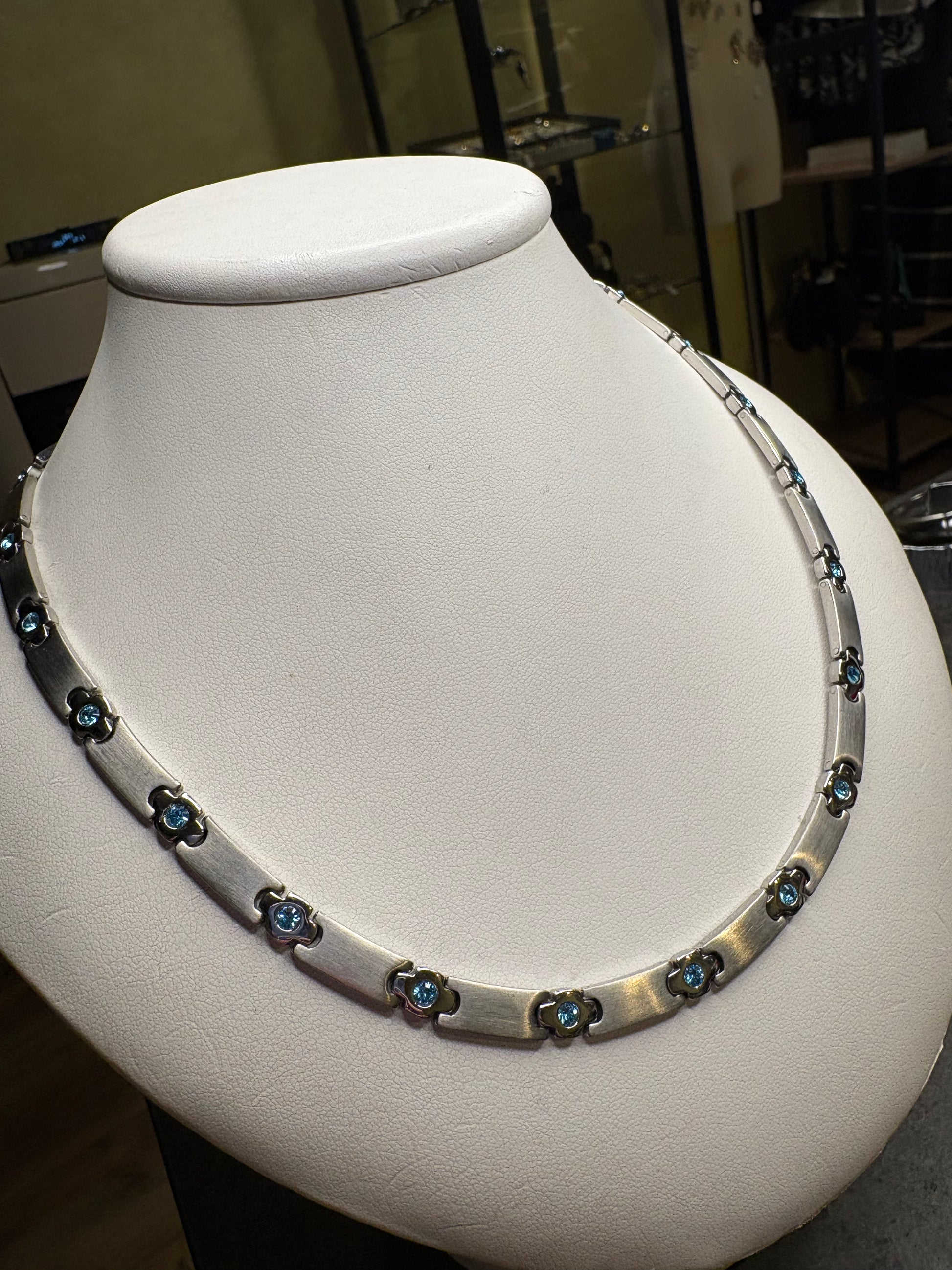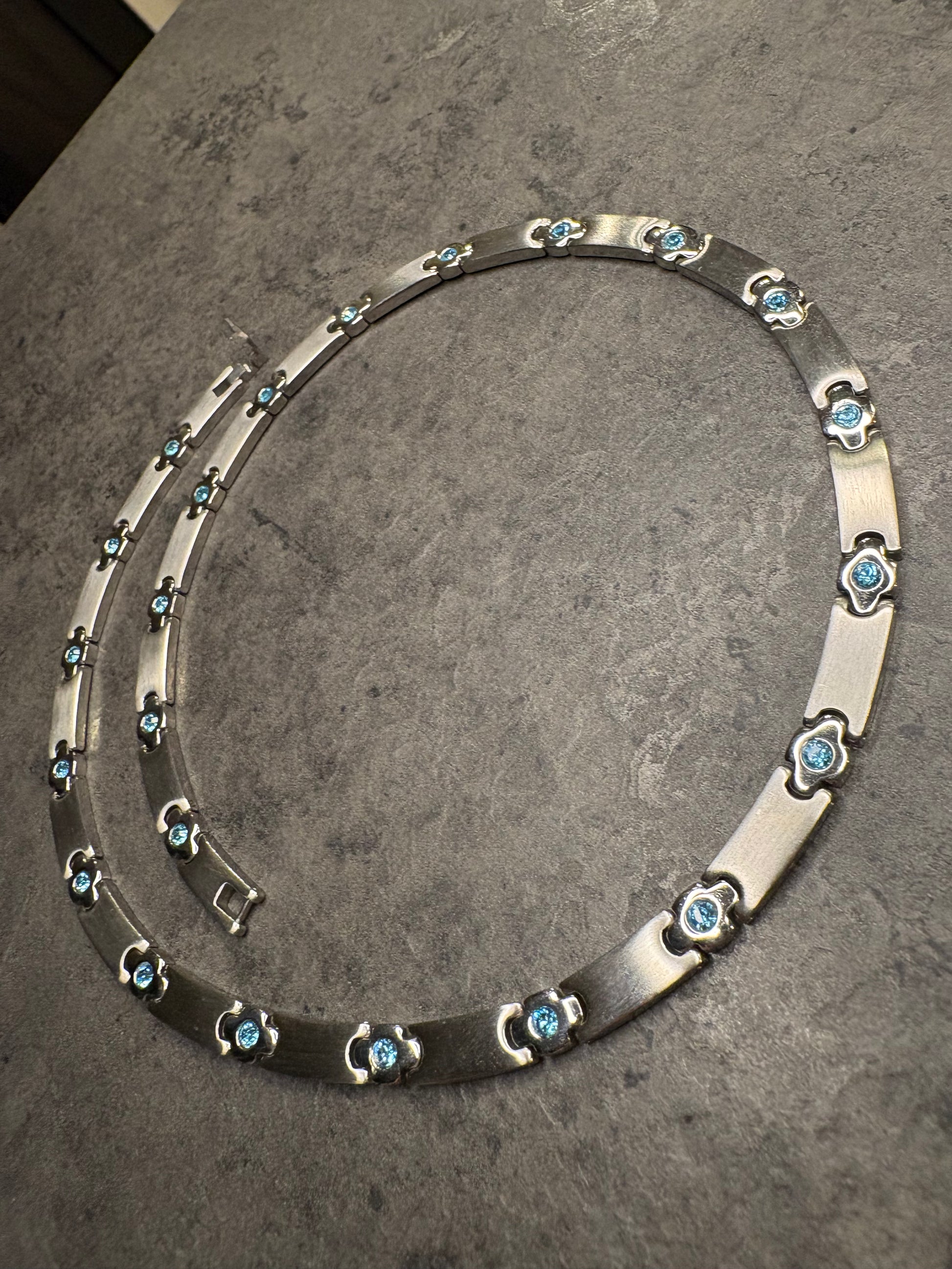 Collana in acciaio satinato lunga circa 47 cm, dal design moderno e lineare. È composta da maglie rettangolari leggermente curve, unite da piccoli elementi centrali a forma di croce, ciascuno impreziosito da un luminoso cristallo azzurro incastonato. La finitura opaca dell’acciaio crea un raffinato contrasto con la brillantezza delle pietre, donando alla collana un aspetto elegante ma contemporaneo. Un gioiello sobrio e versatile, perfetto per aggiungere un tocco di luce discreta a ogni outfit.