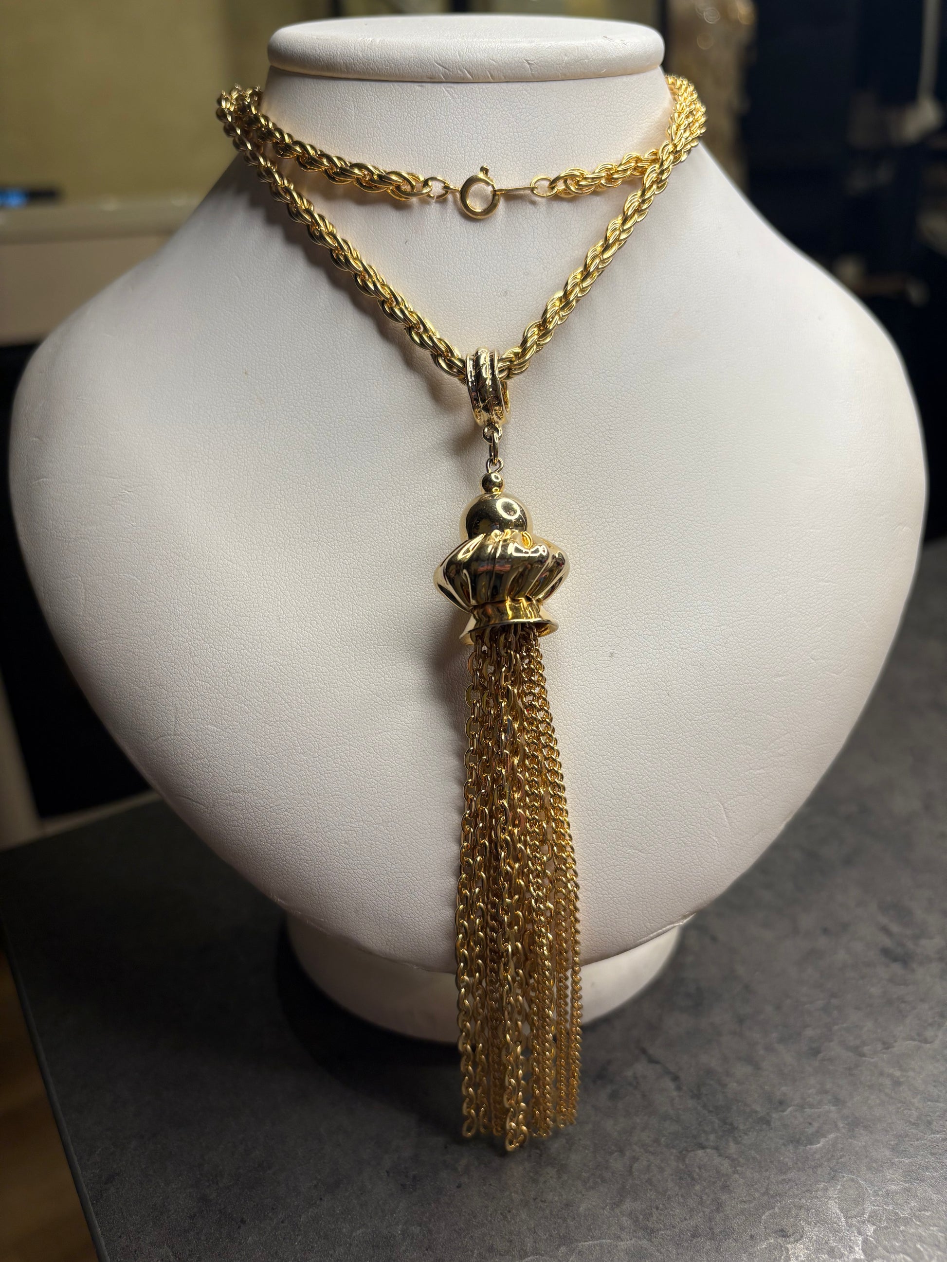 Raffinata collana vintage dorata, dal design elegante e senza tempo. La catena, lunga circa 62,5 cm, è realizzata con una maglia intrecciata che riflette splendidamente la luce. Il protagonista è il pendente a nappa, lungo circa 14 cm, composto da una parte superiore bombata e lucente, seguita da una cascata di sottili catene che creano un effetto fluido e sofisticato.