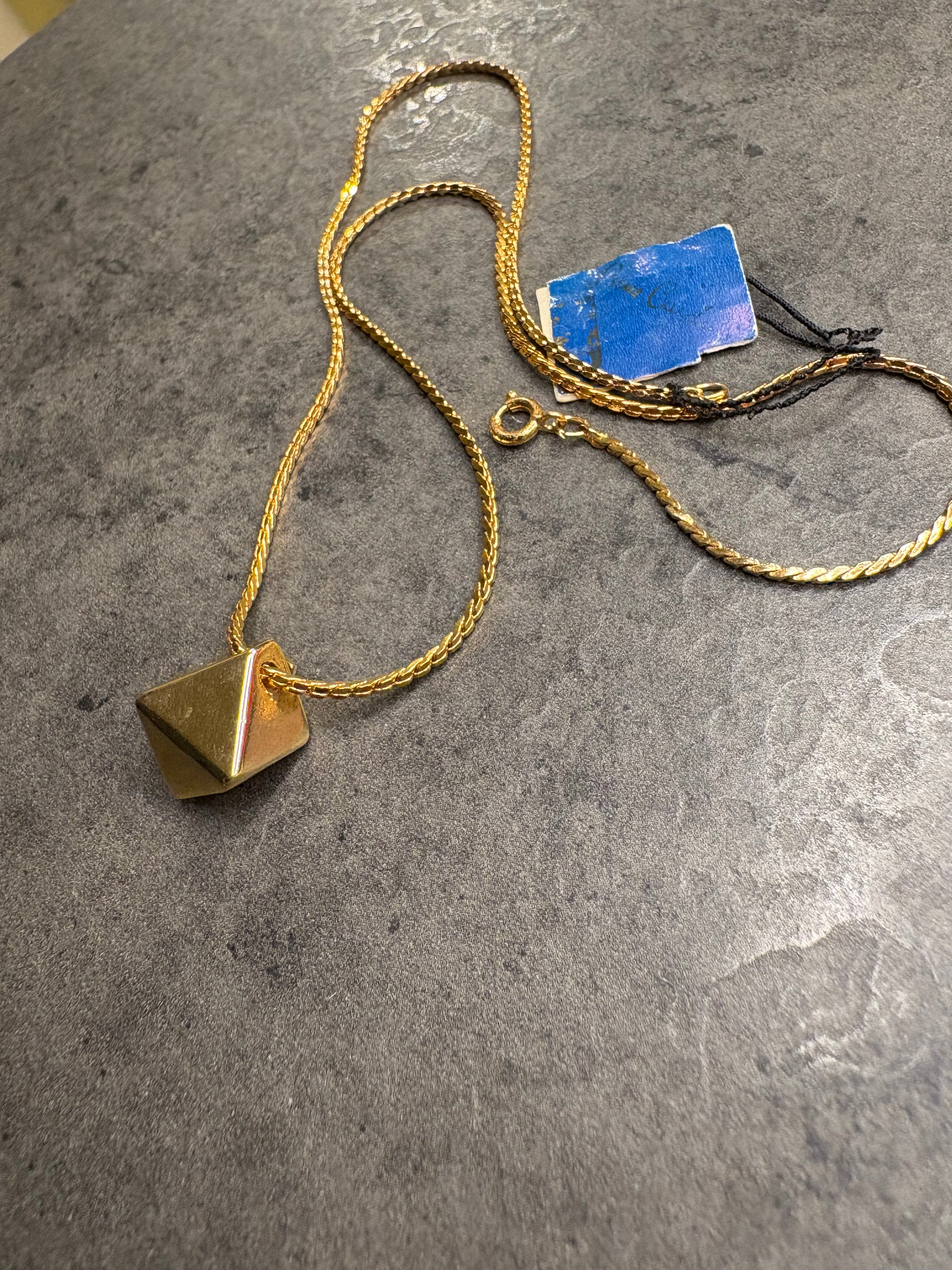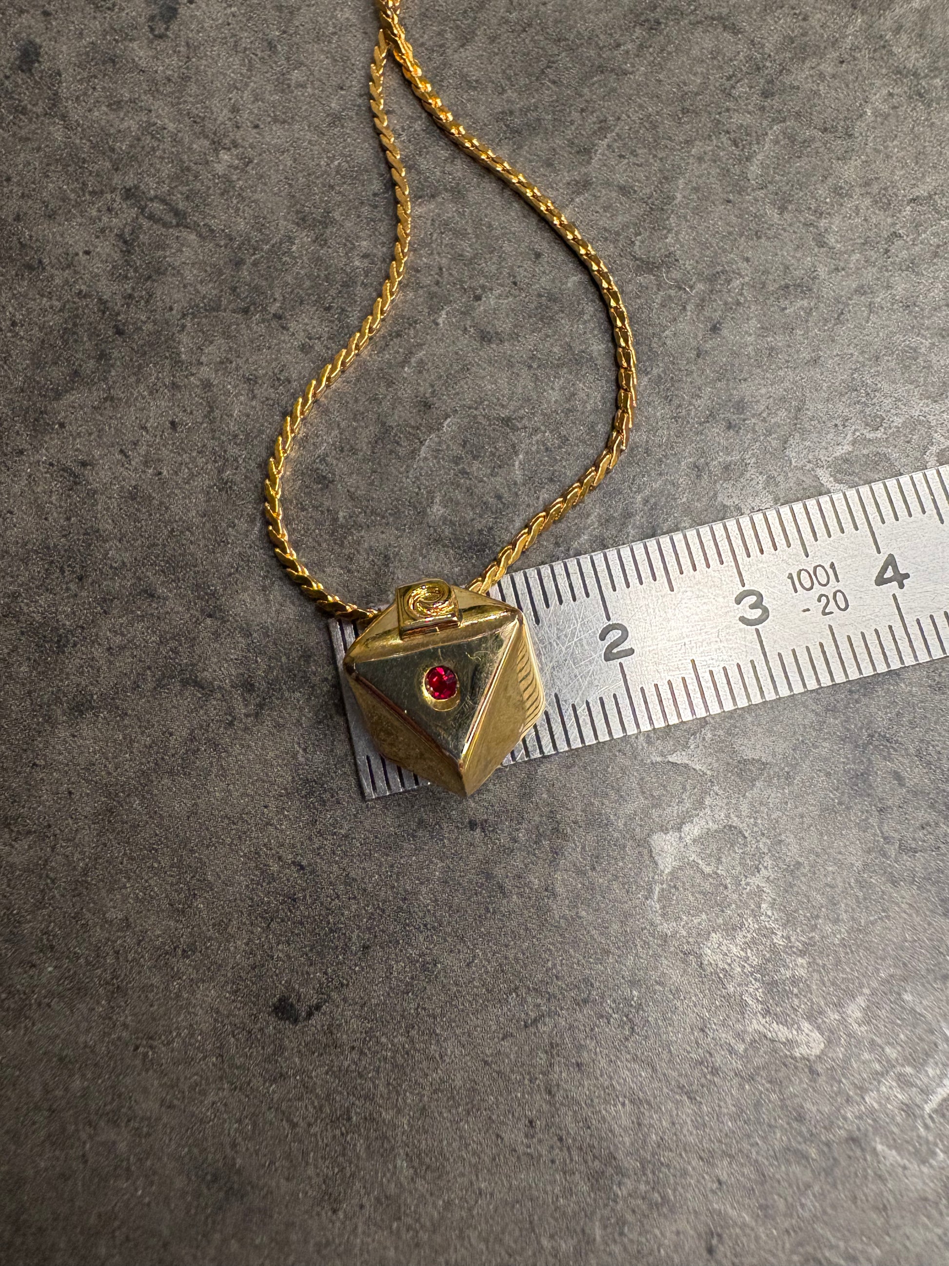 Il pendente, realizzato in metallo dorato, presenta la tipica forma geometrica tridimensionale tanto amata da Cardin: un piccolo poliedro dalle linee nette e scultoree, impreziosito da un cristallo rosso incastonato al centro, che dona profondità e un tocco di luce vibrante.