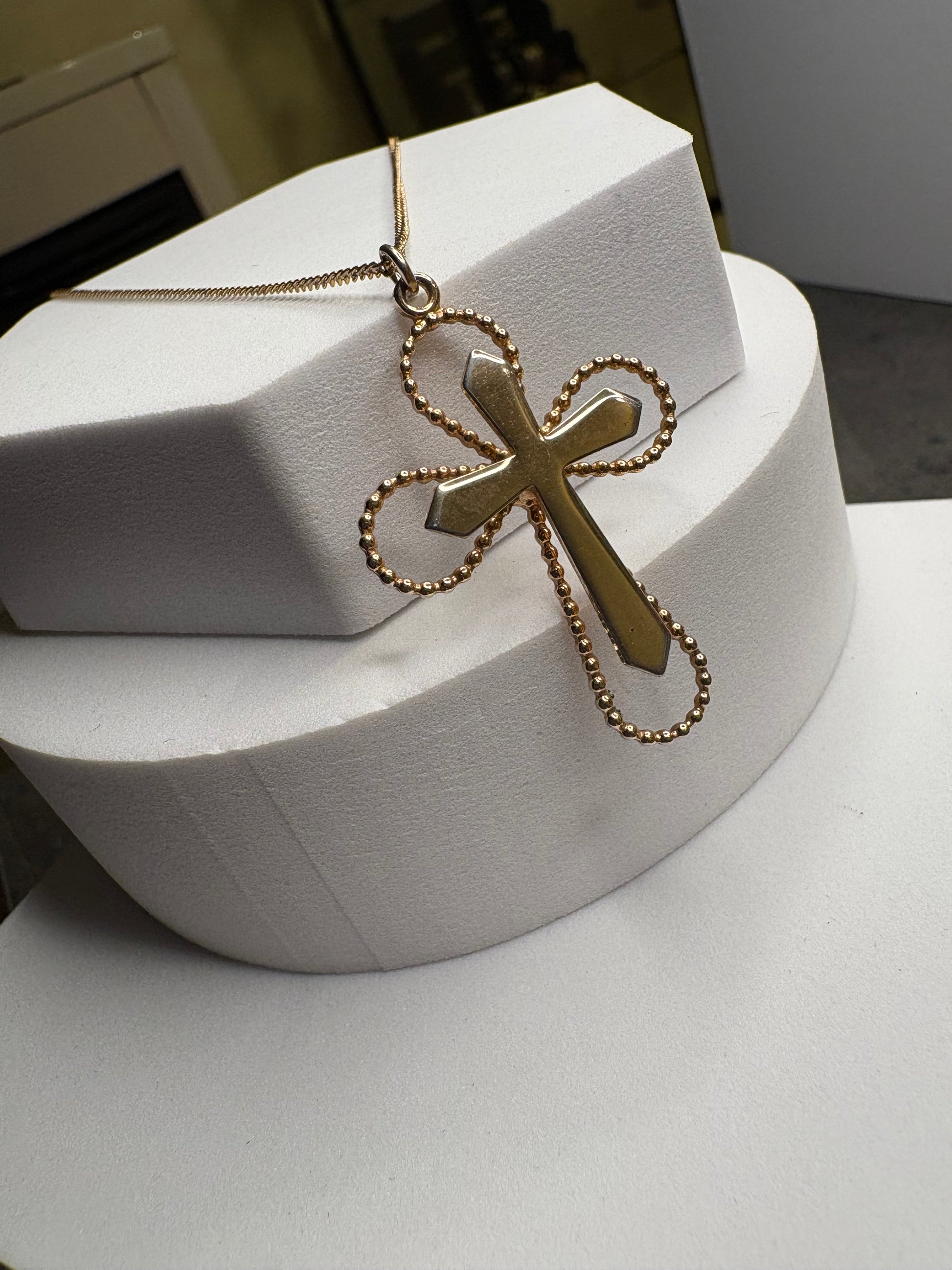 Questa elegante collana con croce tridimensionale è firmata Sarah Coventry e appartiene alla collezione “Serenity Cross”, realizzata nel 1974. La croce, in metallo dorato, è caratterizzata da un design pulito e moderno, con volumi ben definiti e una delicata lavorazione a pallinatura lungo i bordi che ne esalta la forma. La resa tridimensionale dona profondità e presenza al pendente, mentre la catena coordinata completa l’insieme con equilibrio e sobrietà. Un gioiello dal significato simbolico forte, ma reinterpretato con gusto contemporaneo per l’epoca.