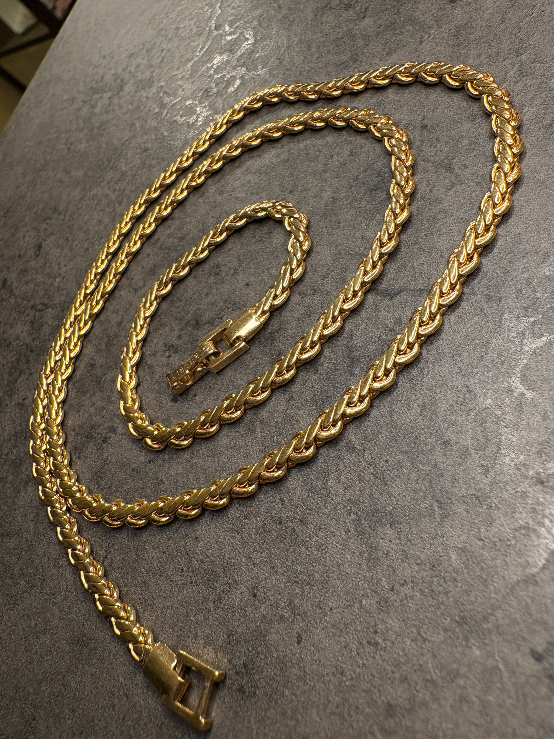 Raffinata collana vintage firmata Trifari, lunga circa 62 cm, realizzata in metallo dorato con una splendida lavorazione a maglia intrecciata dal gusto elegante e senza tempo.