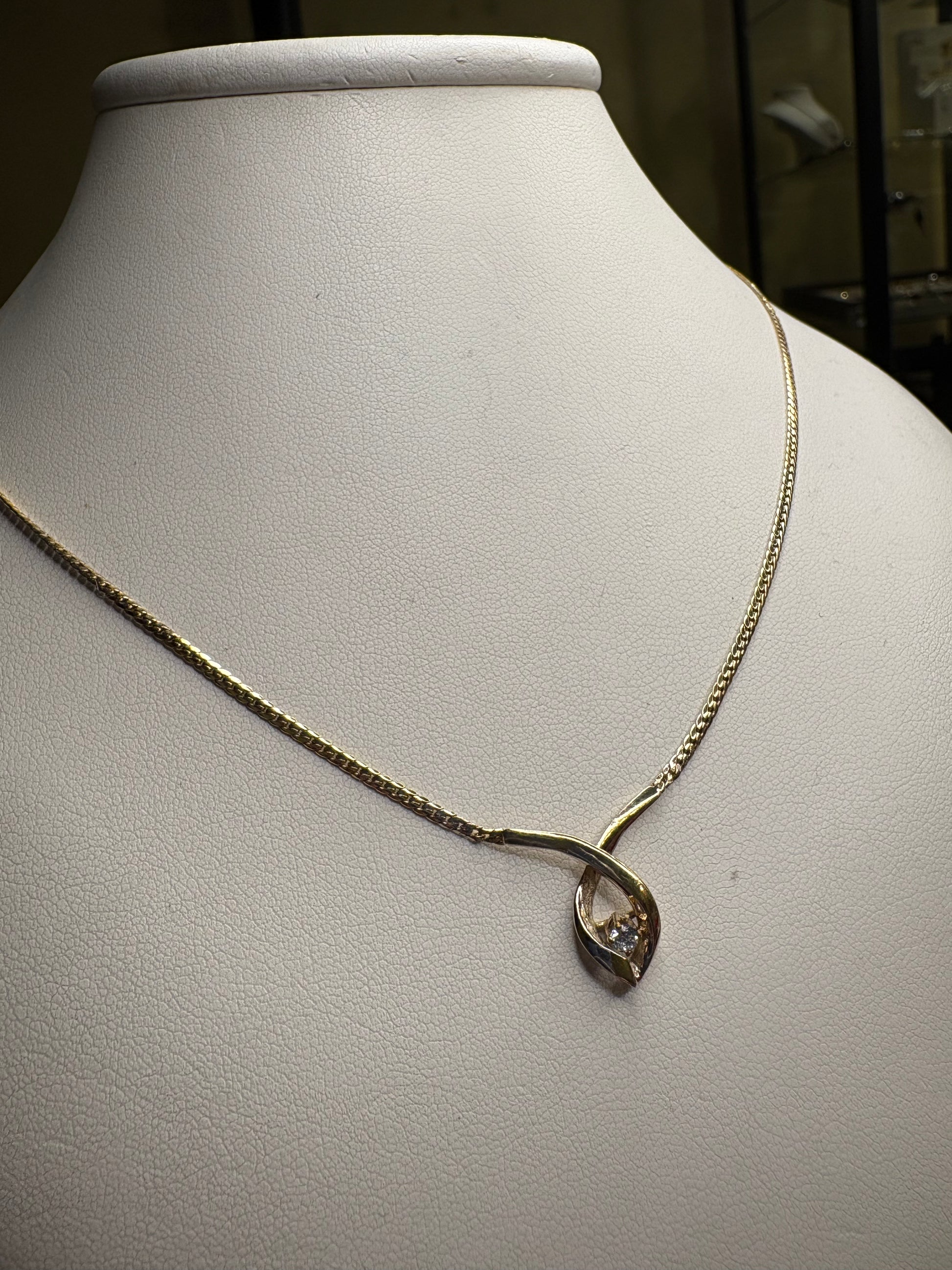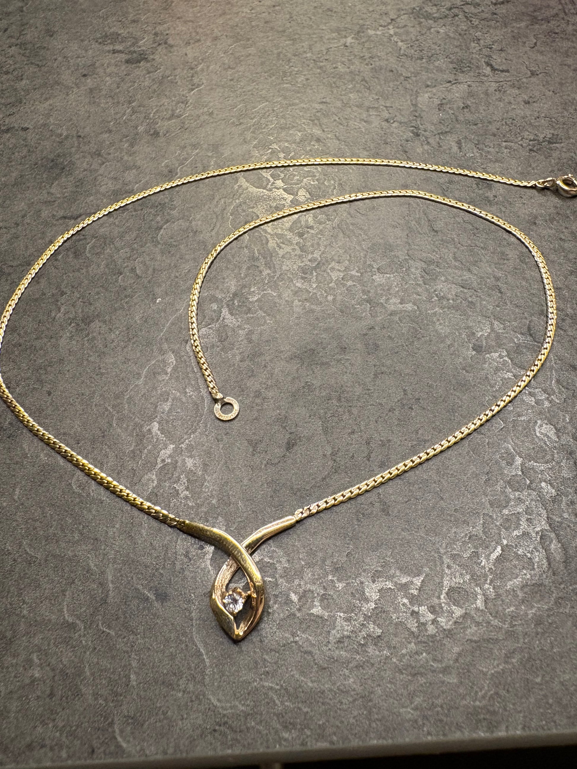 Raffinato collier vintage in metallo dorato Amerikaner, lungo circa 43 cm, caratterizzato da un design essenziale e sinuoso che ne sottolinea la naturale eleganza. Il girocollo presenta una catena sottile e luminosa che culmina in un pendente centrale a motivo intrecciato, dalla linea morbida e asimmetrica, al cui interno brilla un cristallo trasparente taglio brillante. La pietra, incastonata con precisione, riflette la luce con delicati bagliori, donando al gioiello un’allure sobria e raffinata.