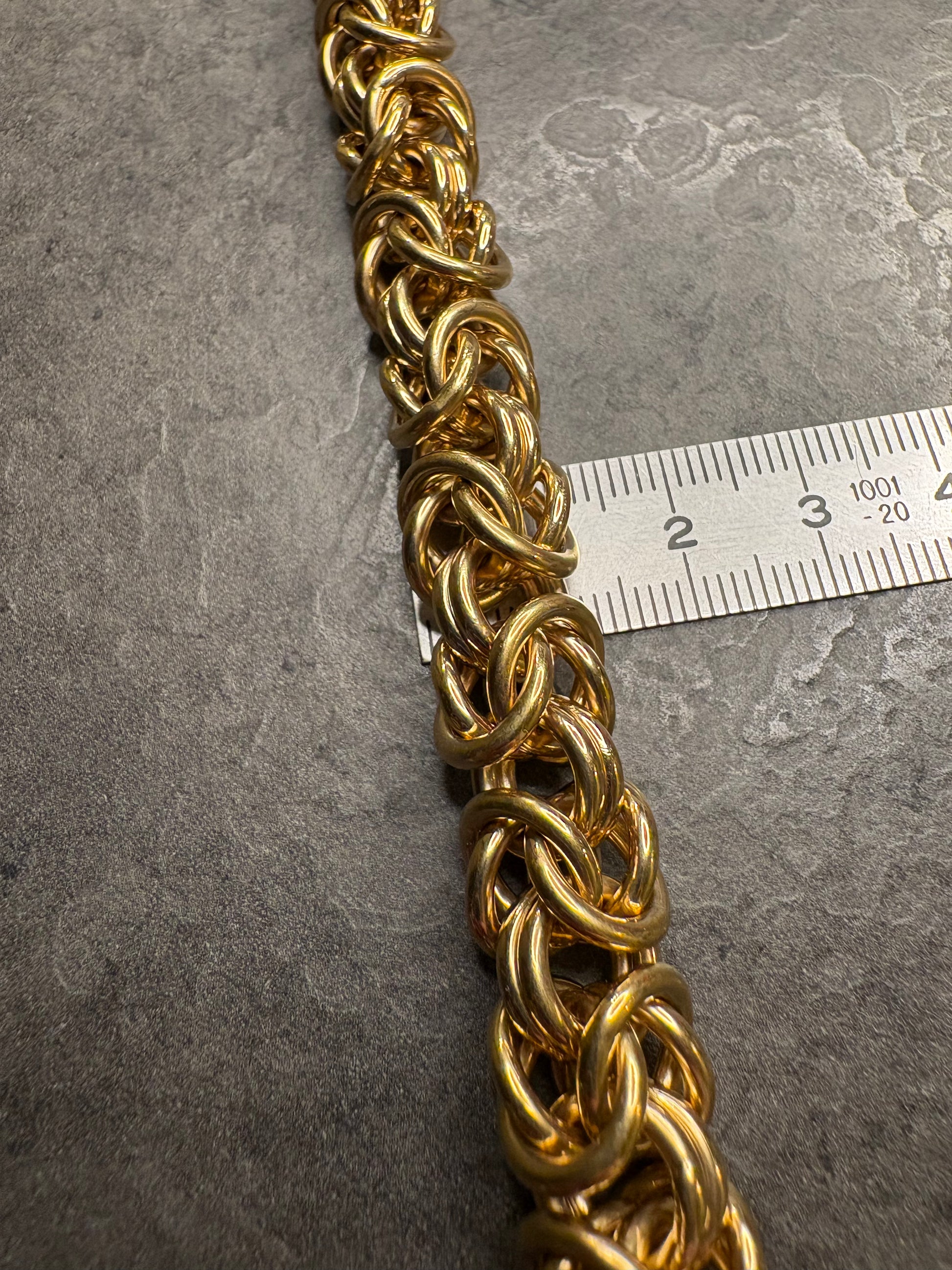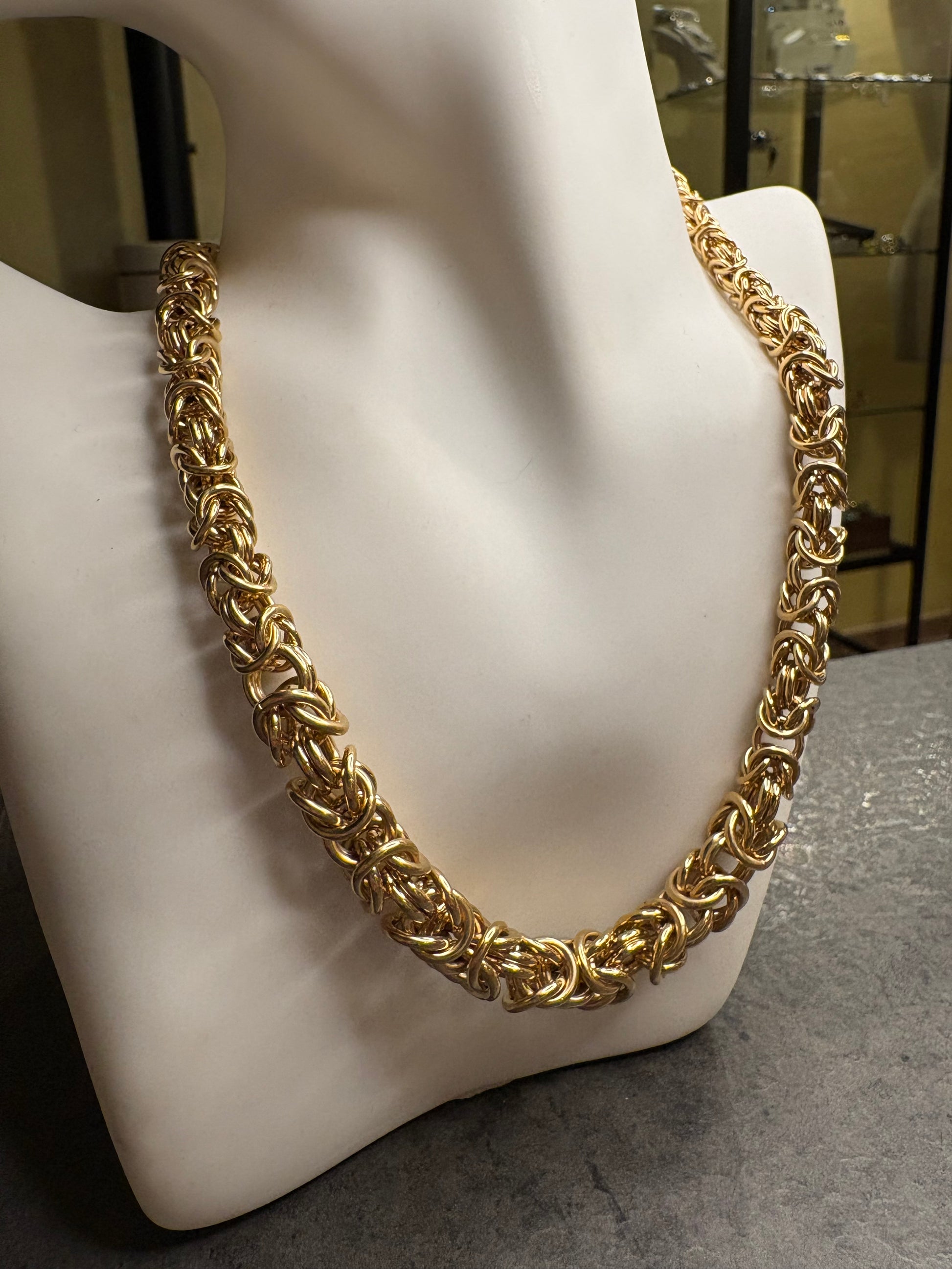 Importante girocollo vintage in metallo dorato caratterizzato da una lavorazione a maglia intrecciata molto ricca e strutturata. La parte centrale presenta una maglia più spessa e compatta che dona corpo e presenza al gioiello, mentre la struttura rimane armoniosa e flessibile. Lunghezza totale circa 45 cm, perfetta per valorizzare il décolleté. Finitura lucida brillante, stile elegante e deciso tipico anni ’80-’90. Collana importante ma versatile, ideale sia per look sofisticati sia per dare carattere a un outfit semplice.