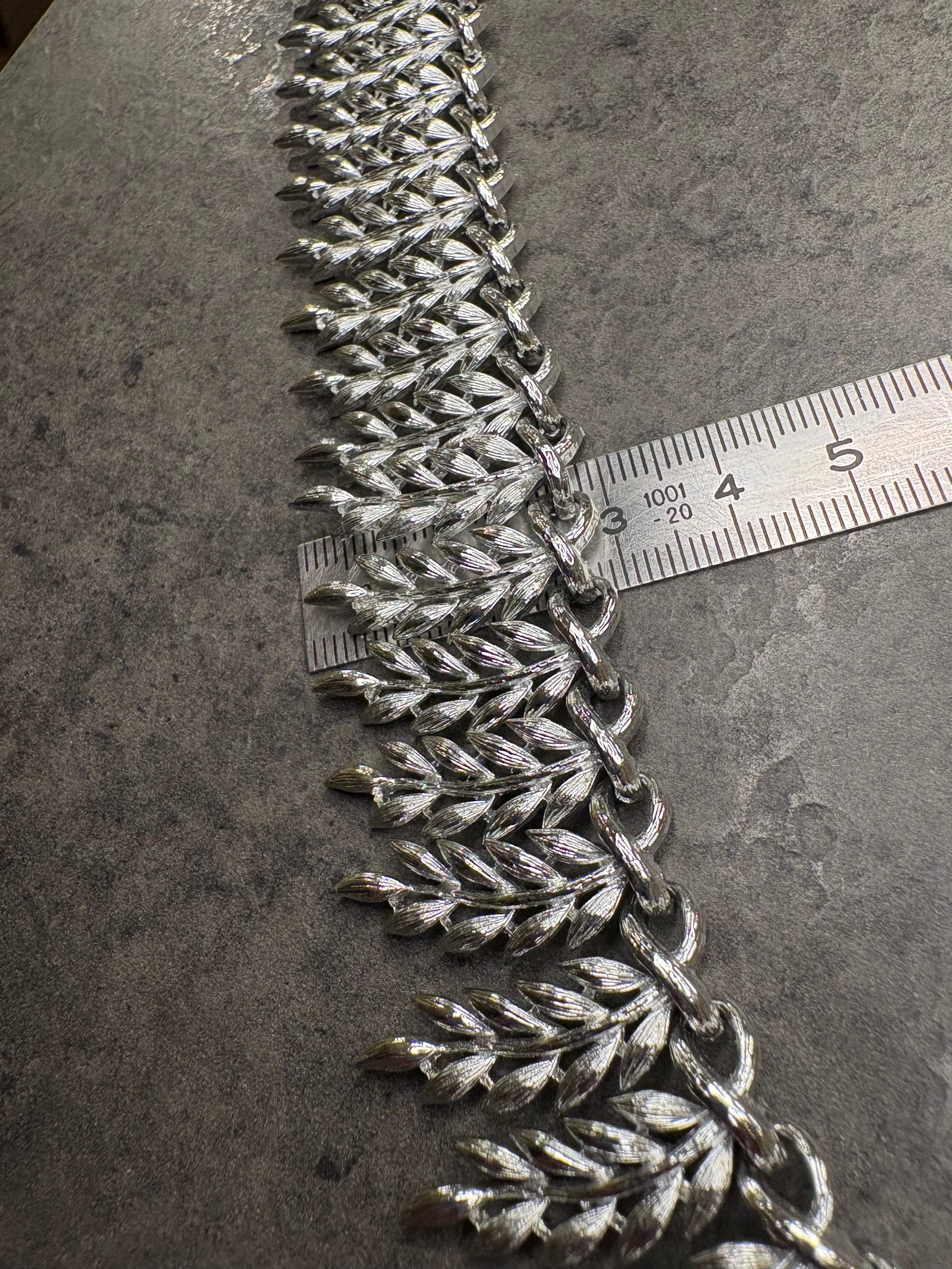 Questo modello presenta una lavorazione a spighe / foglie finemente scolpite, che ricoprono gran parte della superficie del collier creando un effetto ricco, luminoso e molto sofisticato.