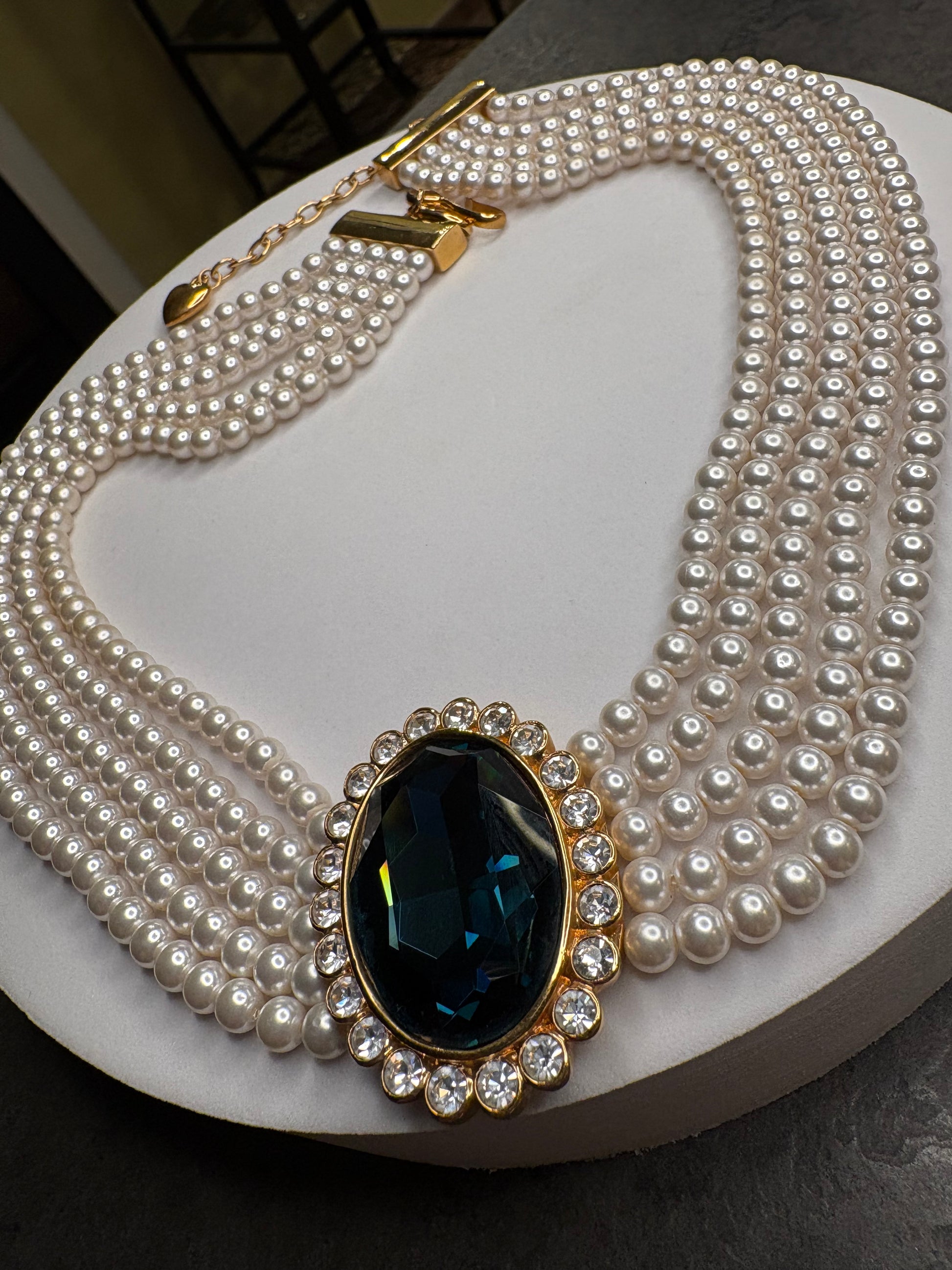 Scenografico collier composto da cinque file compatte di perle sintetiche color avorio dalla lucentezza uniforme e setosa, perfettamente graduate e infilate con cura per creare una struttura ampia e ricca al décolleté. Il punto focale è un imponente elemento centrale in metallo color oro lucido, impreziosito da una cornice di cristalli trasparenti taglio brillante che circondano un grande cristallo centrale sfaccettato color blu acqua, luminoso e profondo, capace di riflettere la luce con splendidi riflessi cangianti. Sul retro del pendente è presente l’incisione “Queen of Hearts”, dettaglio romantico e ricercato. Chiusura a gancio regolabile in metallo dorato con piccola catenella finale, lunghezza totale circa 50 cm. Gioiello di grande presenza, perfetto per serate eleganti, cerimonie o per dare un tocco regale a look minimal.