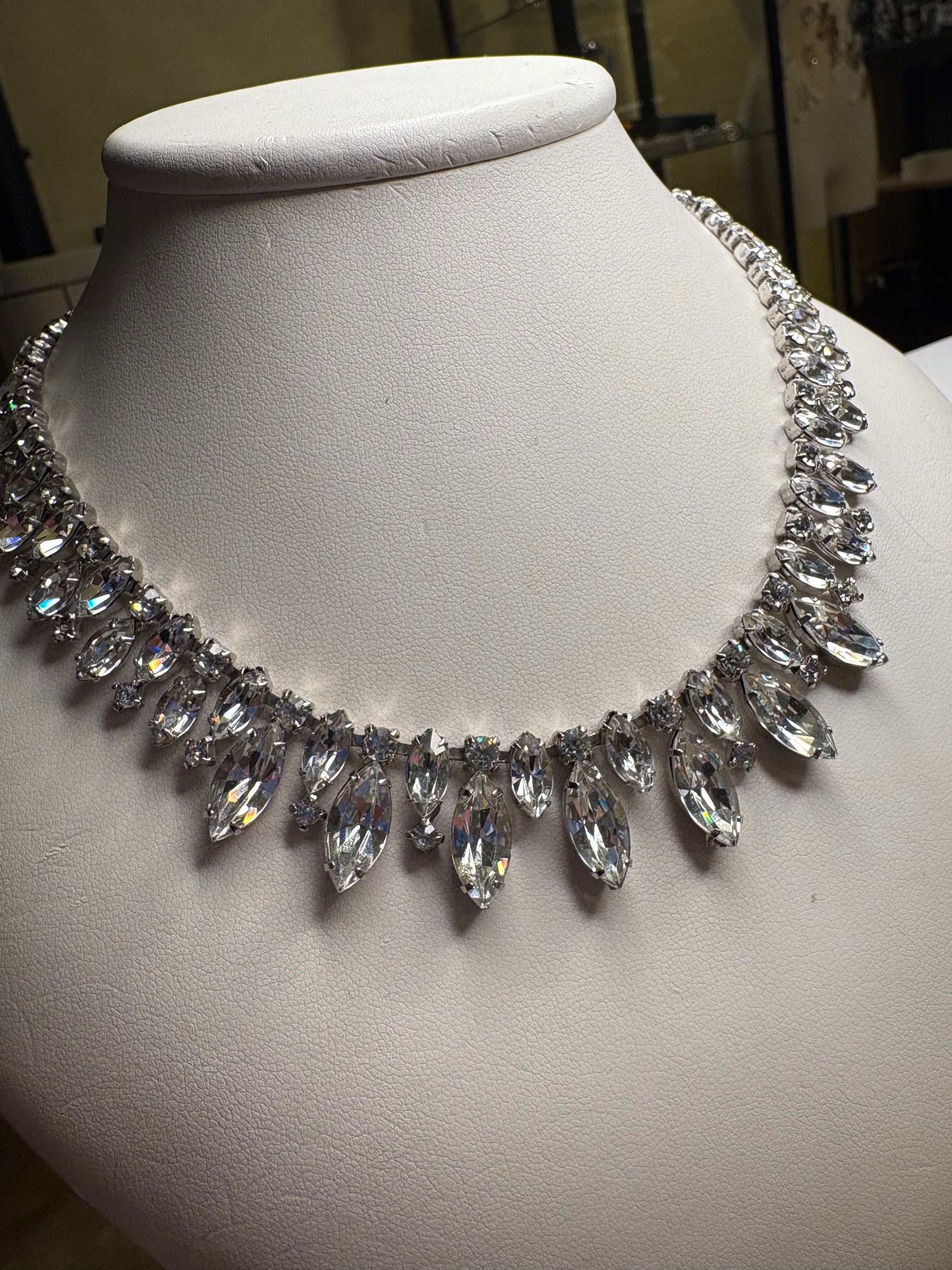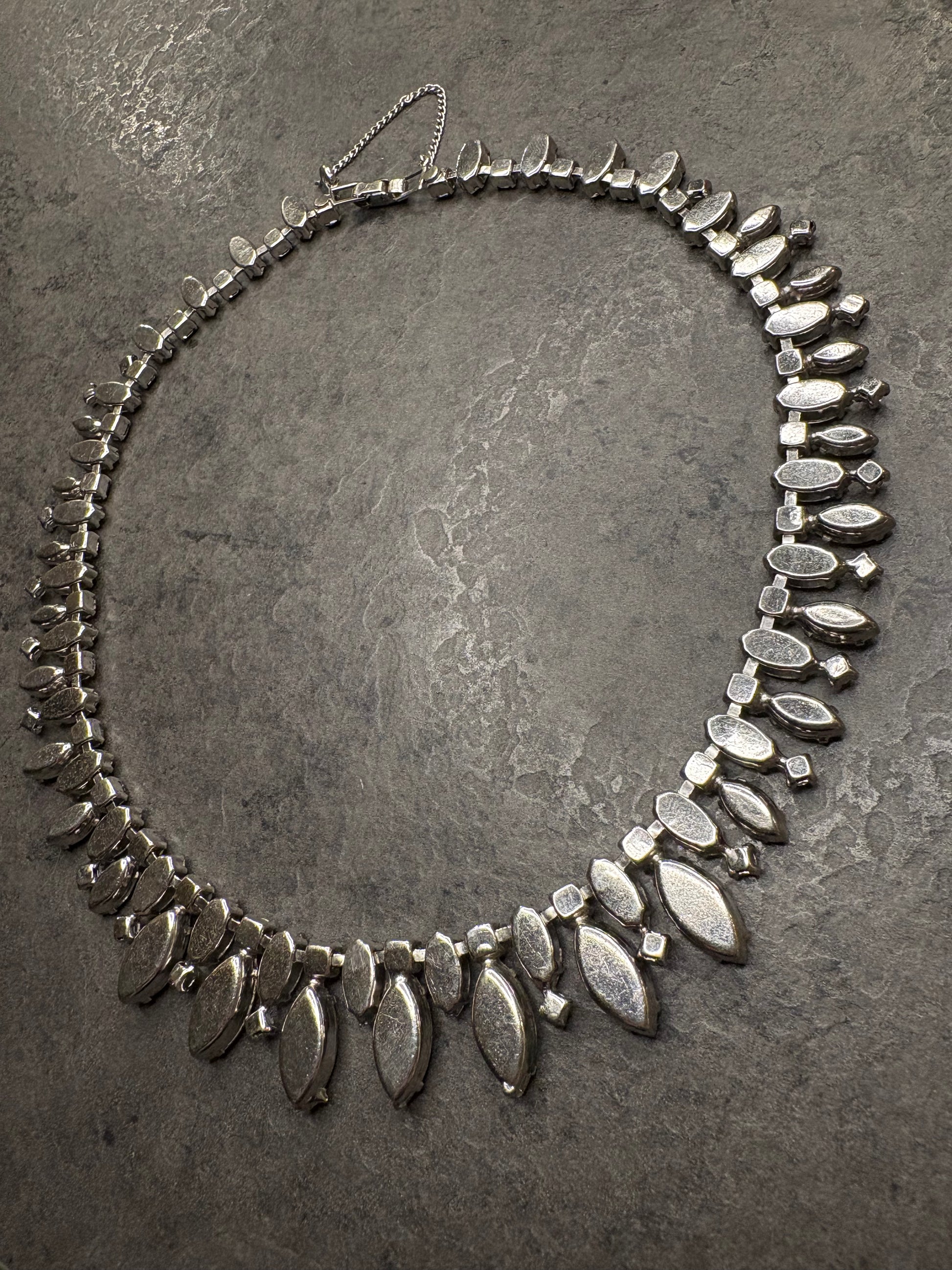 Questo meraviglioso collier in metallo color argento è un vero capolavoro di luce e movimento. È interamente decorato con cristalli trasparenti di diverse forme e dimensioni, sapientemente alternati per creare un disegno armonioso e altamente scintillante. Le pietre taglio marquise, disposte come una corona di gocce luminose, si alternano a cristalli tondi, creando un elegante motivo a frangia che segue perfettamente la linea del collo. La struttura è solida e ben bilanciata, pensata per sostenere la ricchezza delle pietre senza perdere comfort. La presenza della catena di sicurezza testimonia la qualità e il valore del gioiello, oltre a essere un dettaglio tipico delle creazioni vintage più curate. Una collana scenografica, ideale per abiti da sera, eventi importanti o per collezionisti di bigiotteria d’epoca di alto livello.