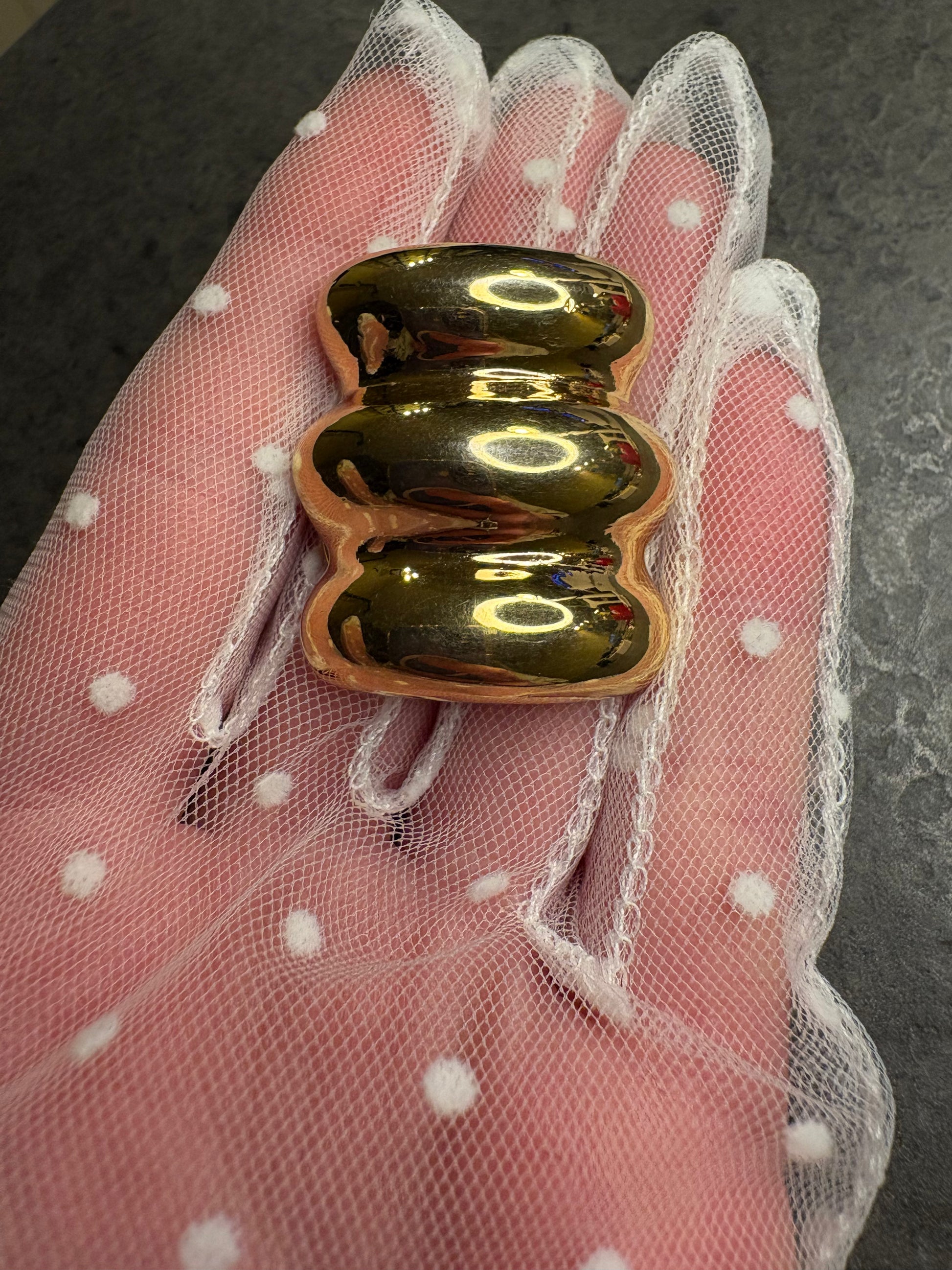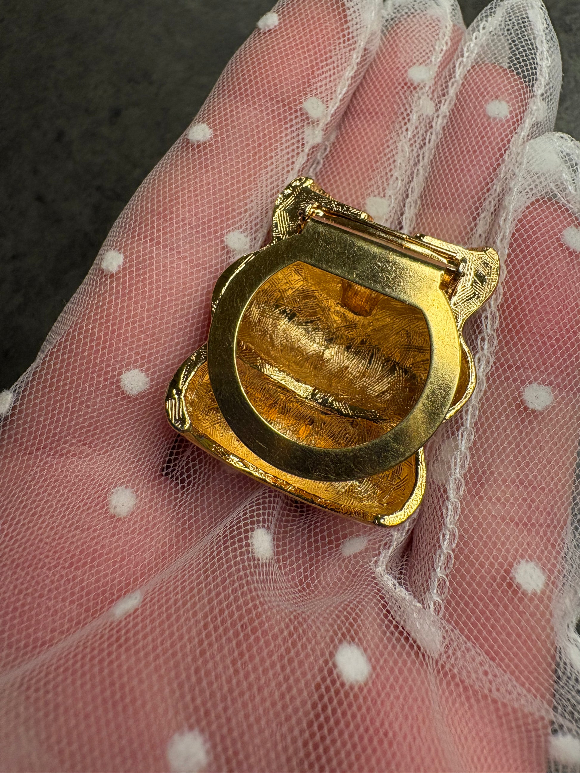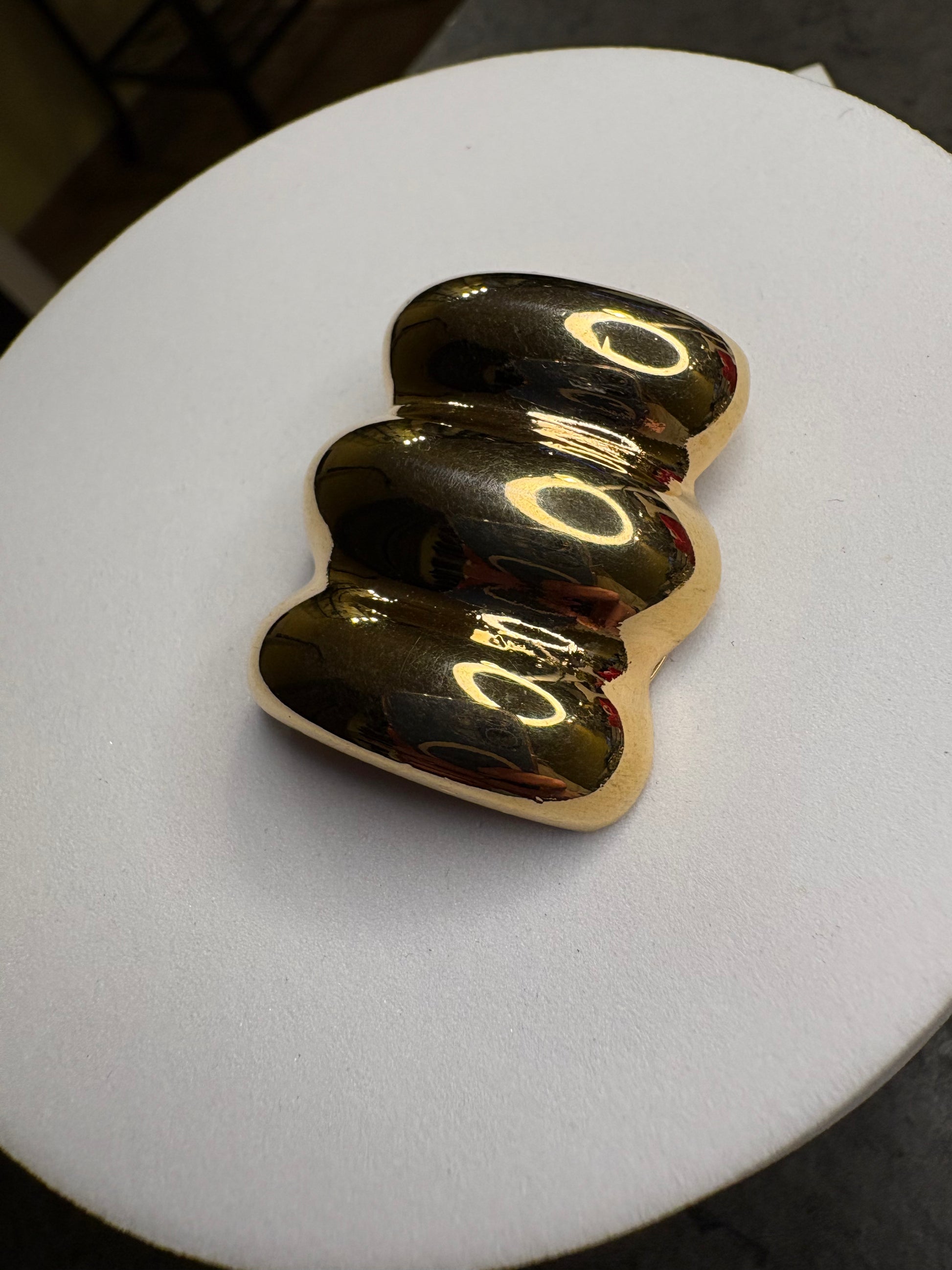 Delizioso ferma foulard dal design minimal ed elegante, realizzato in metallo color oro lucido. La forma compatta e armoniosa permette di fissare foulard e sciarpe con praticità mantenendo un aspetto sofisticato. Accessorio intramontabile, ideale per impreziosire look classici o retrò.