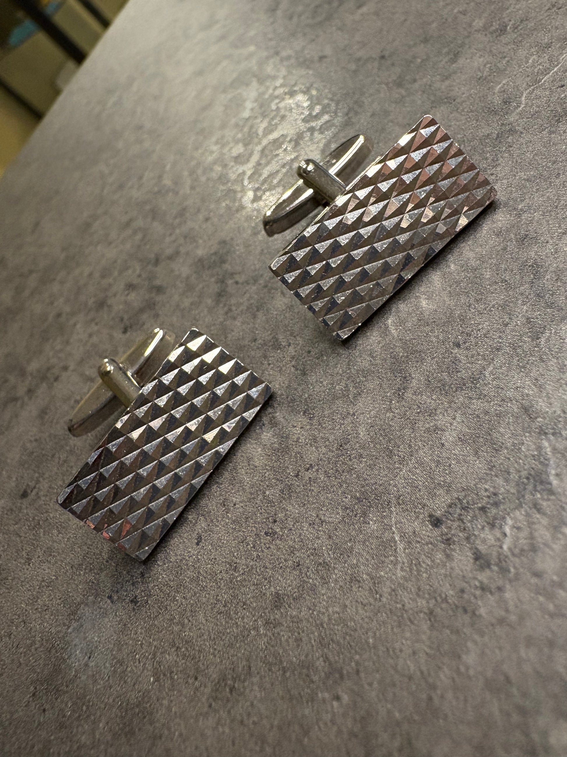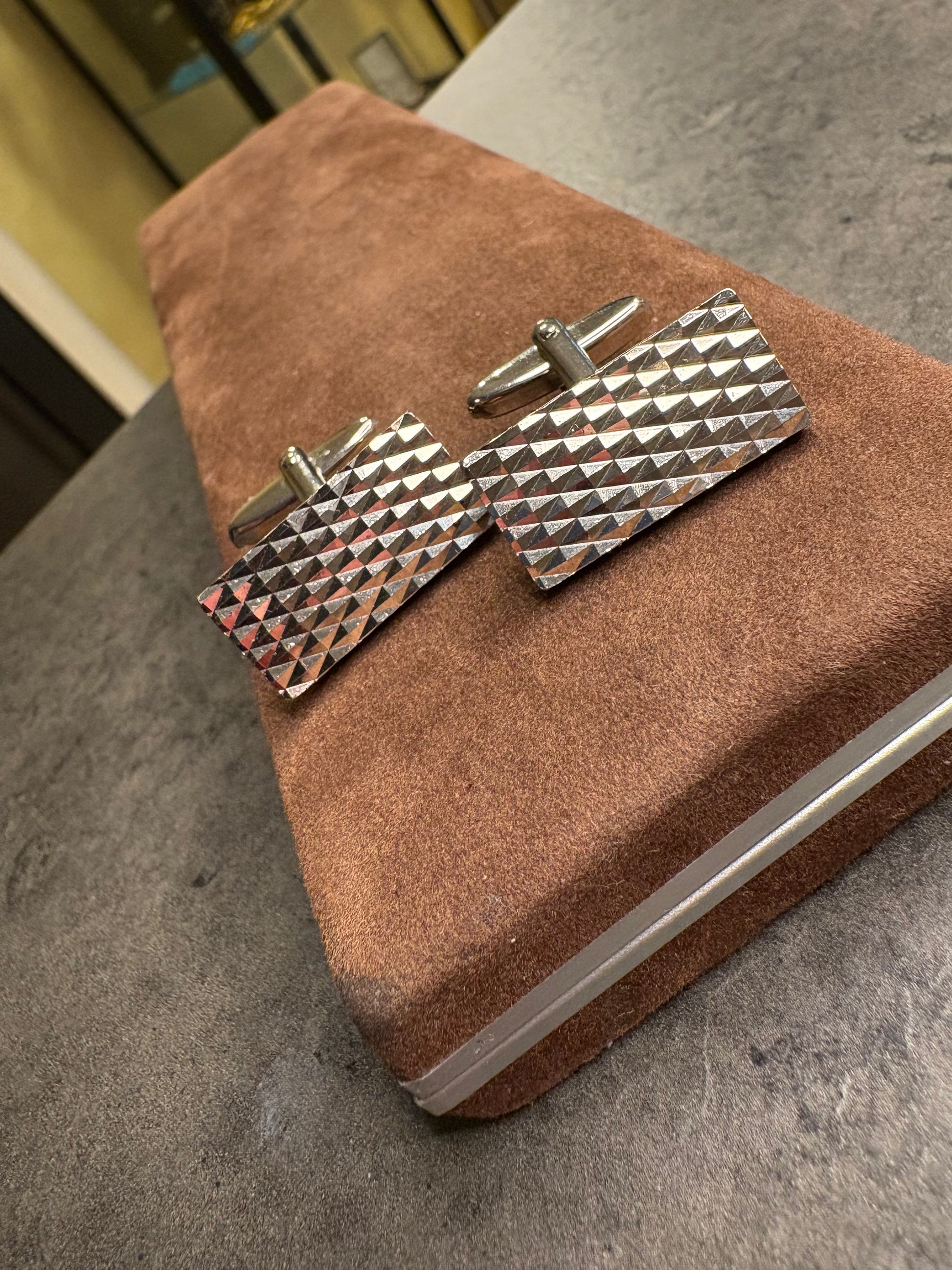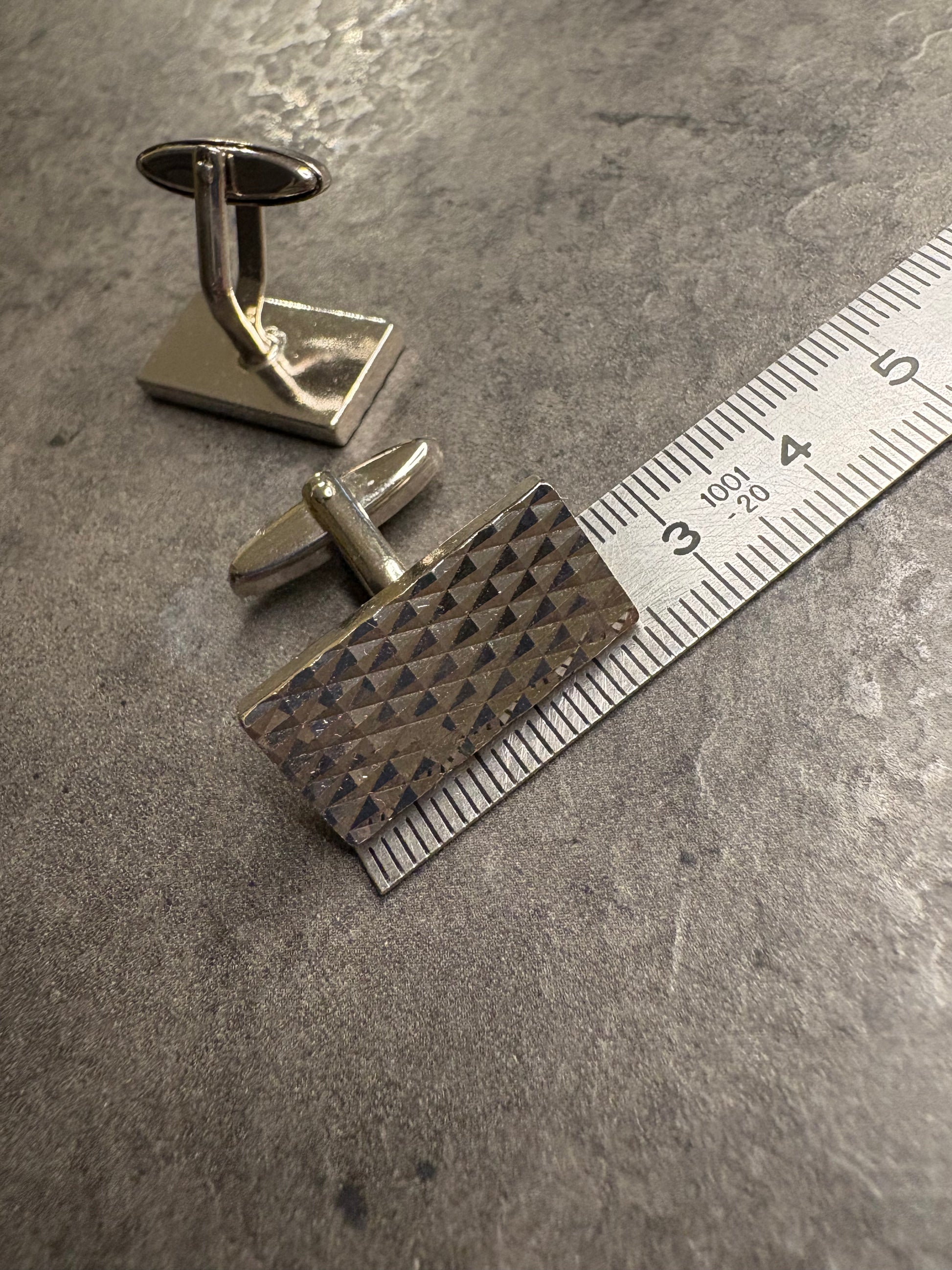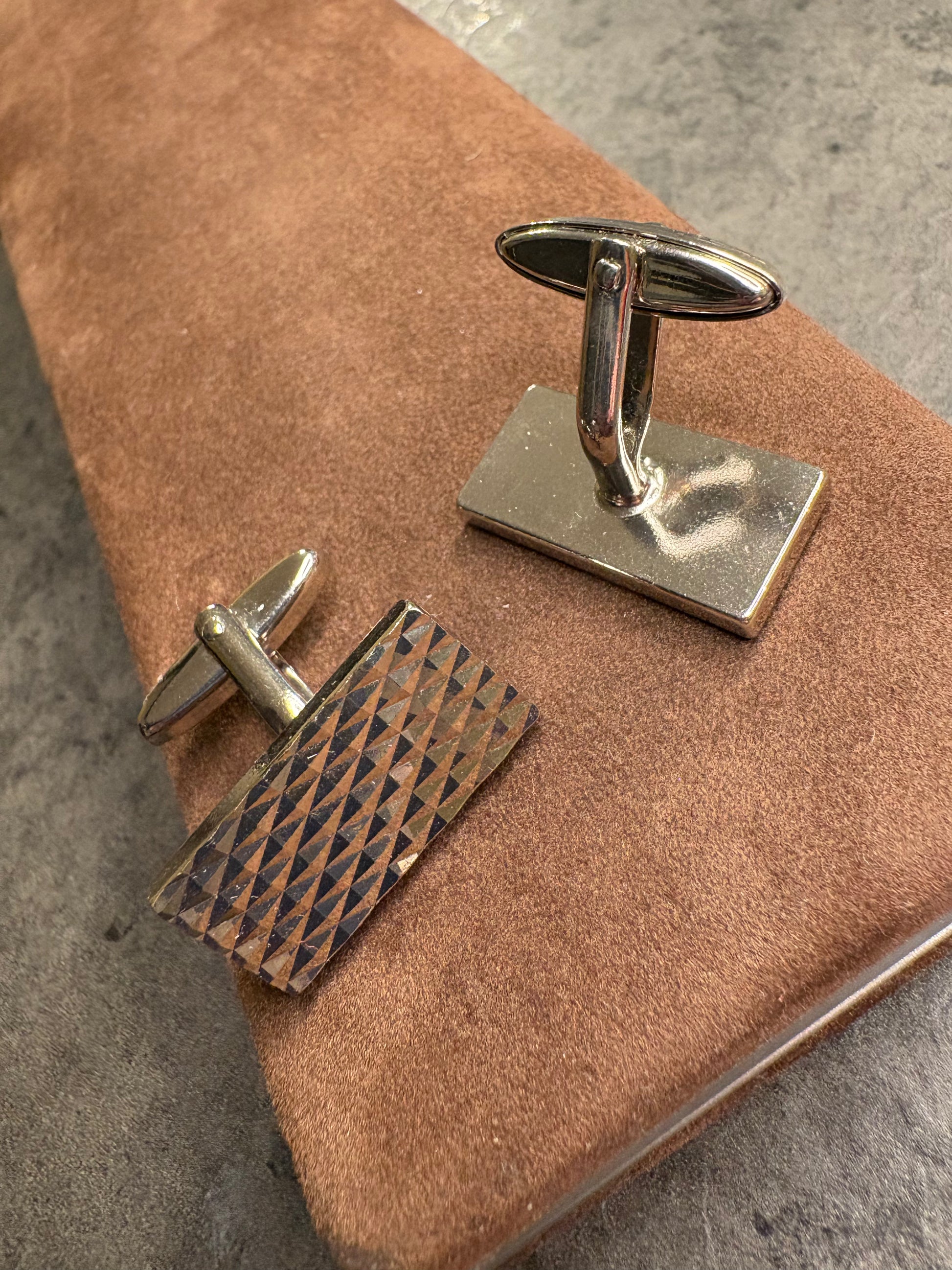 Raffinata coppia di gemelli vintage in metallo argentato, caratterizzati da un design essenziale e contemporaneo.