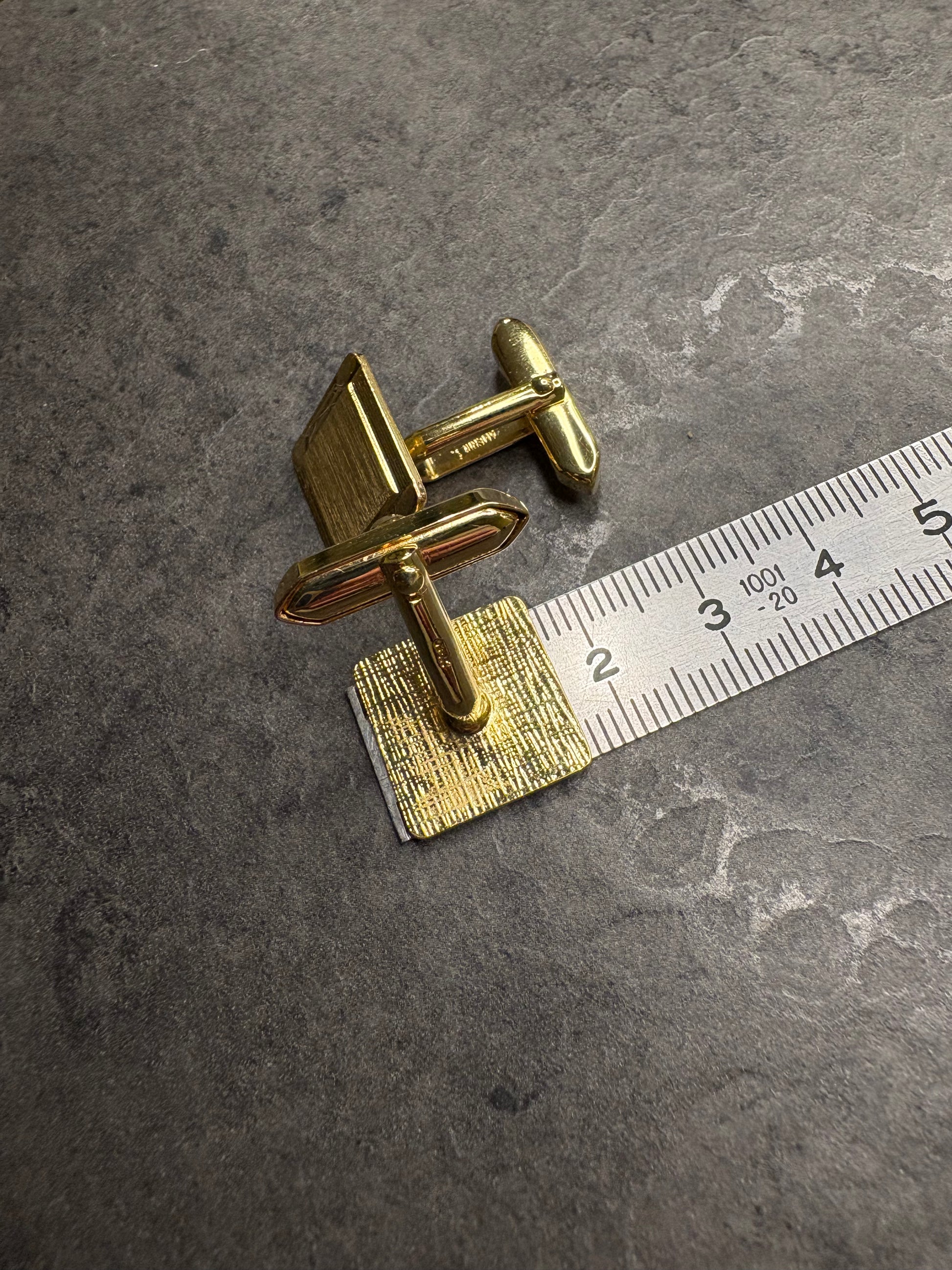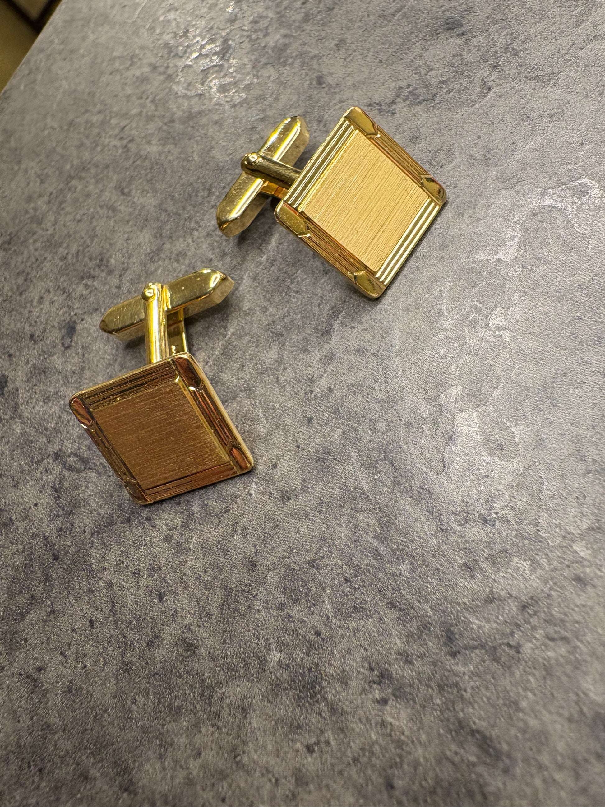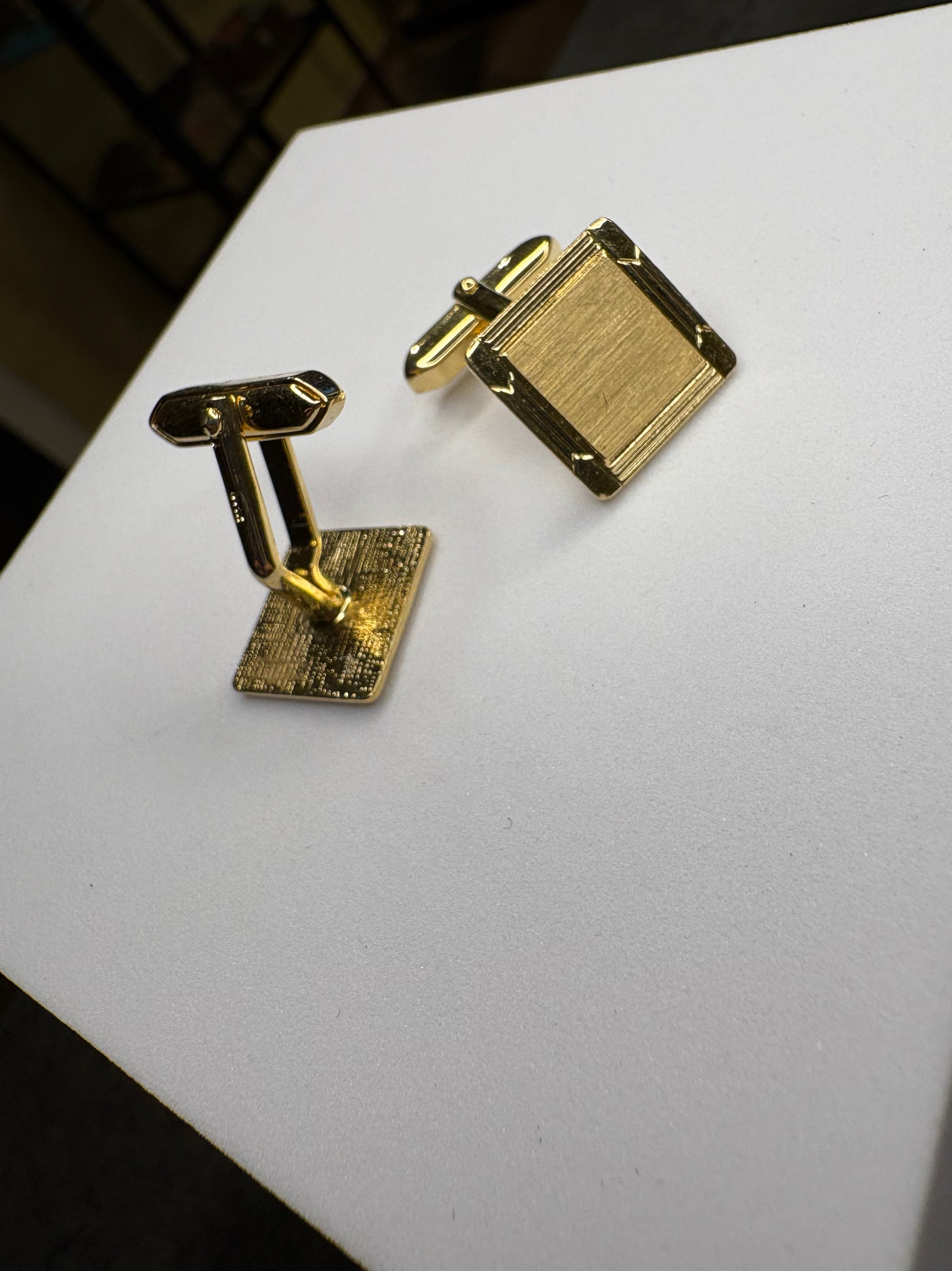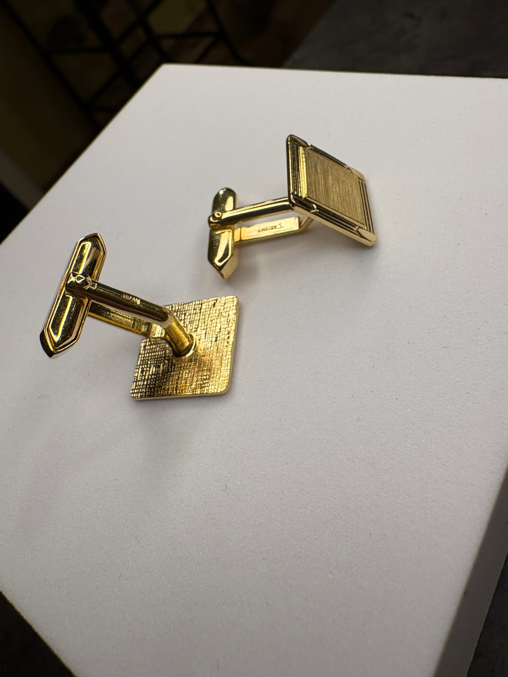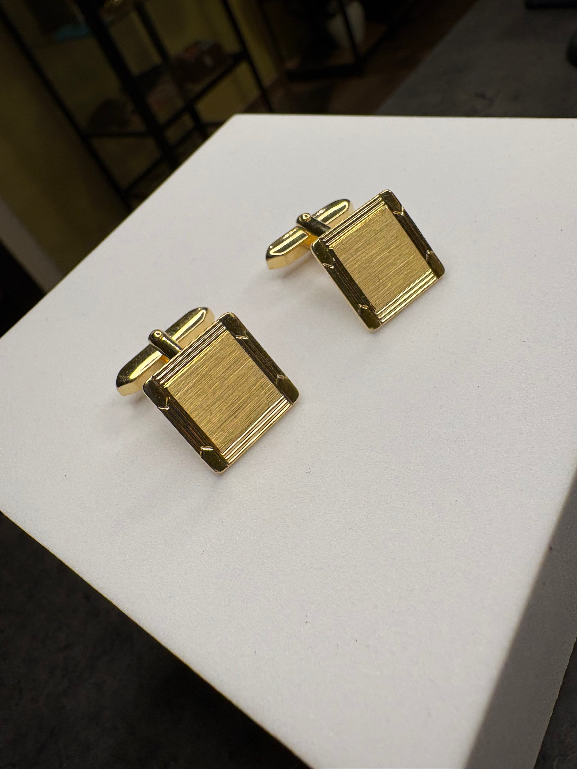 Questo elegante paio di gemelli è realizzato in lega metallica Amerikaner, una finitura molto apprezzata nella gioielleria vintage per il suo aspetto simile all’oro e la buona resistenza nel tempo. Il design è geometrico e sobrio, con una superficie satinata incorniciata da bordi leggermente lucidi che creano un raffinato gioco di contrasti. La struttura solida e il meccanismo a bascula testimoniano una produzione di qualità, pensata per un’eleganza maschile discreta e senza tempo.