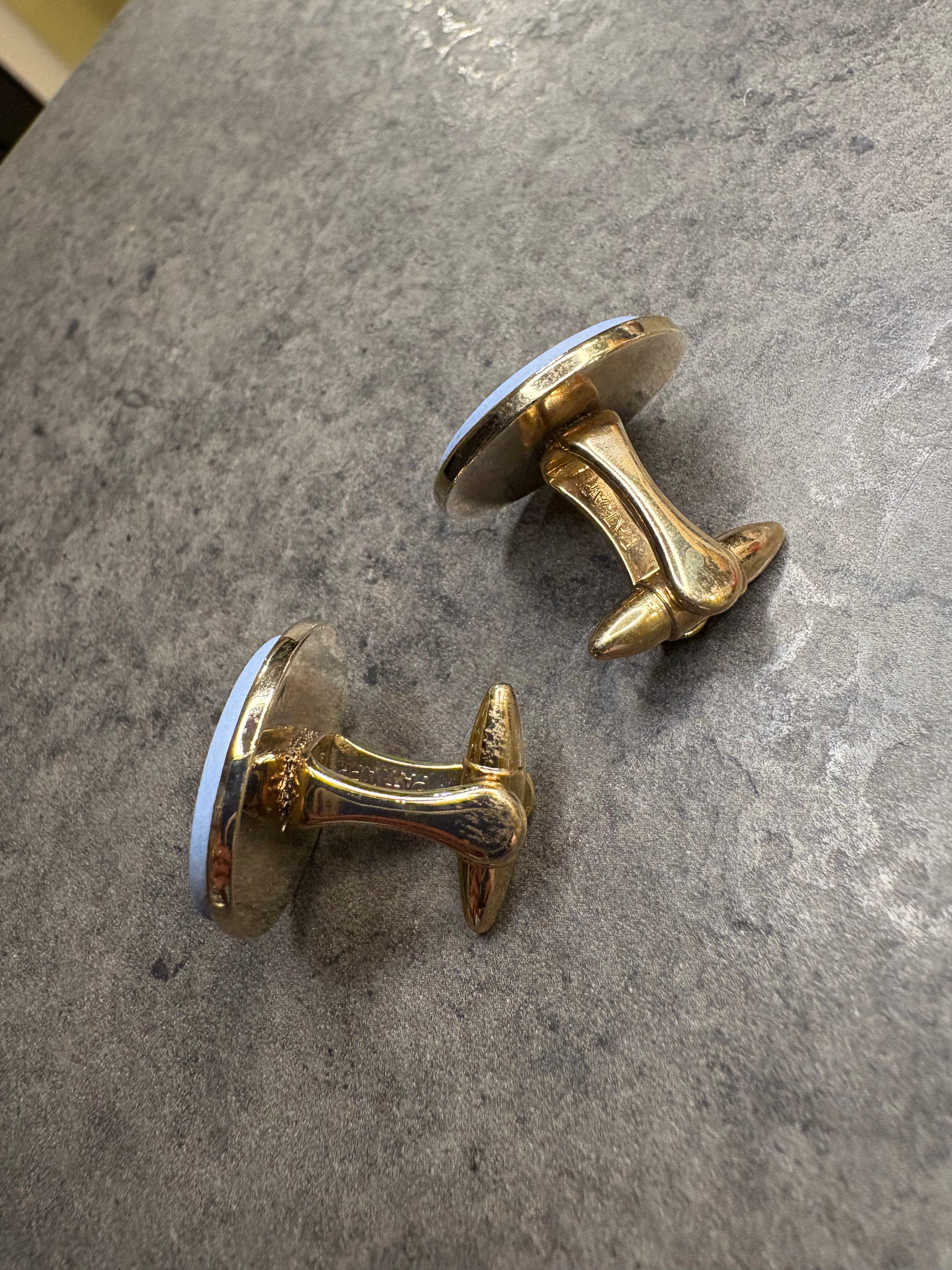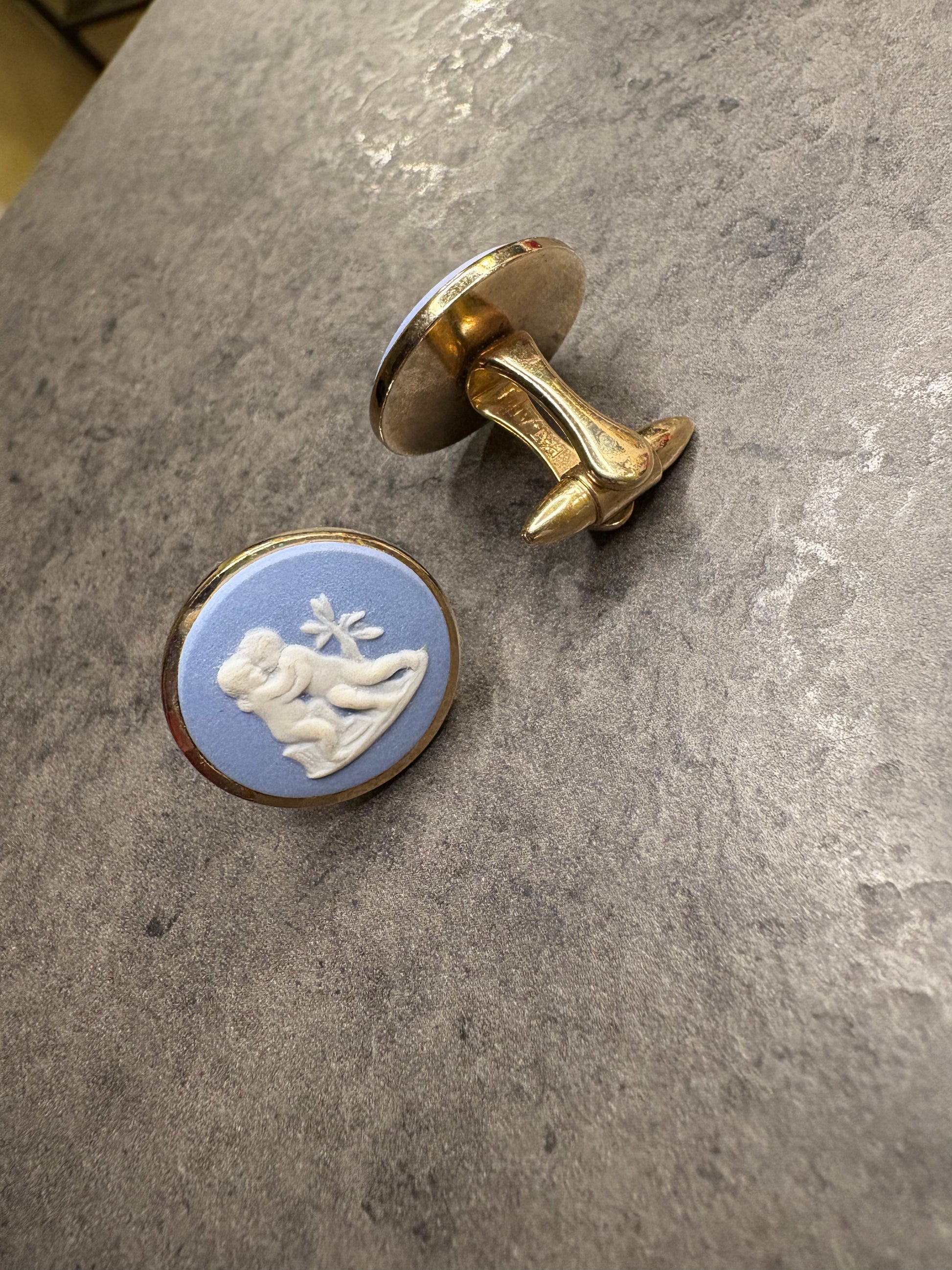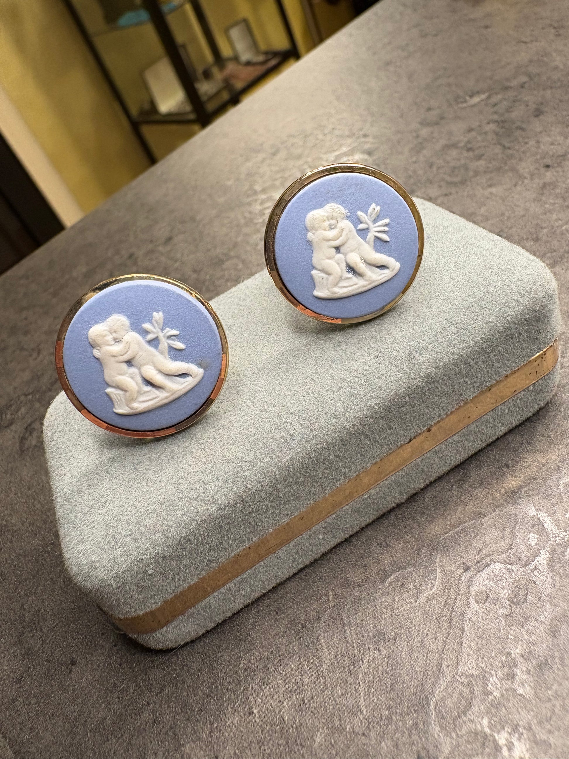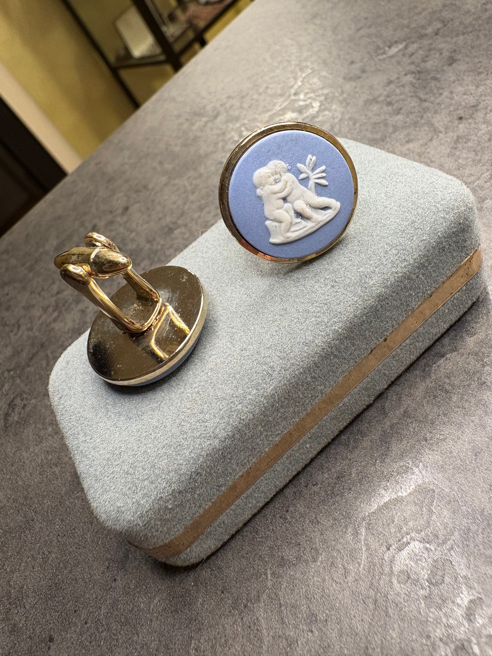 Raffinati gemelli vintage realizzati in metallo dorato lucido, impreziositi da un medaglione azzurro pastello in stile Wedgwood. Al centro spicca un delicato rilievo bianco che raffigura due amorini abbracciati accanto a un ramo d’ulivo, simbolo di amore e pace. L’armonia dei colori e la cura dei dettagli rendono questi gemelli un accessorio di grande eleganza, dal fascino neoclassico e intramontabile, perfetto per completare con stile una camicia formale o un outfit da cerimonia. In ottime condizioni vintage, con minimi segni del tempo coerenti con l’età.