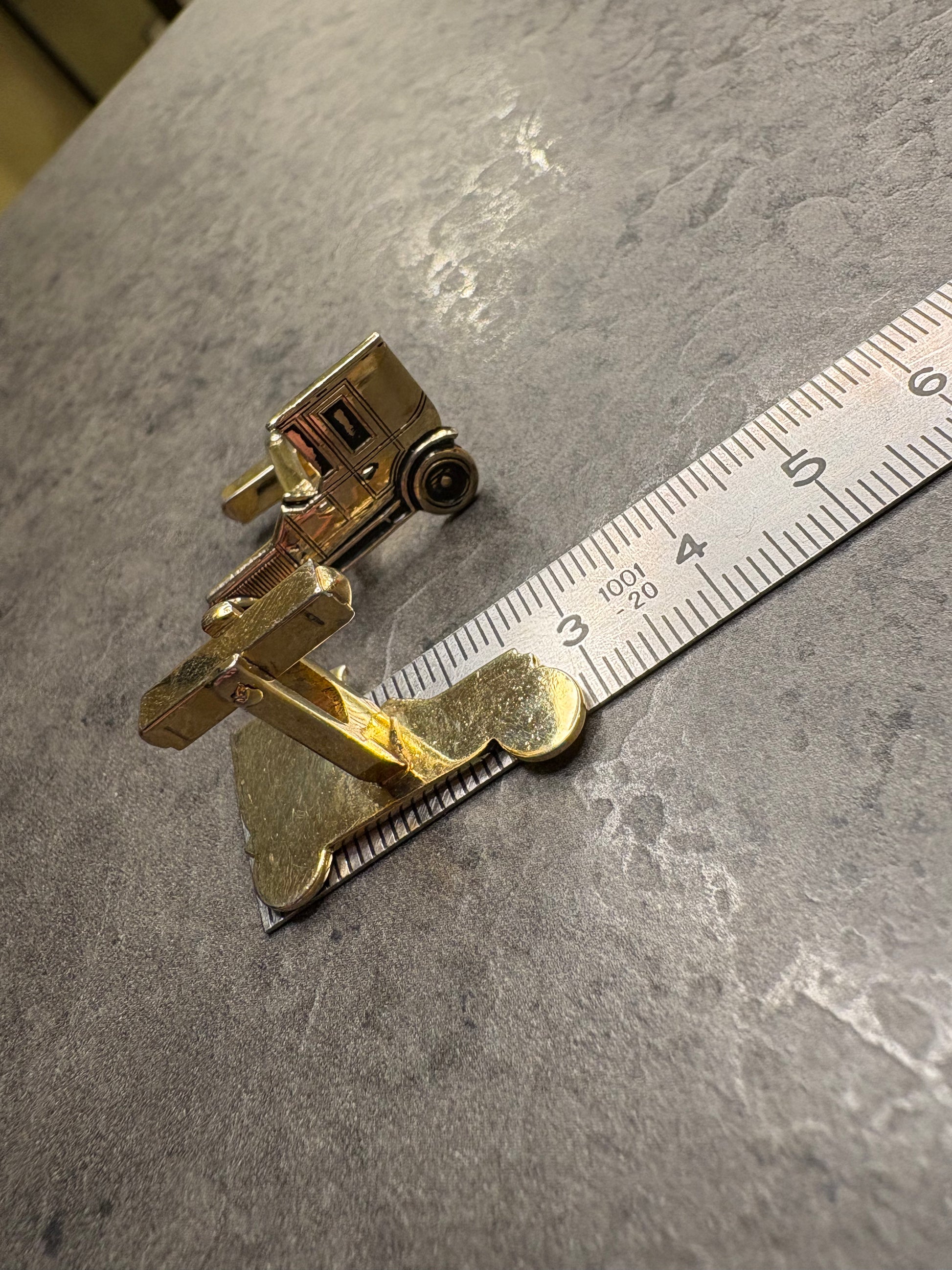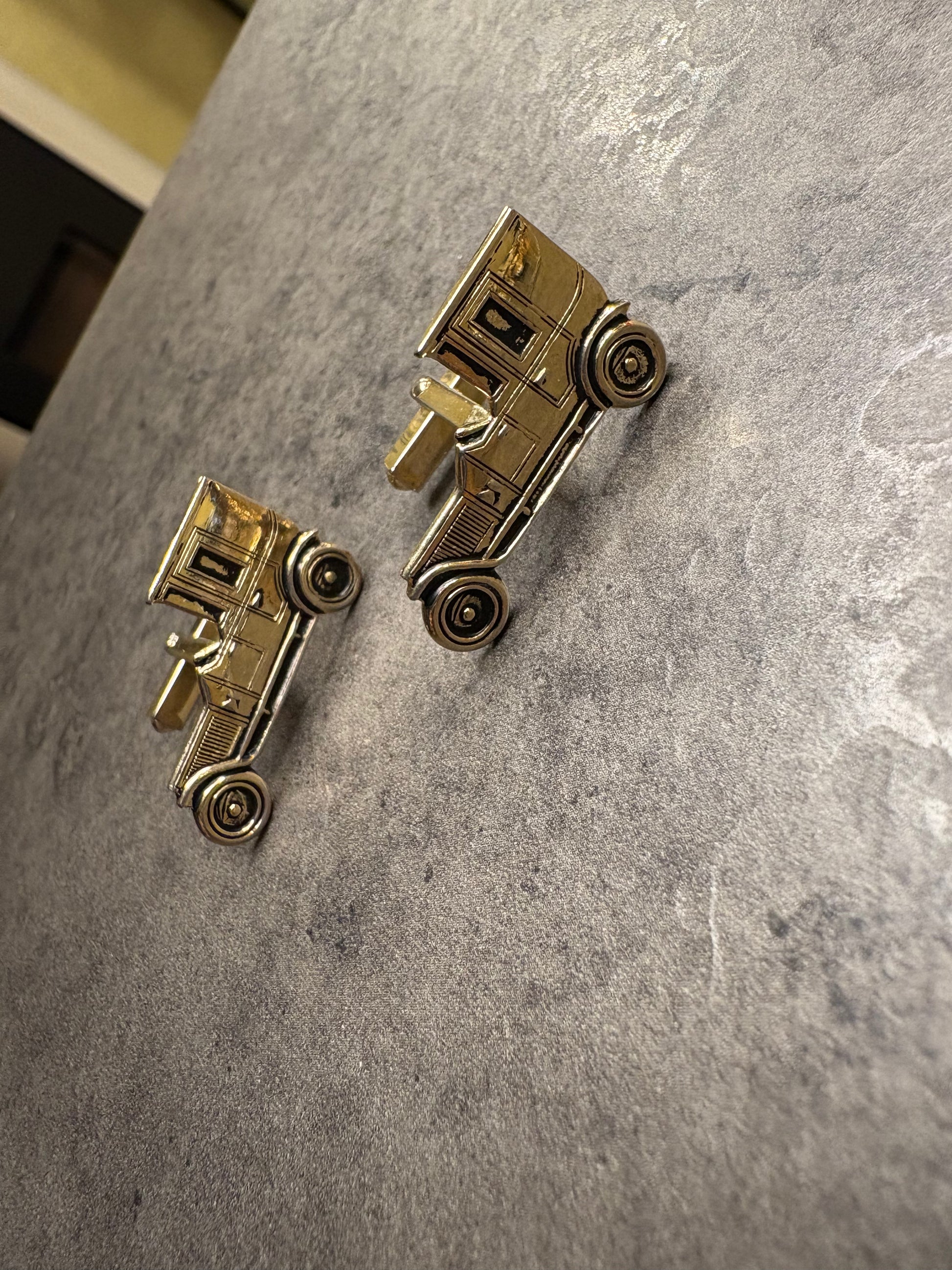 Questi splendidi gemelli vintage, modellati come piccole automobili d’epoca, incarnano tutto il fascino intramontabile dello stile maschile del passato. Realizzati con una luminosa finitura dorata, presentano un’attenzione al dettaglio sorprendente: dalla carrozzeria sagomata alle ruote in rilievo, ogni elemento richiama le iconiche vetture degli anni ’20-’30.