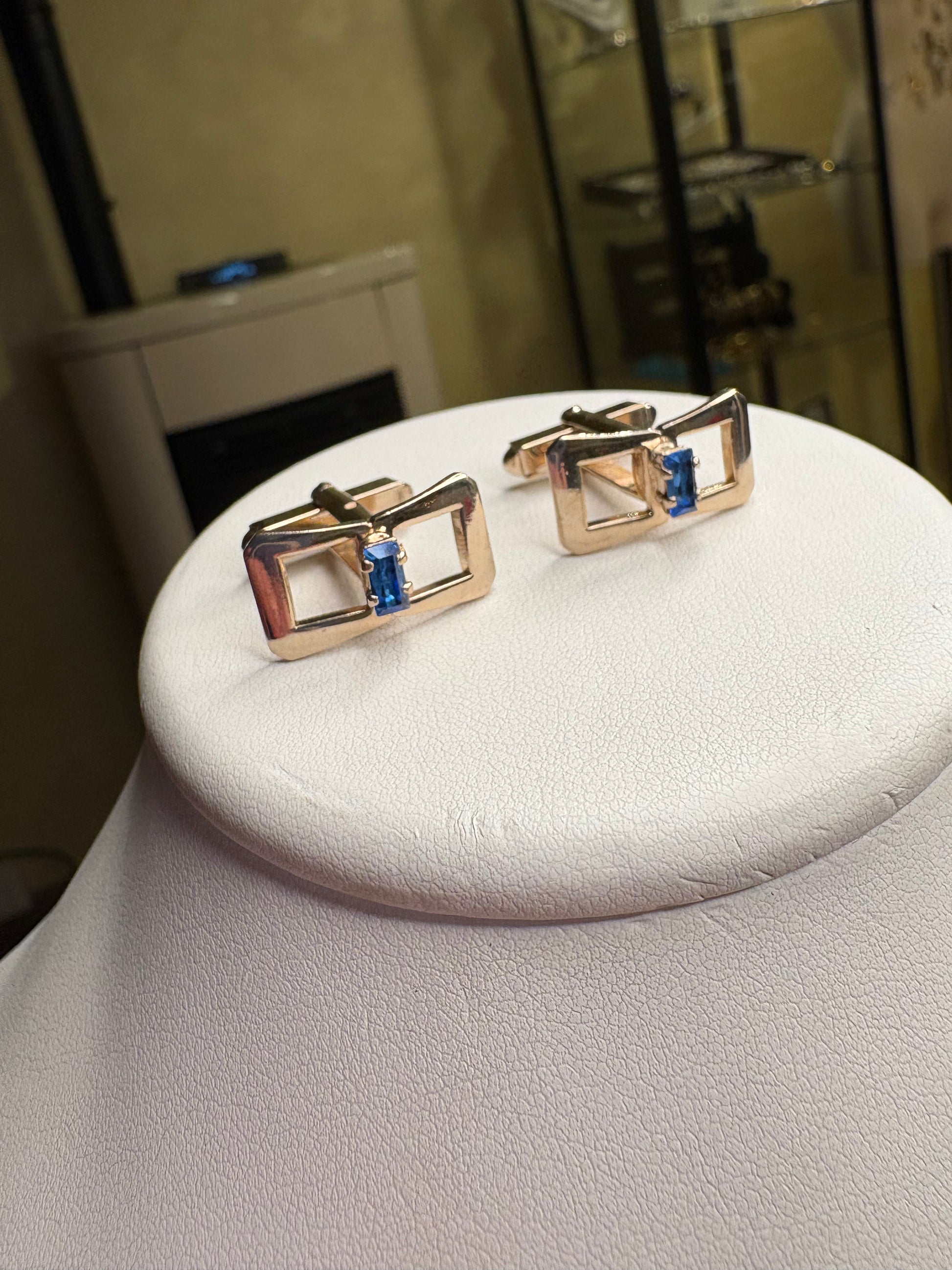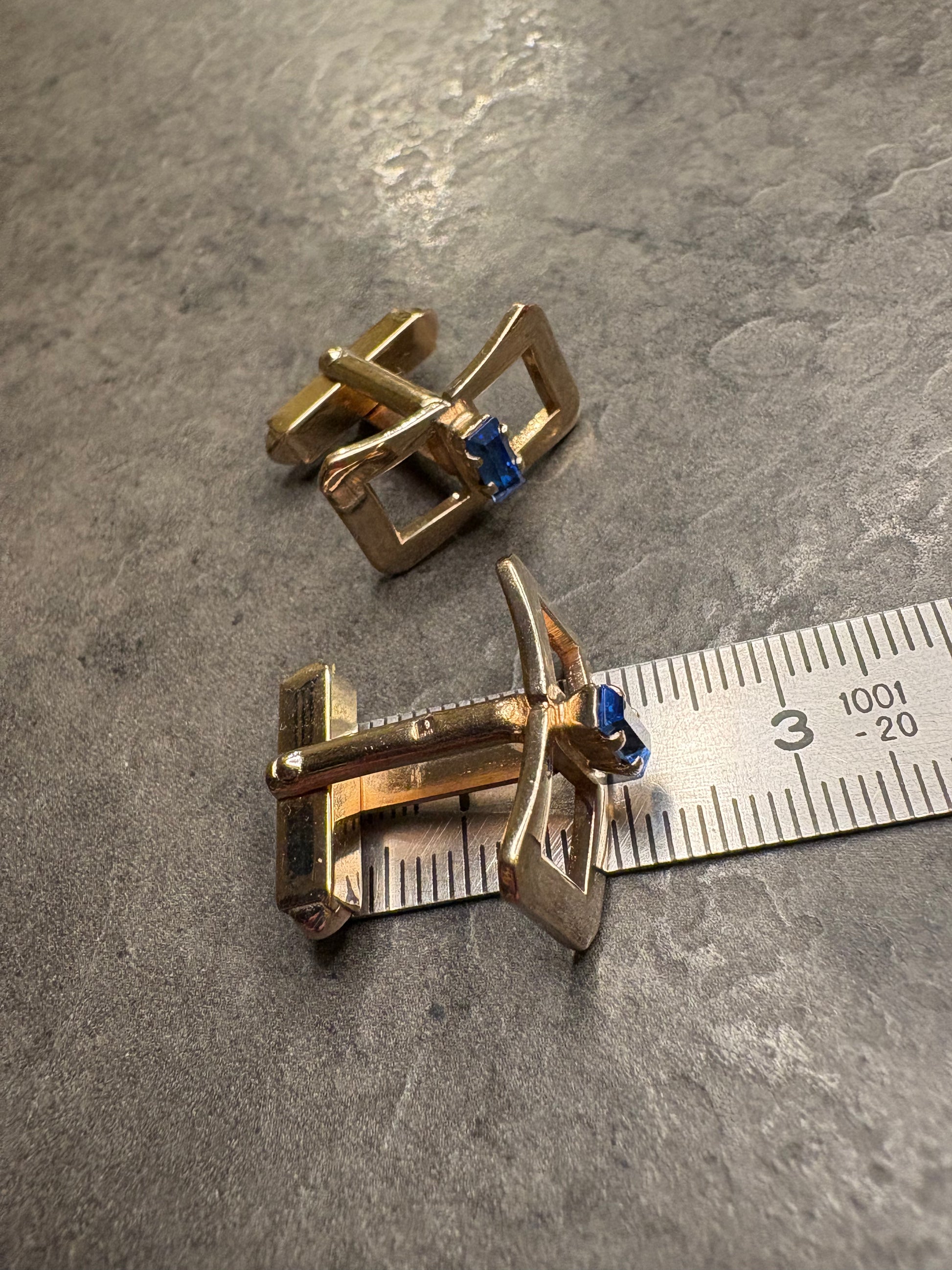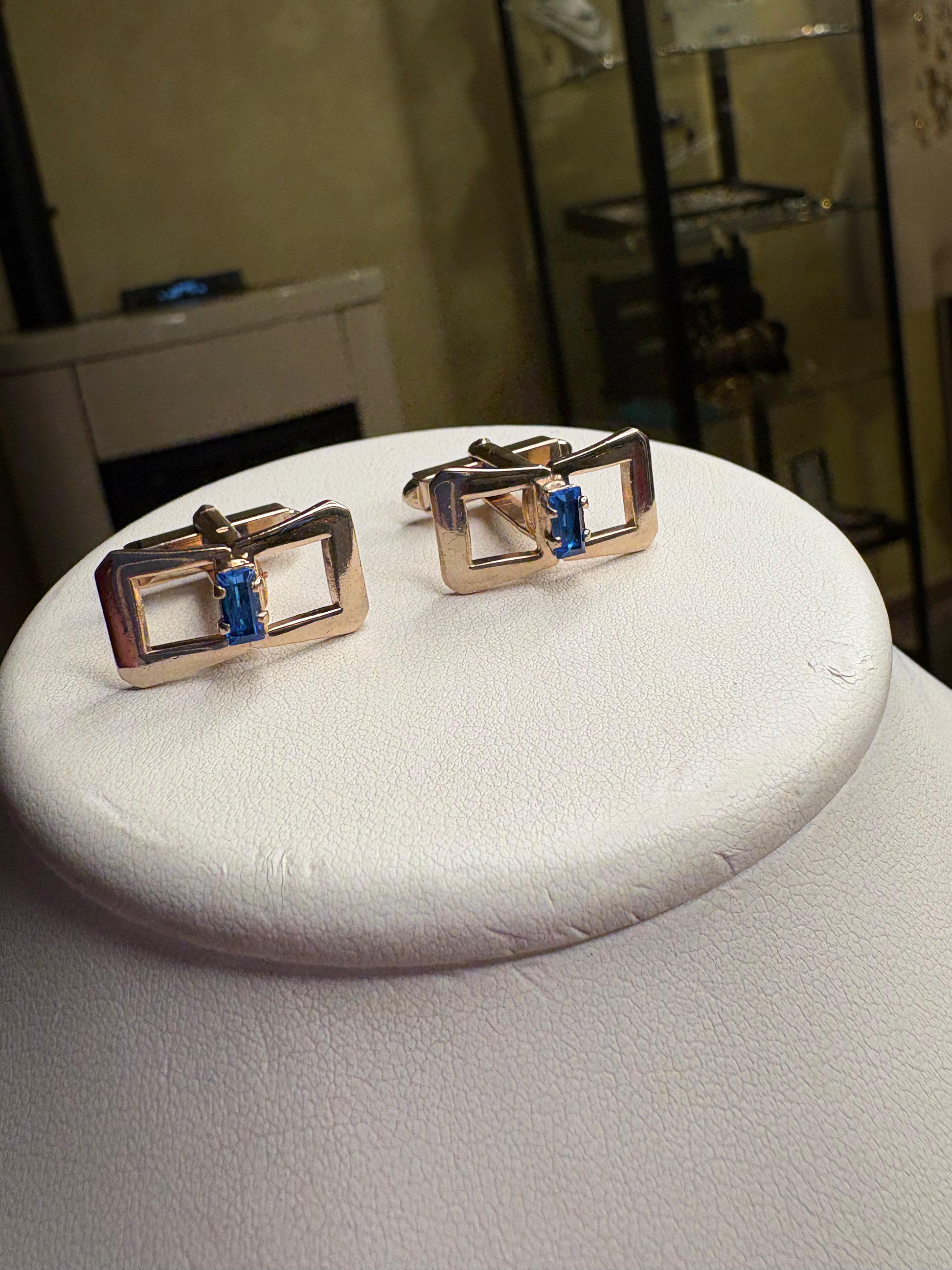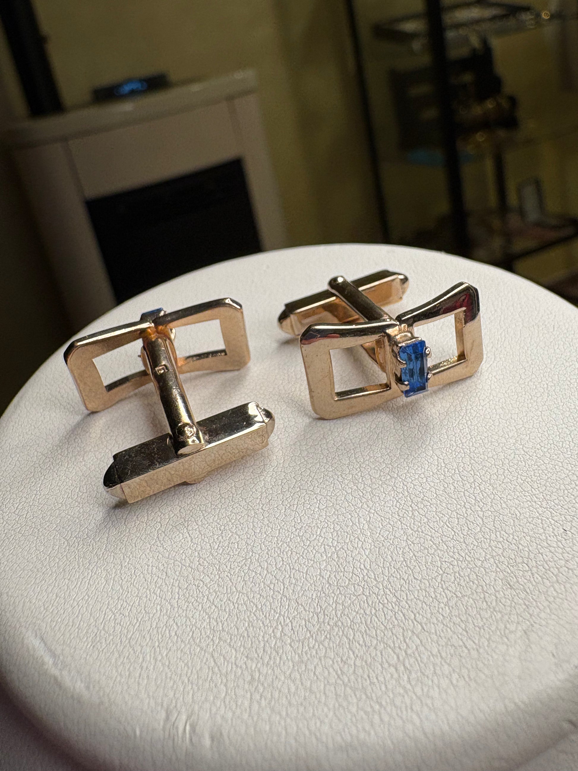 Questi raffinati gemelli vintage colpiscono per il loro design geometrico e pulito: una cornice rettangolare in metallo dorato crea un look moderno e ricercato, arricchito al centro da una luminosa pietra blu taglio baguette, che dona un tocco di colore intenso e sofisticato. La struttura è solida, ben bilanciata, con chiusura a perno basculante, tipica dei gioielli maschili di qualità.