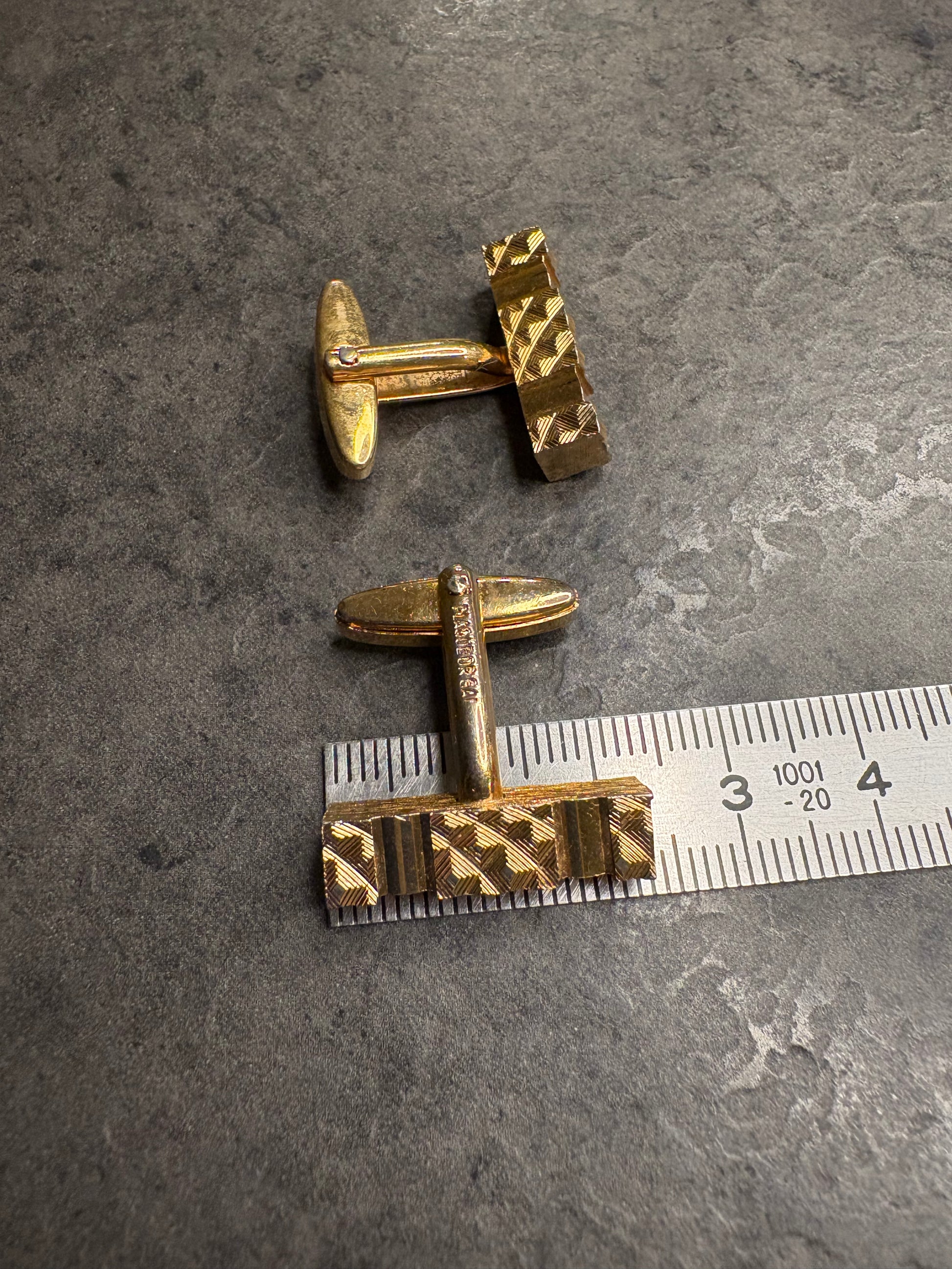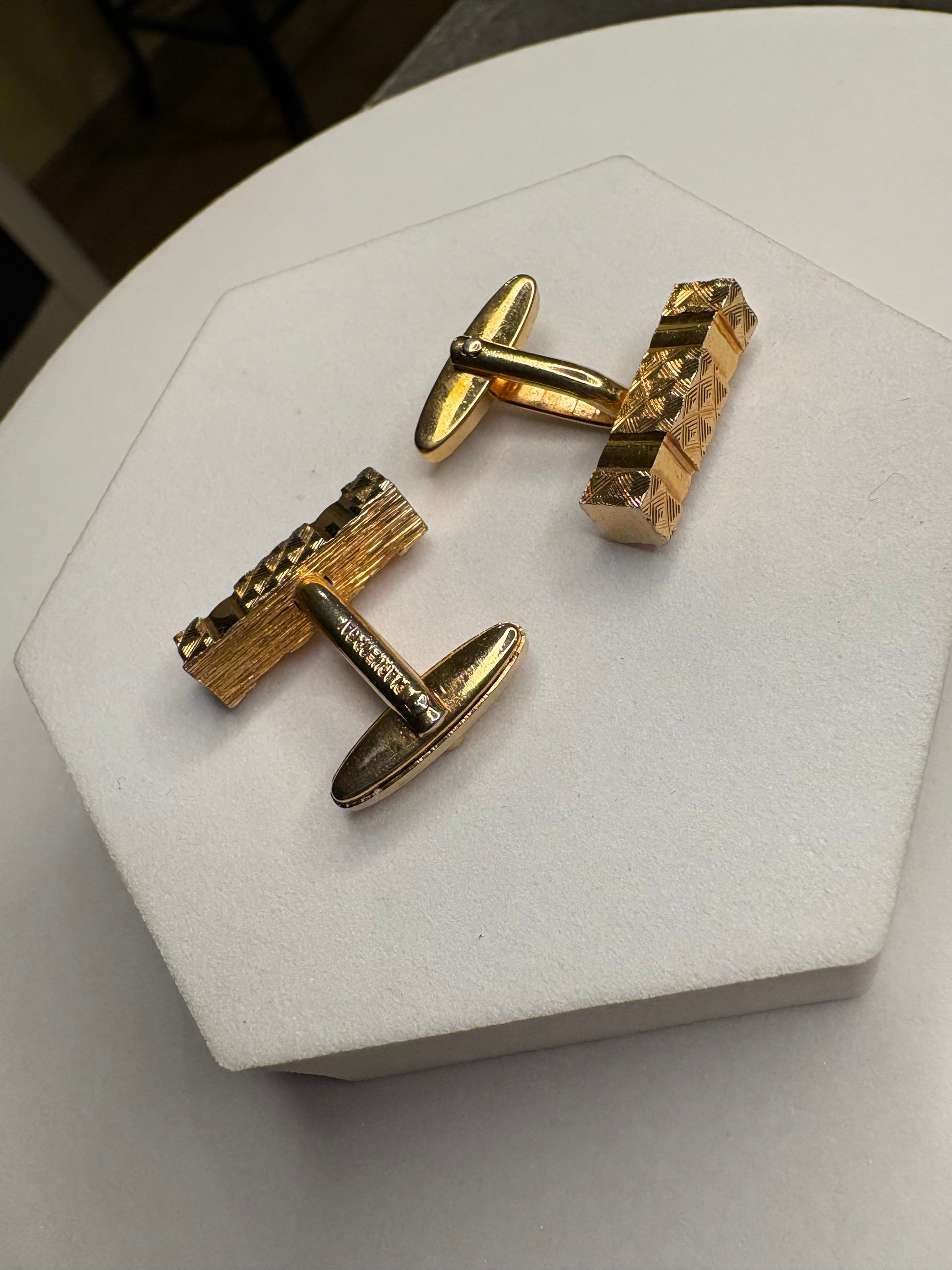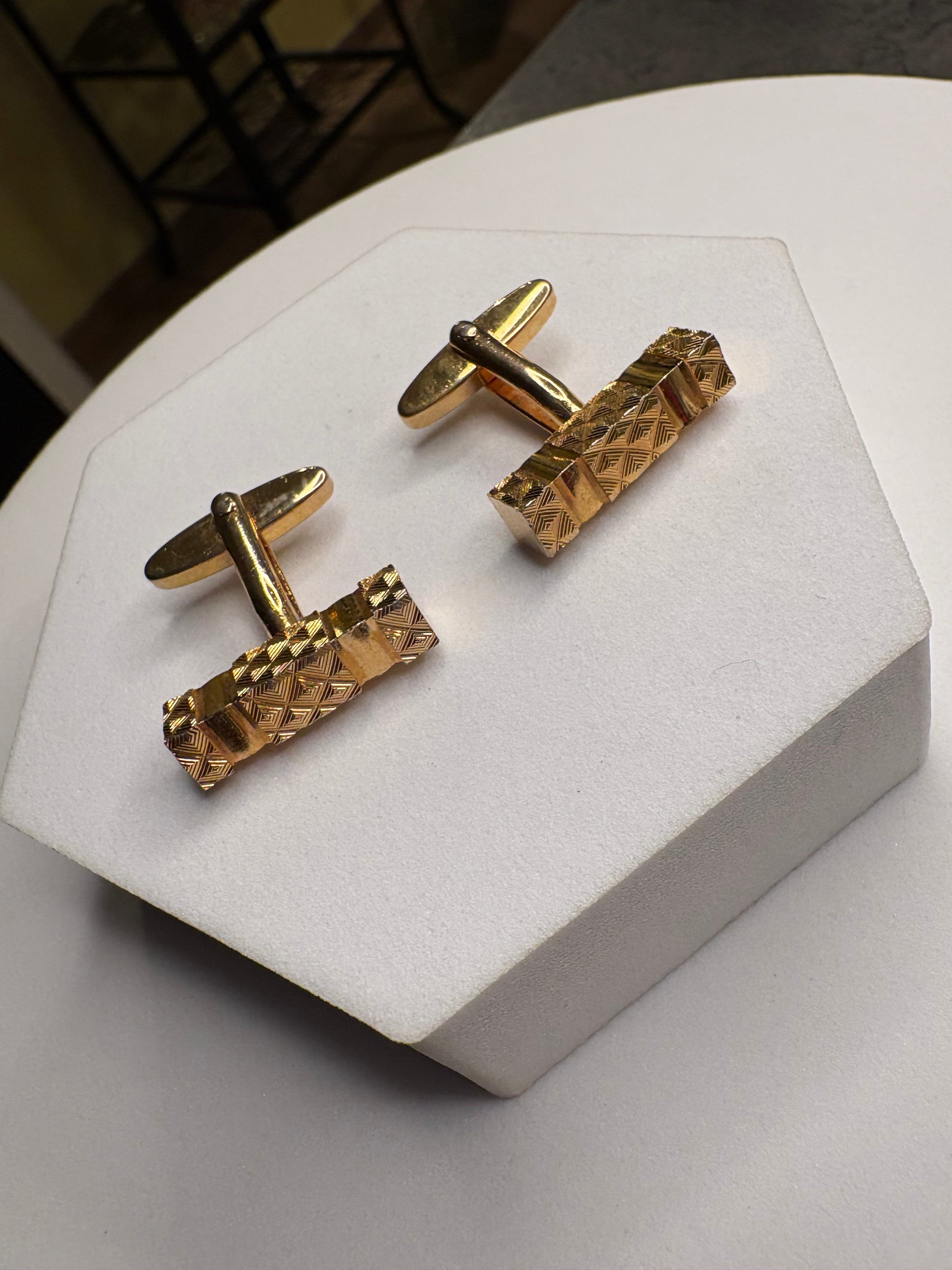 Raffinati gemelli dalla forma rettangolare sfaccettata con incisioni decorative a motivo incrociato che creano un elegante gioco di luce. Realizzati in metallo placcato oro con barra basculante resistente e funzionale, ideali per camicie formali e occasioni speciali. Stile classico con tocco vintage molto ricercato.