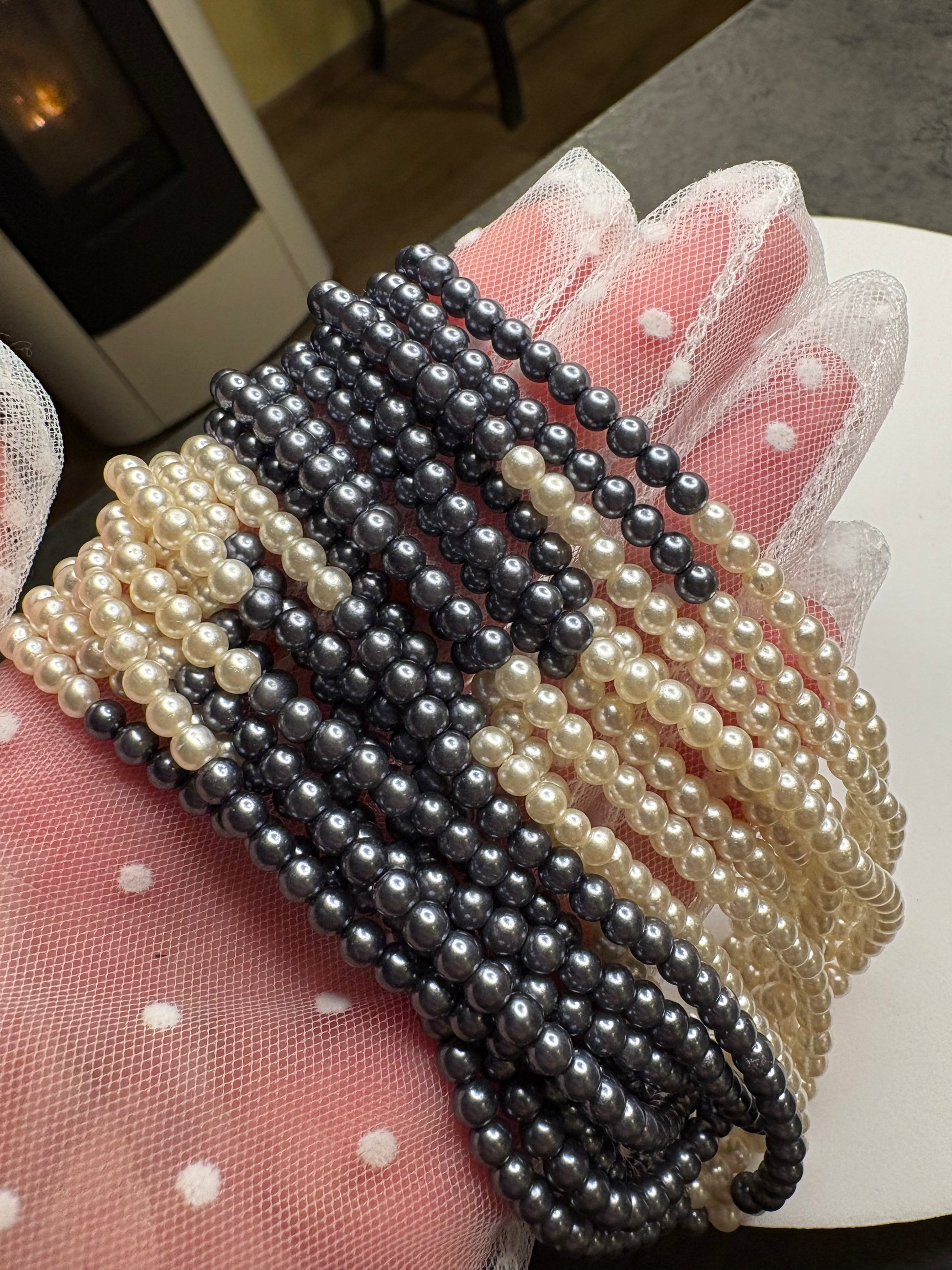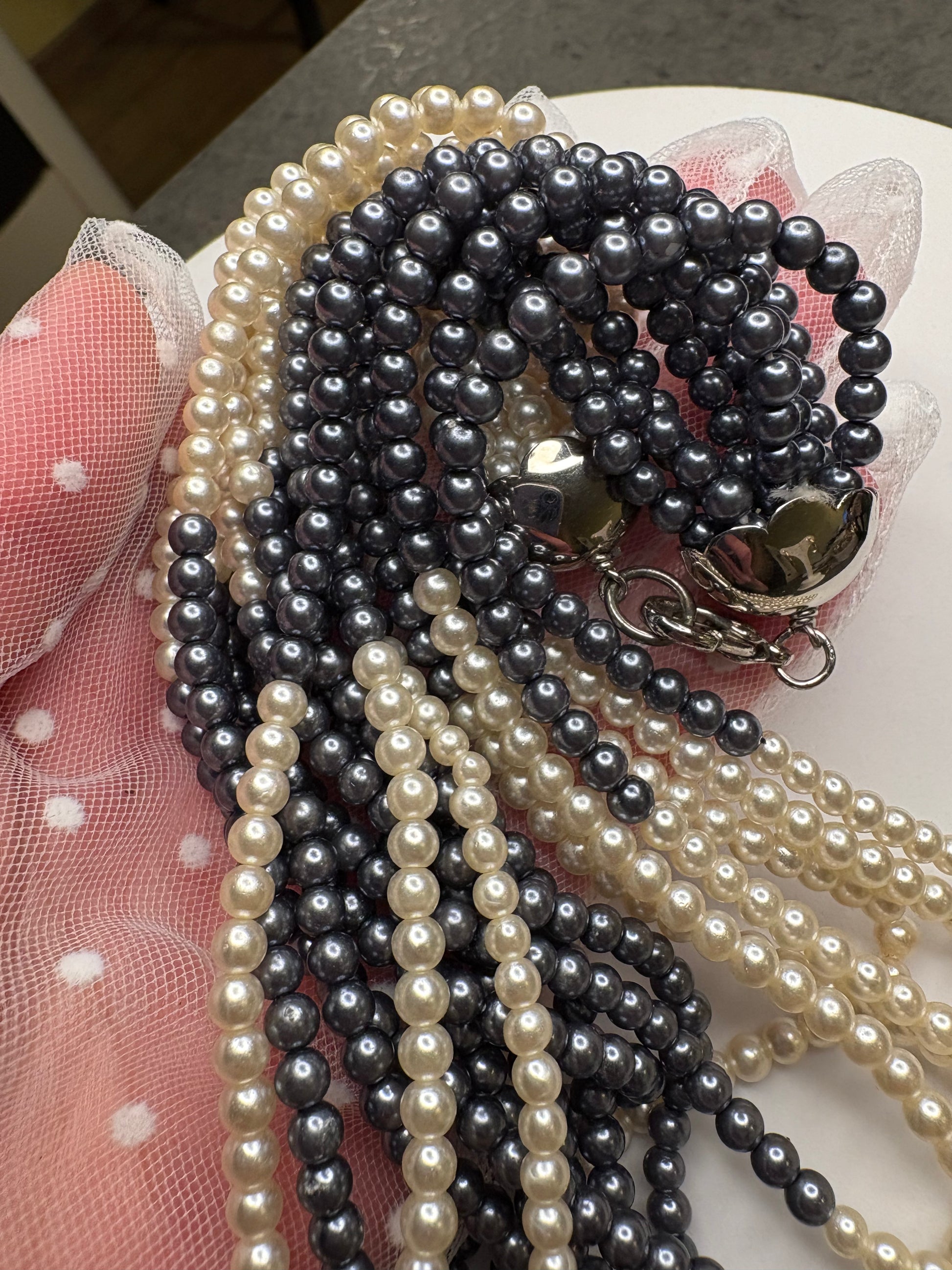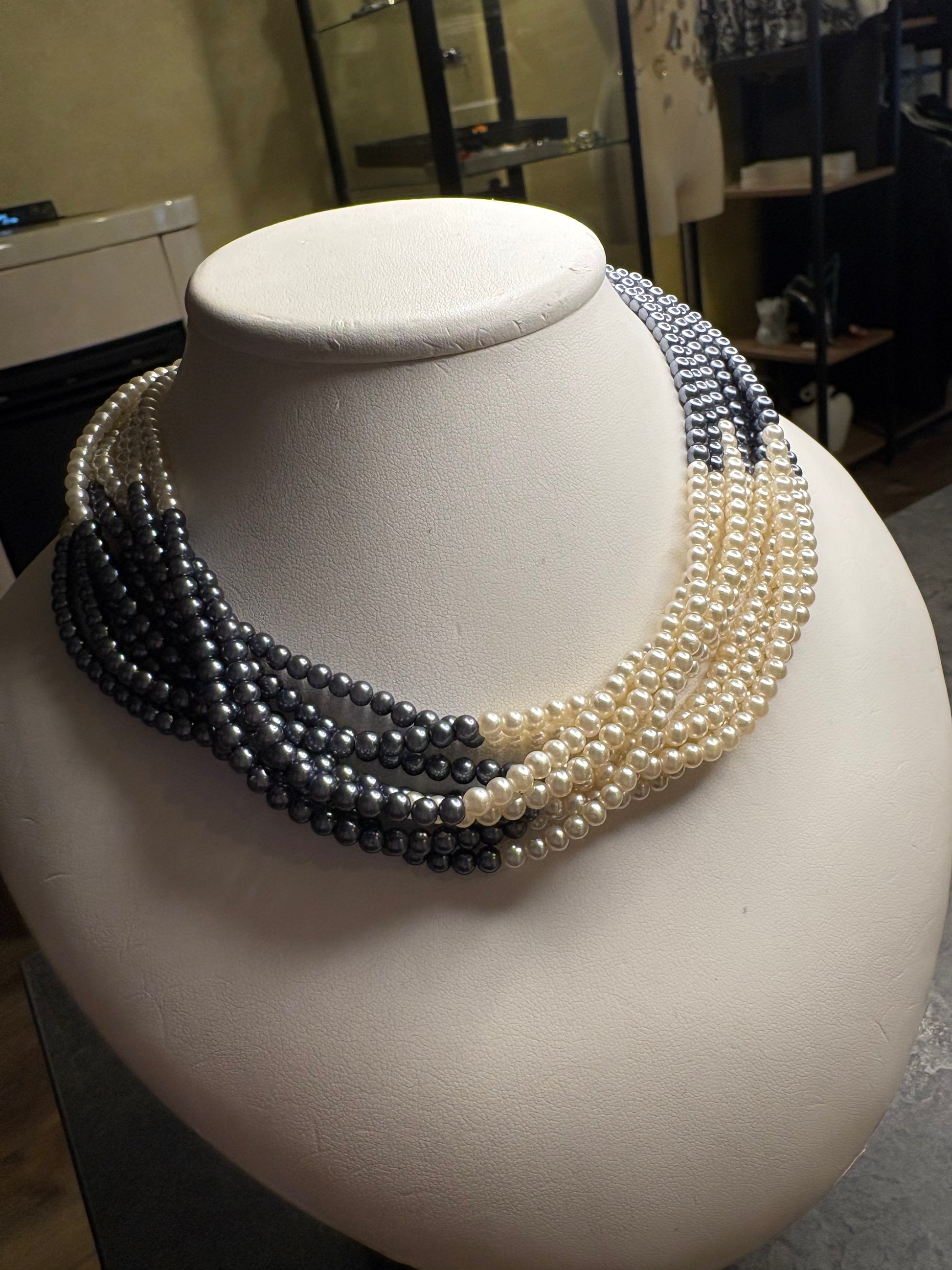 Splendido girocollo vintage a 9 file composto da piccole perle artificiali alternate in tonalità chiare avorio e grigio scuro. Le file sono disposte in modo armonioso creando un elegante contrasto cromatico che valorizza il décolleté. Le perle hanno una bella lucentezza uniforme e sono montate su terminali metallici che raccolgono ordinatamente le nove file. La lunghezza totale è di circa 40 cm, misura che lo rende perfetto come collier aderente dal gusto sofisticato e scenografico, tipico dello stile rétro elegante.