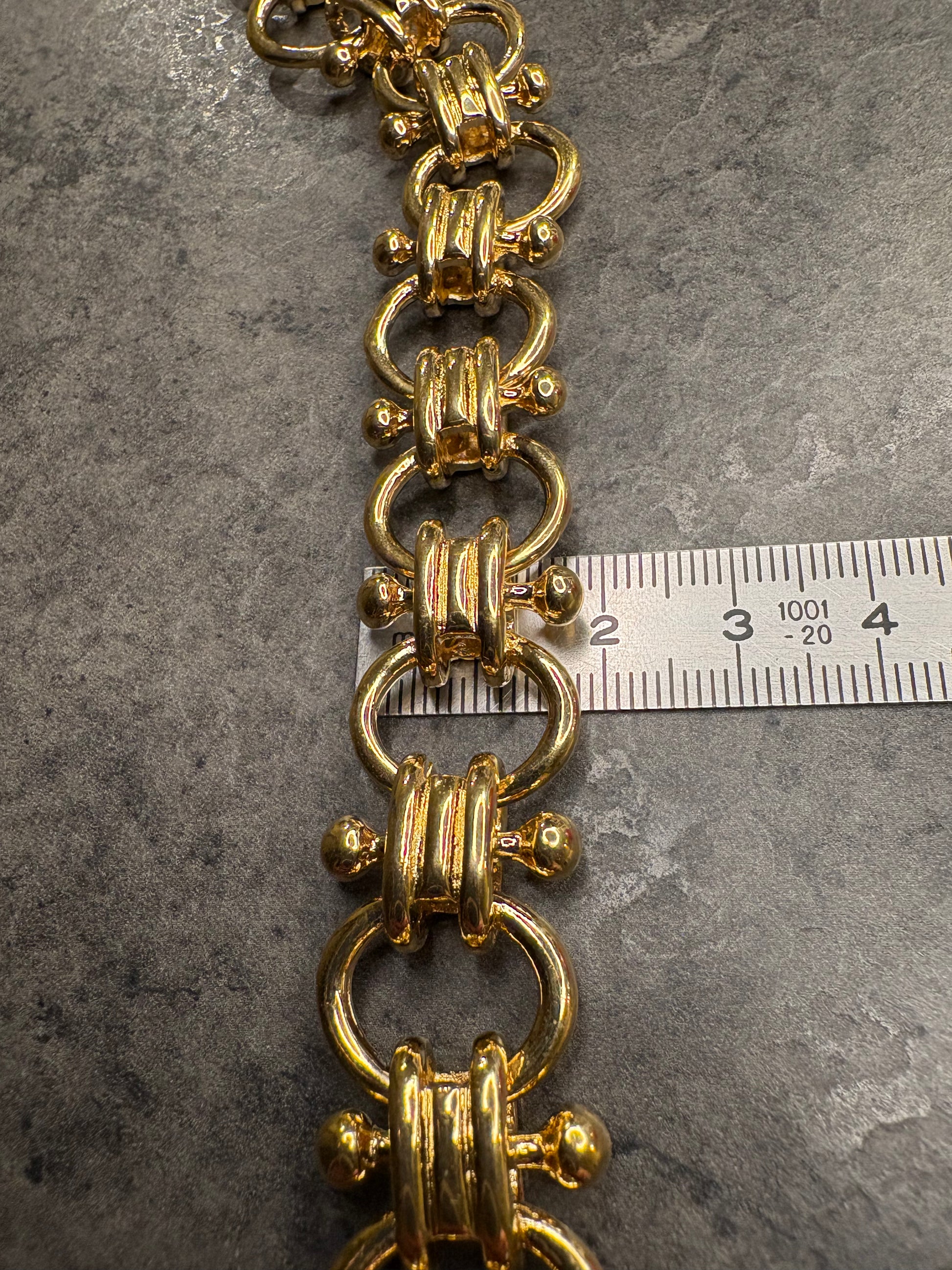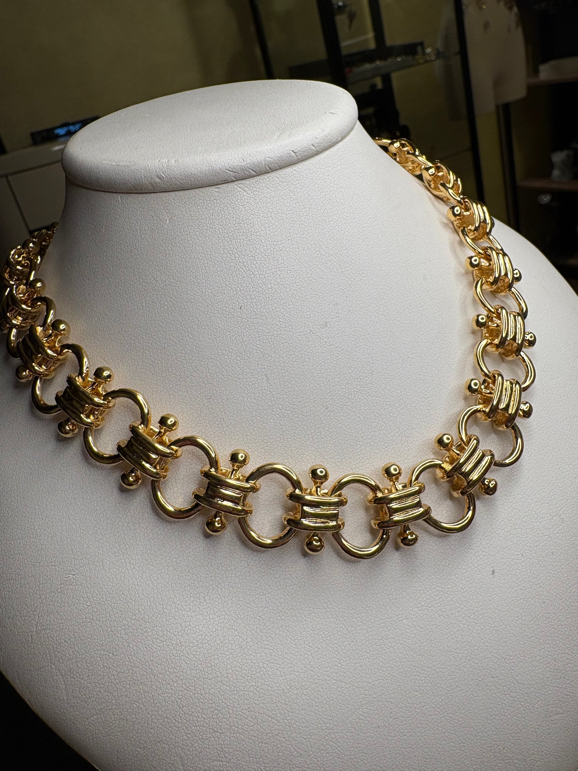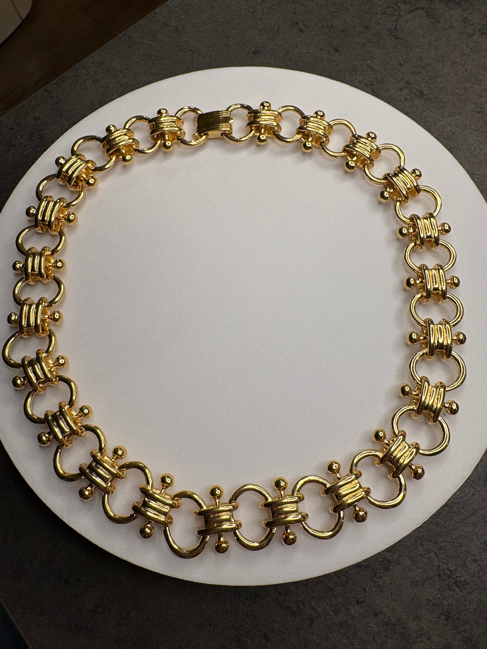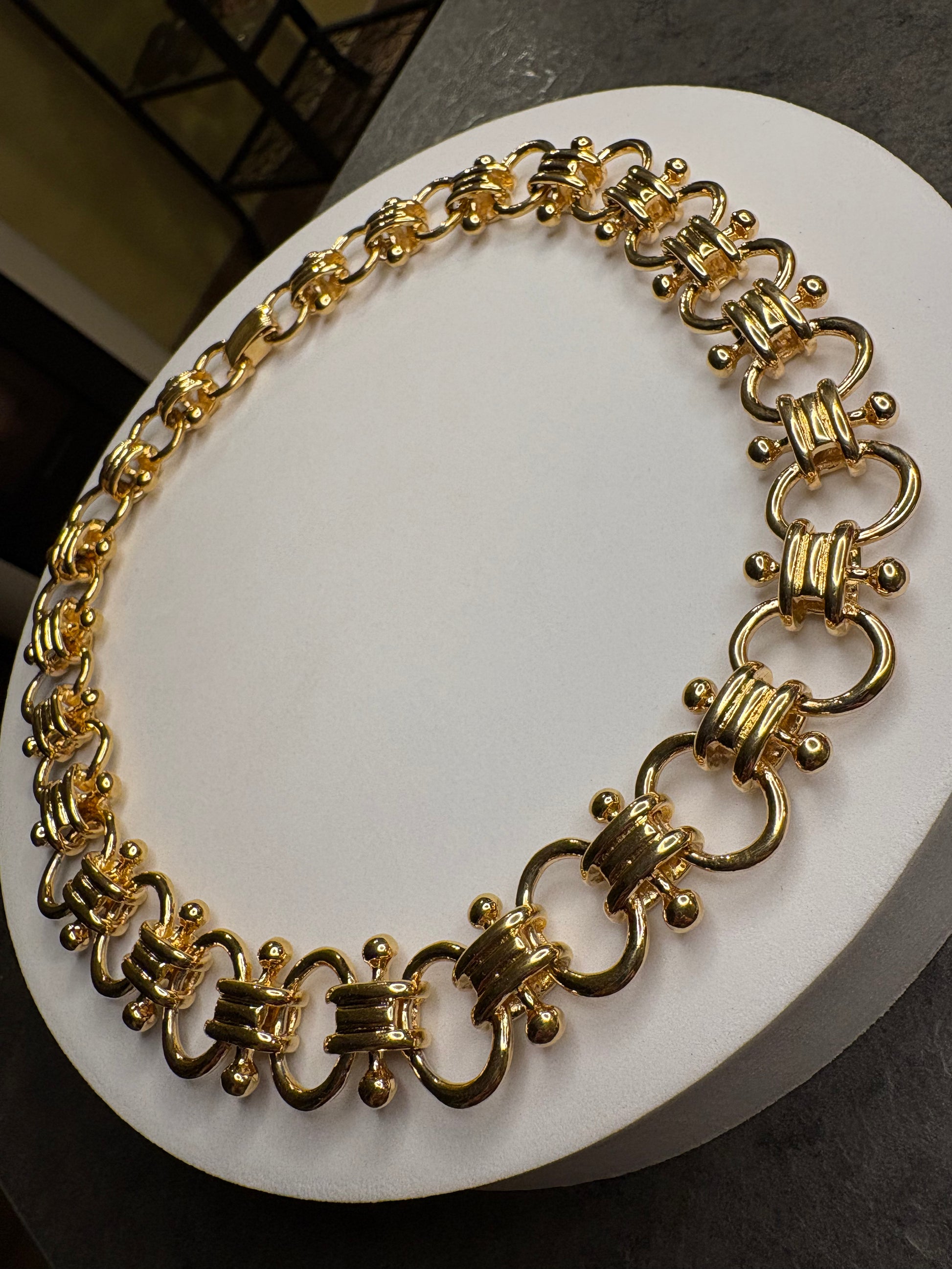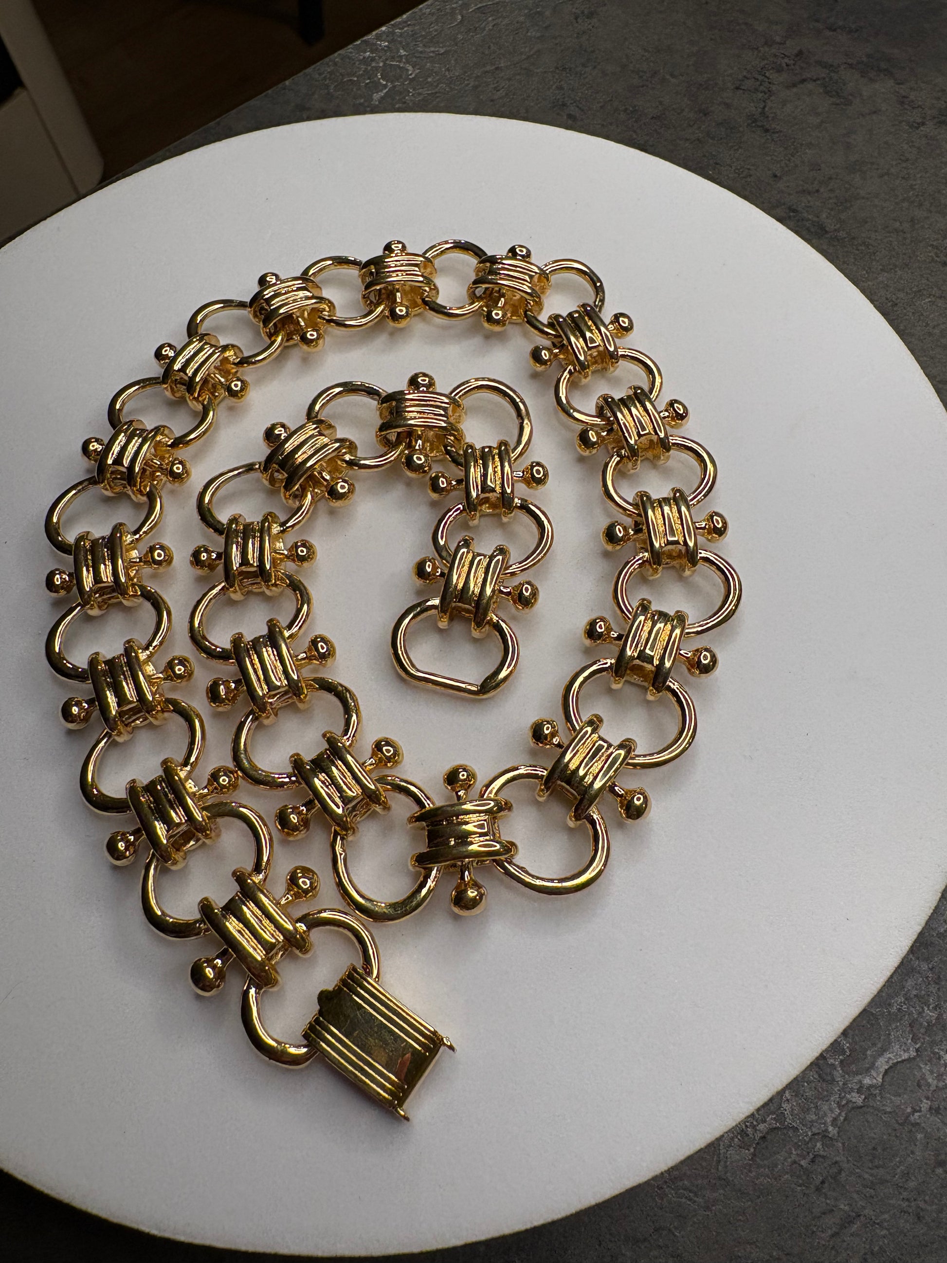 Meraviglioso girocollo caratterizzato da una maglia importante e scenografica, composta da elementi curvilinei intrecciati che creano un raffinato effetto tridimensionale. La finitura in metallo color oro lucido dona brillantezza intensa e riflessi caldi, esaltando il design elegante e strutturato. La chiusura “a scatola”, perfettamente integrata nella continuità della maglia, garantisce sicurezza e pulizia estetica. Lunghezza totale circa 43 cm, ideale per valorizzare il collo con uno stile deciso e sofisticato tipico della bigiotteria di alta qualità anni ’70-’80.