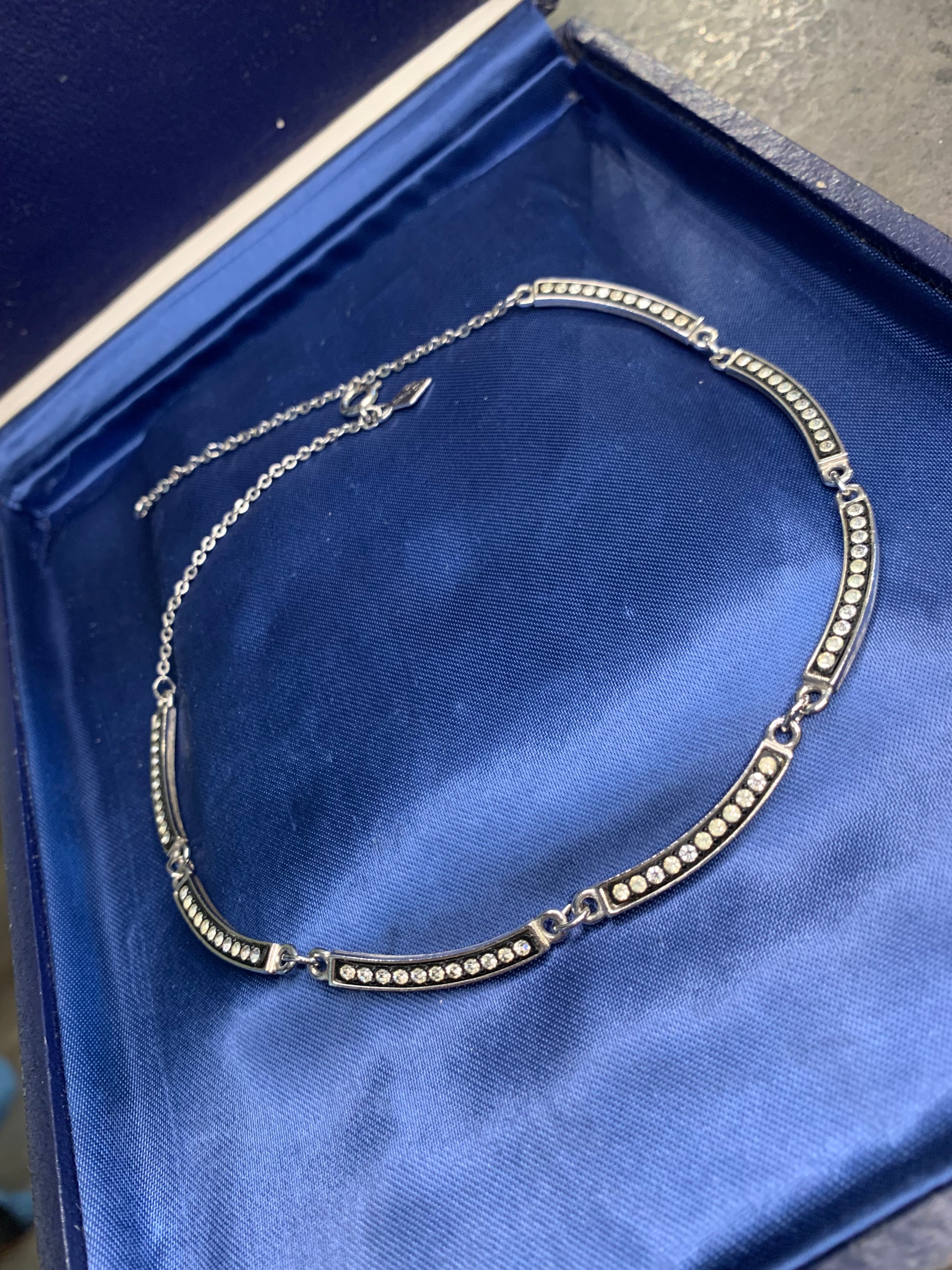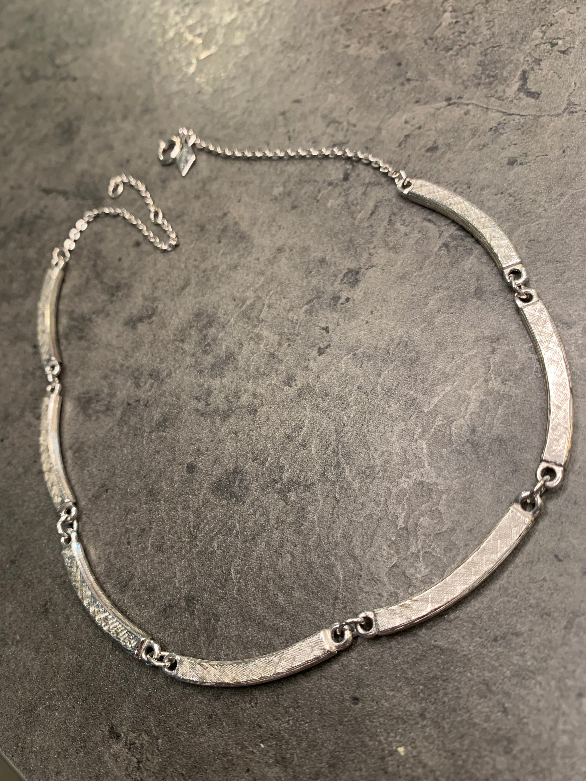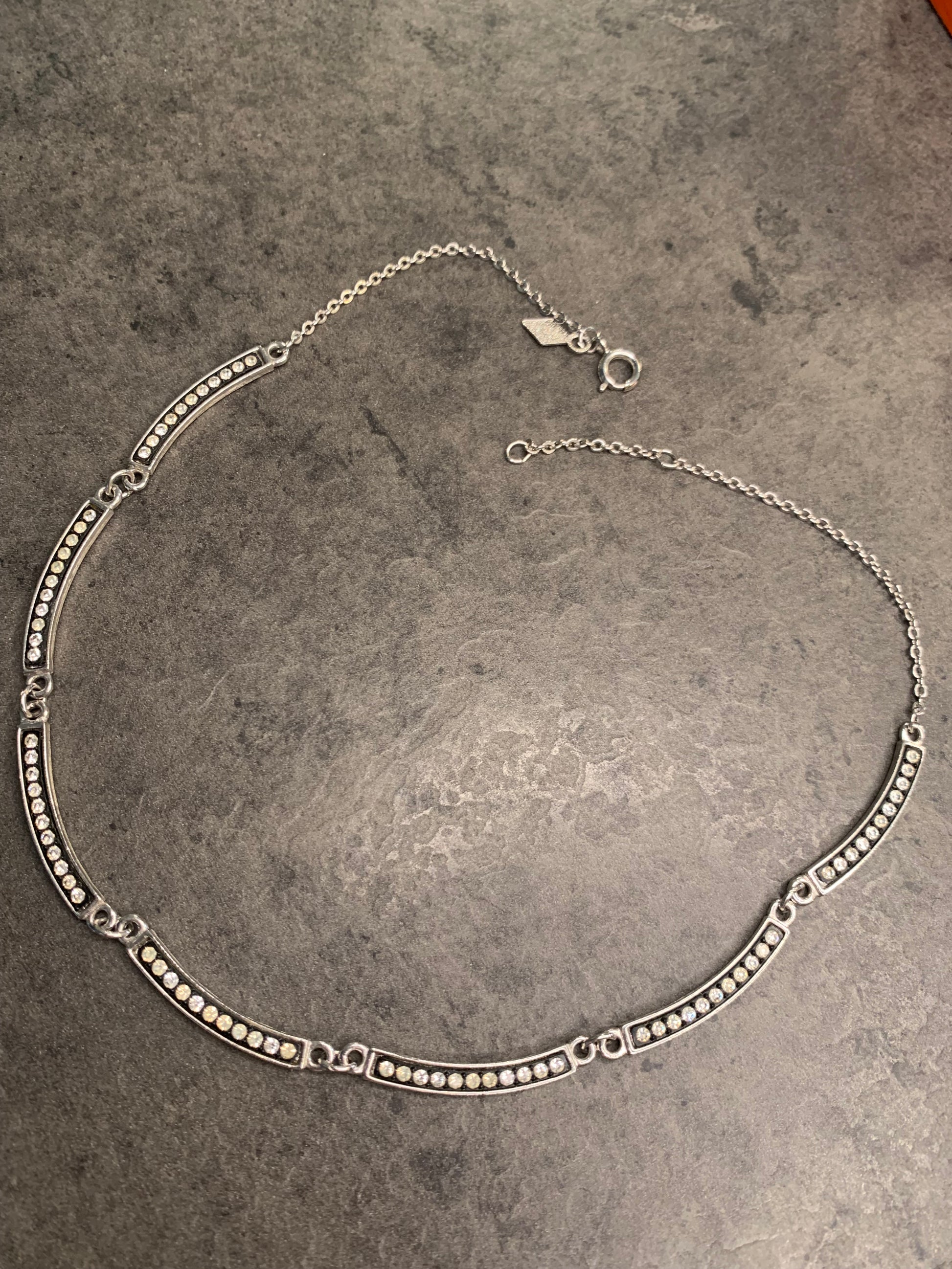 Il design è composto da una sequenza di elementi arcuati in metallo argentato brunito, ciascuno decorato da una fila lineare di strass rotondi trasparenti incastonati con precisione. Questo motivo ritmico e scintillante conferisce al gioiello un’eleganza discreta ma luminosa, perfetta per valorizzare scollature sia classiche che moderne.