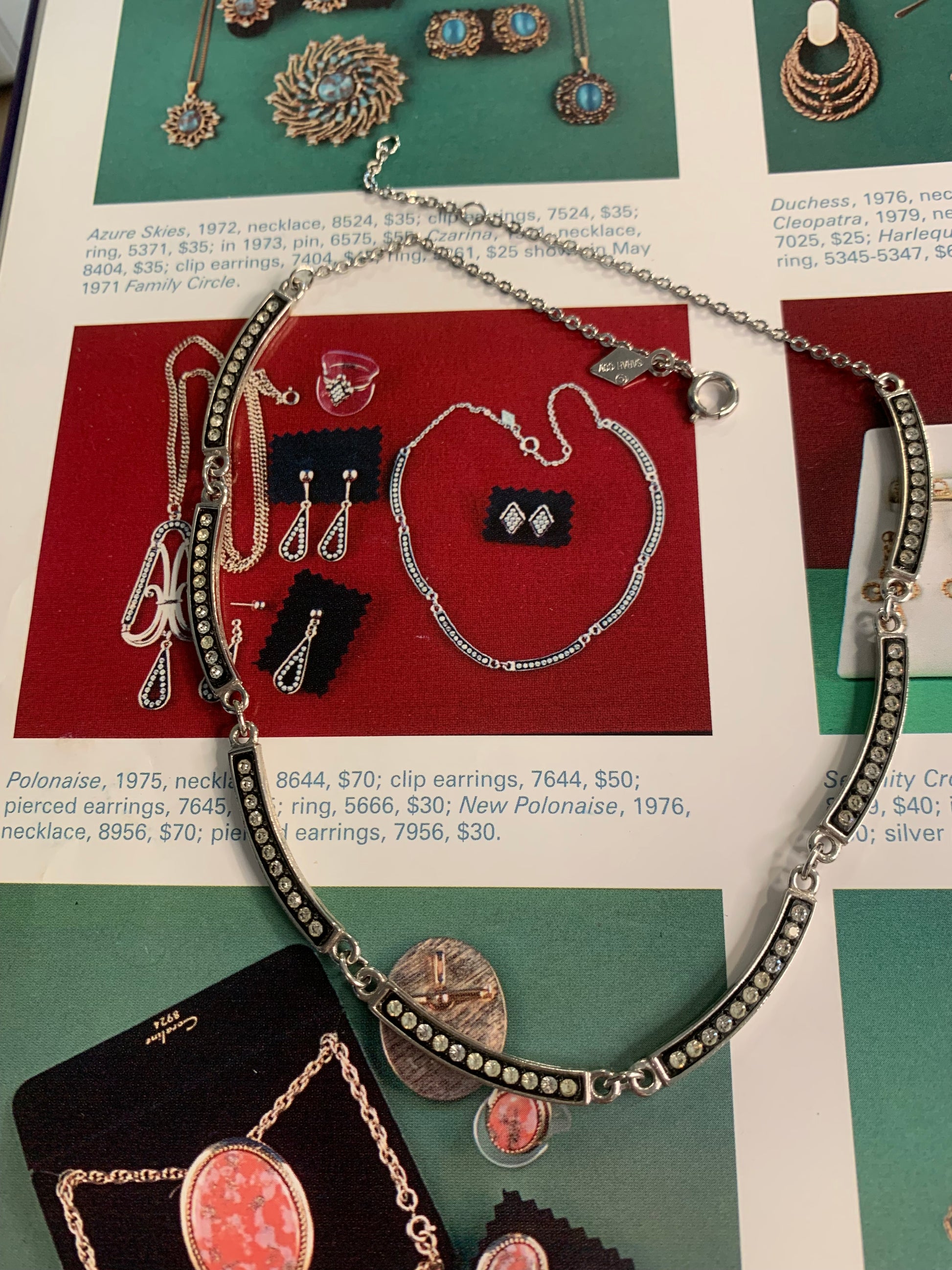 Questo elegante girocollo vintage è un affascinante esempio del design firmato Sarah Coventry, realizzato nel 1976 come parte della collezione “New Polonaise”. Con una lunghezza totale di circa 39 cm, il collier è stato progettato per posizionarsi elegantemente alla base del collo, offrendo un look raffinato e femminile.