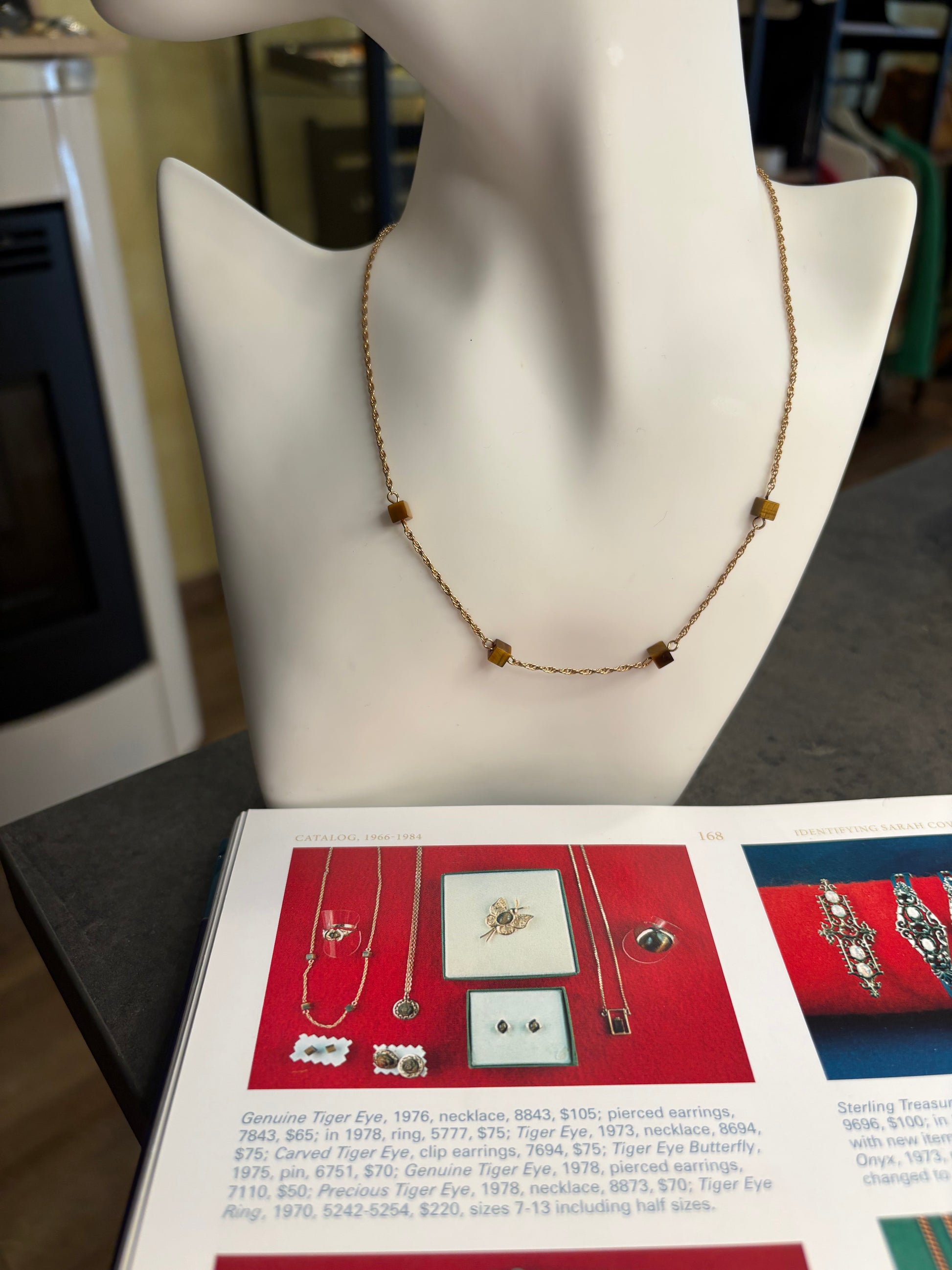 Raro girocollo vintage firmato Sarah Coventry, realizzato nel 1976 e denominato “Genuine Tiger Eye”. La collana è composta da una sottile ed elegante catena in metallo dorato, lunga circa 40 cm, perfetta per posizionarsi con delicatezza alla base del collo.