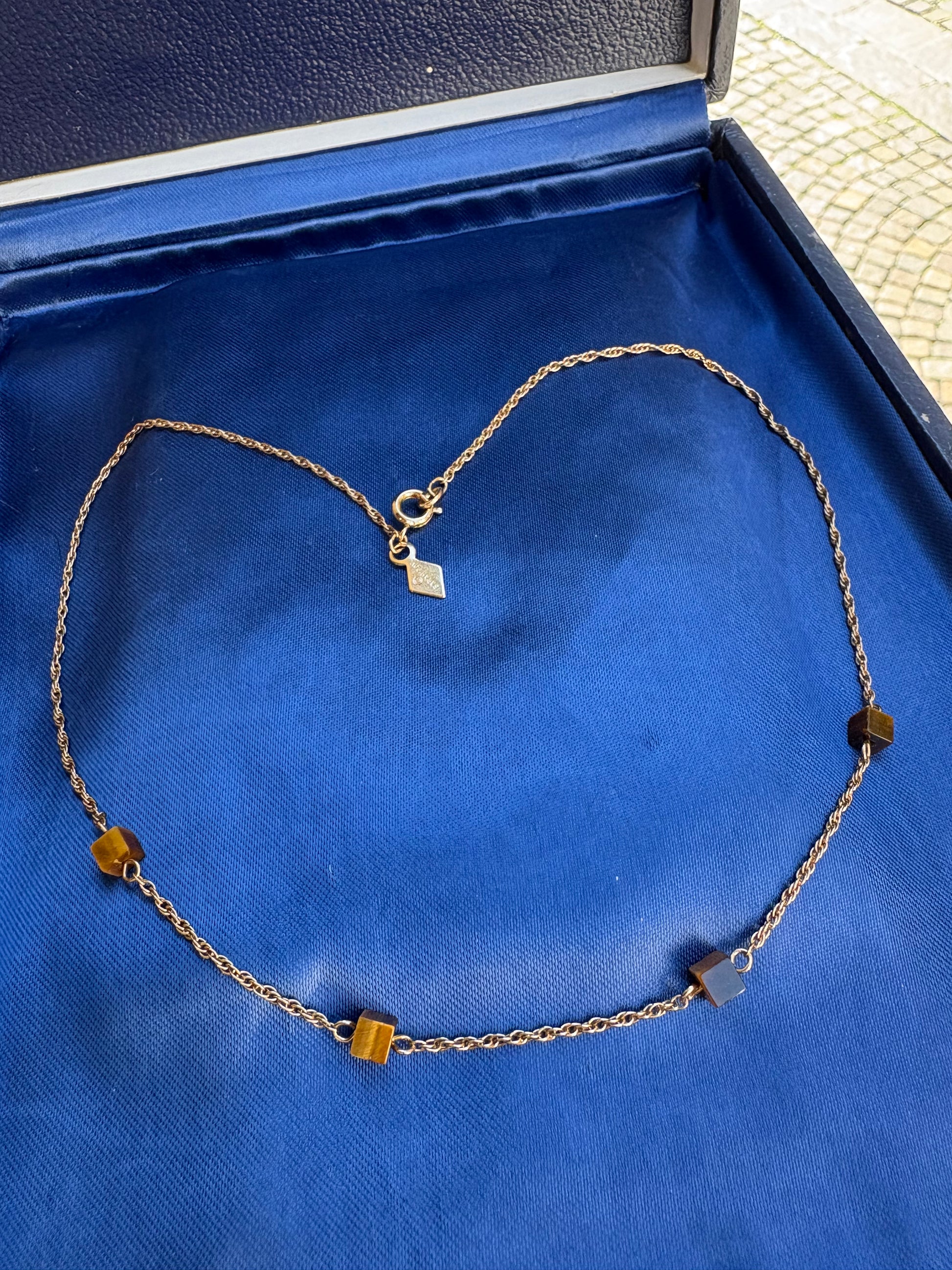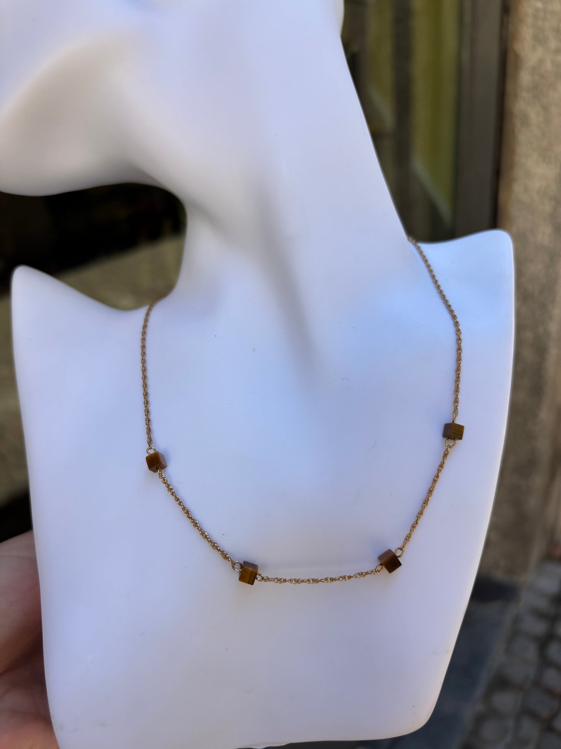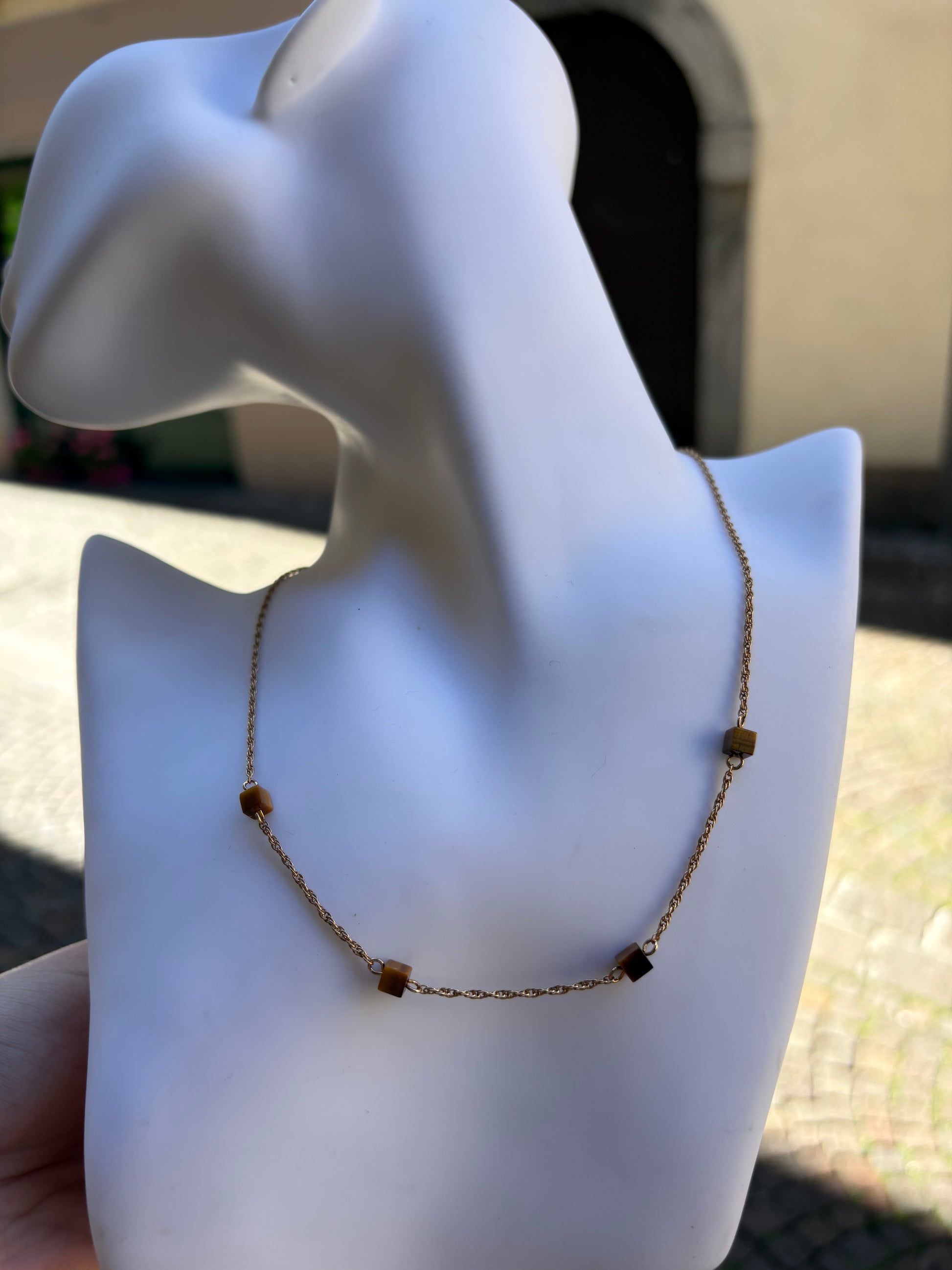 L’elemento distintivo è rappresentato da quattro cubetti di occhio di tigre dal caratteristico tono caldo e setoso, incastonati lungo la catena. Ogni cubetto, con le sue venature naturali, aggiunge un tocco di sofisticata semplicità al design, esaltando il contrasto tra il dorato della catena e le sfumature terrose della pietra.