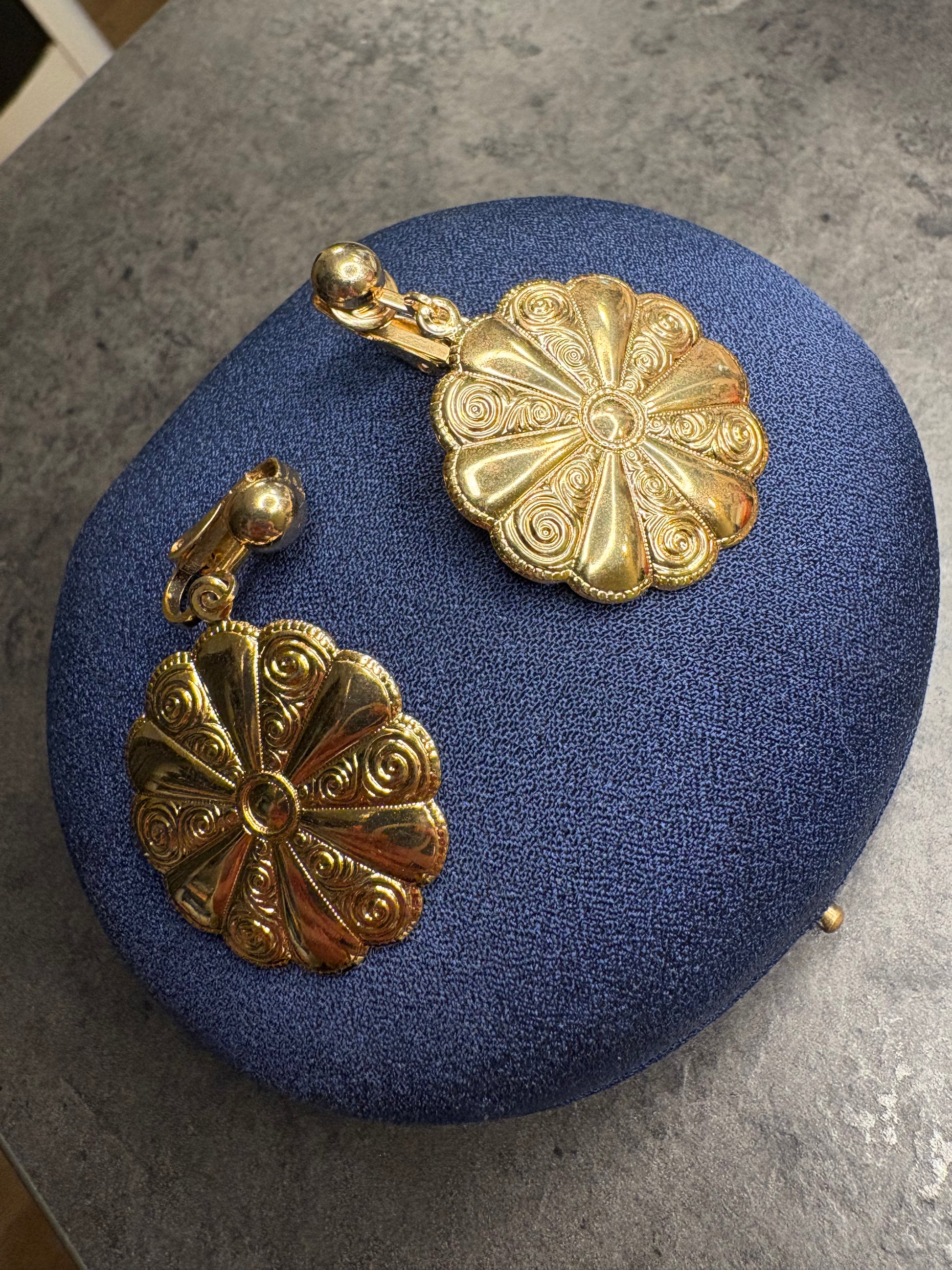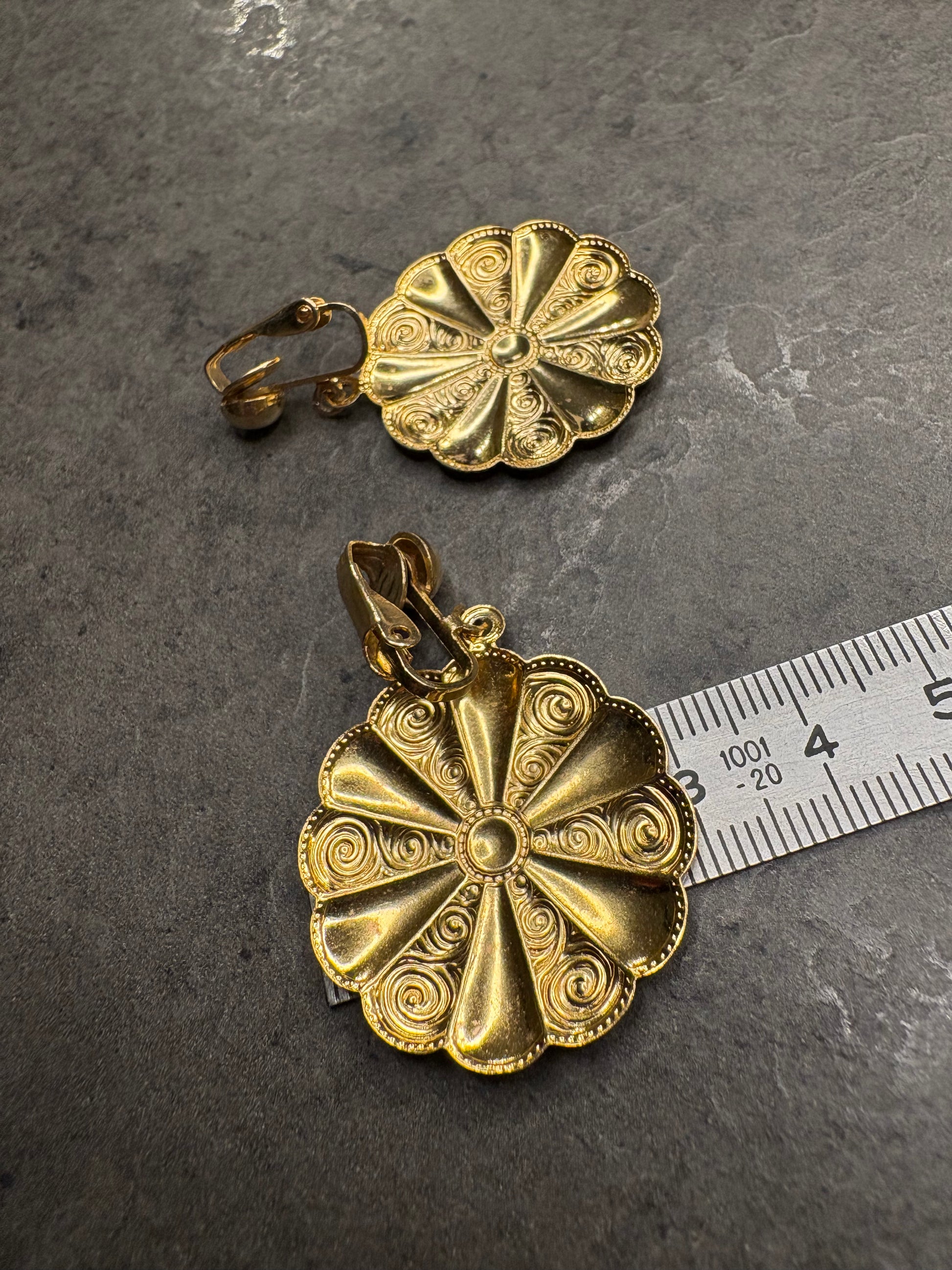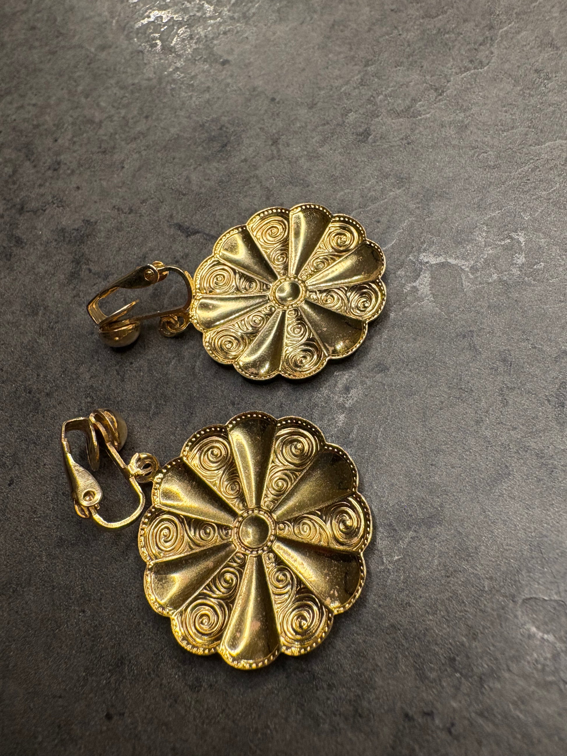 Questi splendidi orecchini a clip vintage sono realizzati in metallo dorato lucente, caratterizzati da un design elegante e maestoso. La parte pendente, a forma di grande fiore stilizzato, presenta una raffinata lavorazione a rilievo con motivi spiralati che alternano sezioni lisce e sezioni incise, creando un effetto tridimensionale e luminoso.