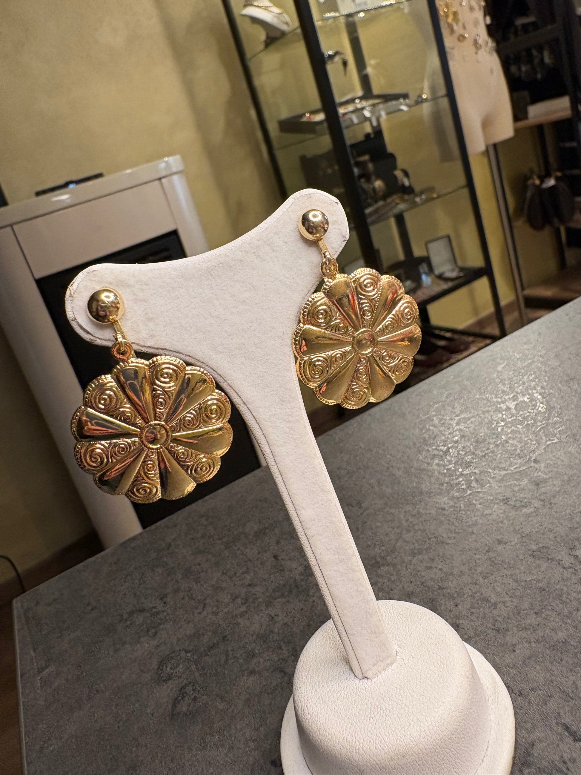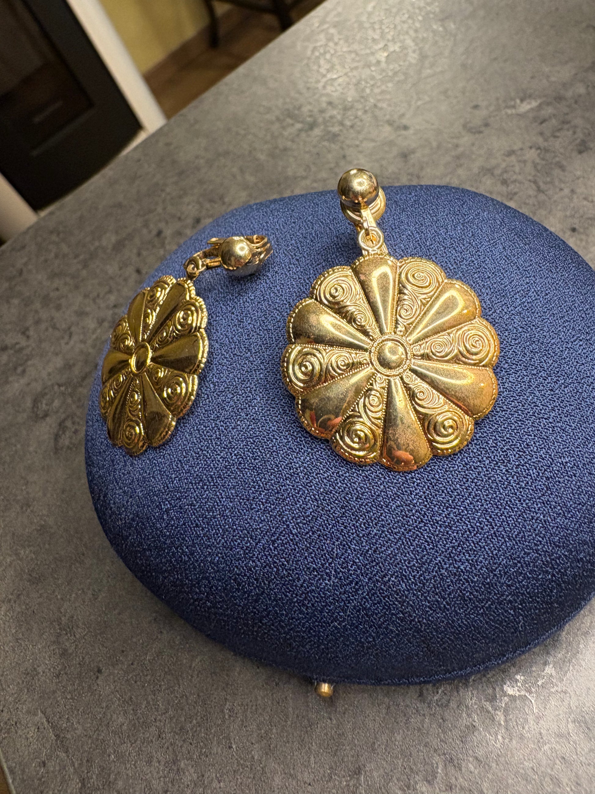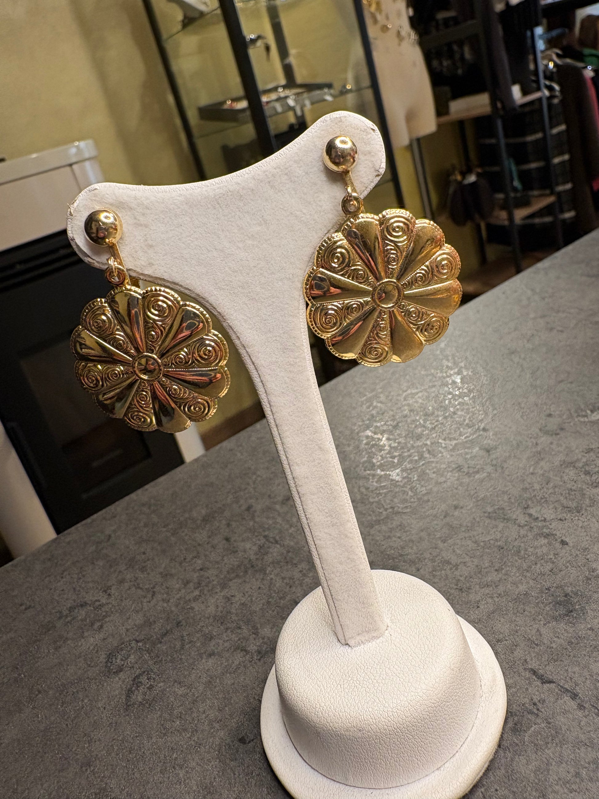 Questi splendidi orecchini a clip vintage sono realizzati in metallo dorato lucente, caratterizzati da un design elegante e maestoso. La parte pendente, a forma di grande fiore stilizzato, presenta una raffinata lavorazione a rilievo con motivi spiralati che alternano sezioni lisce e sezioni incise, creando un effetto tridimensionale e luminoso.