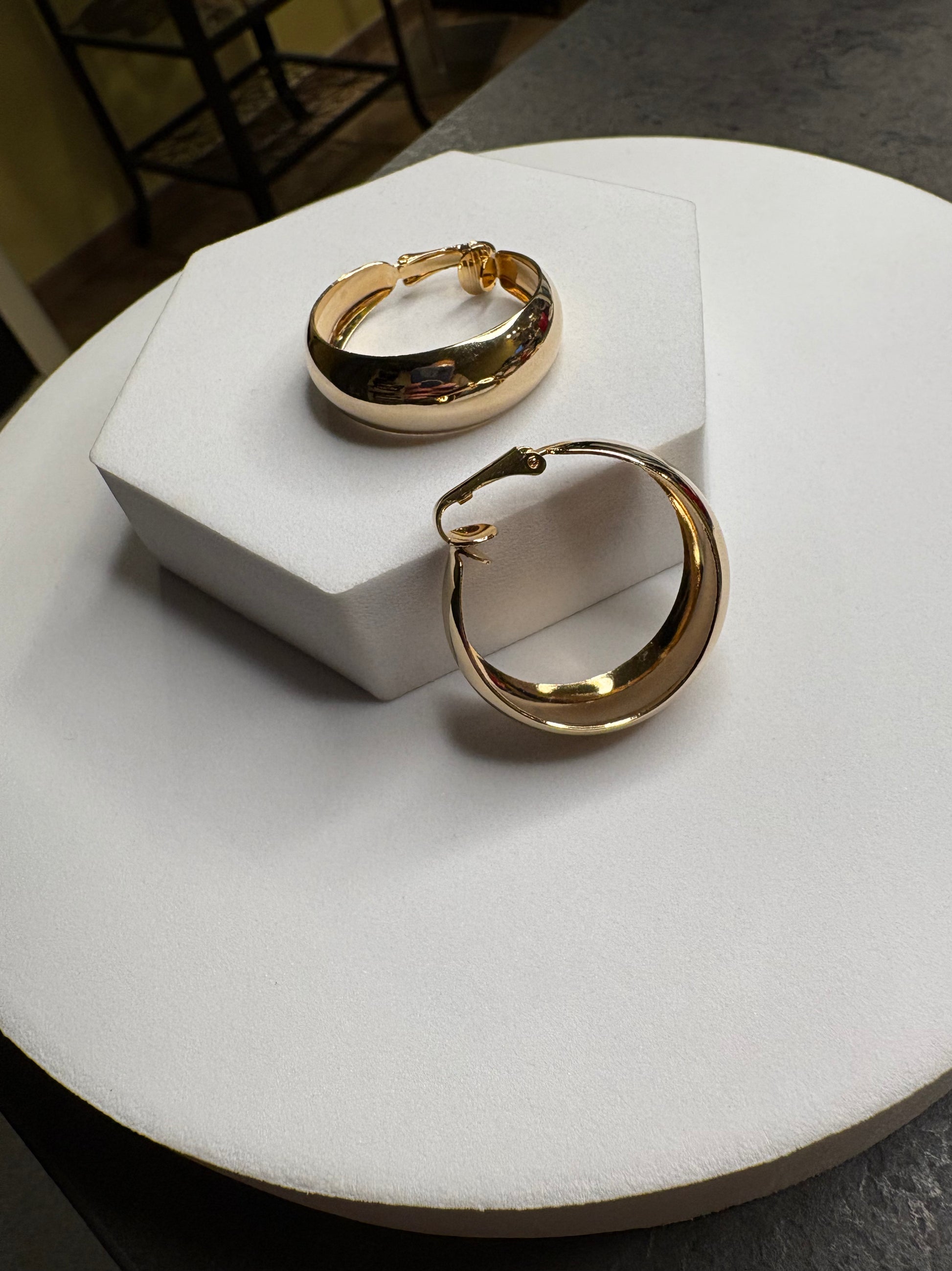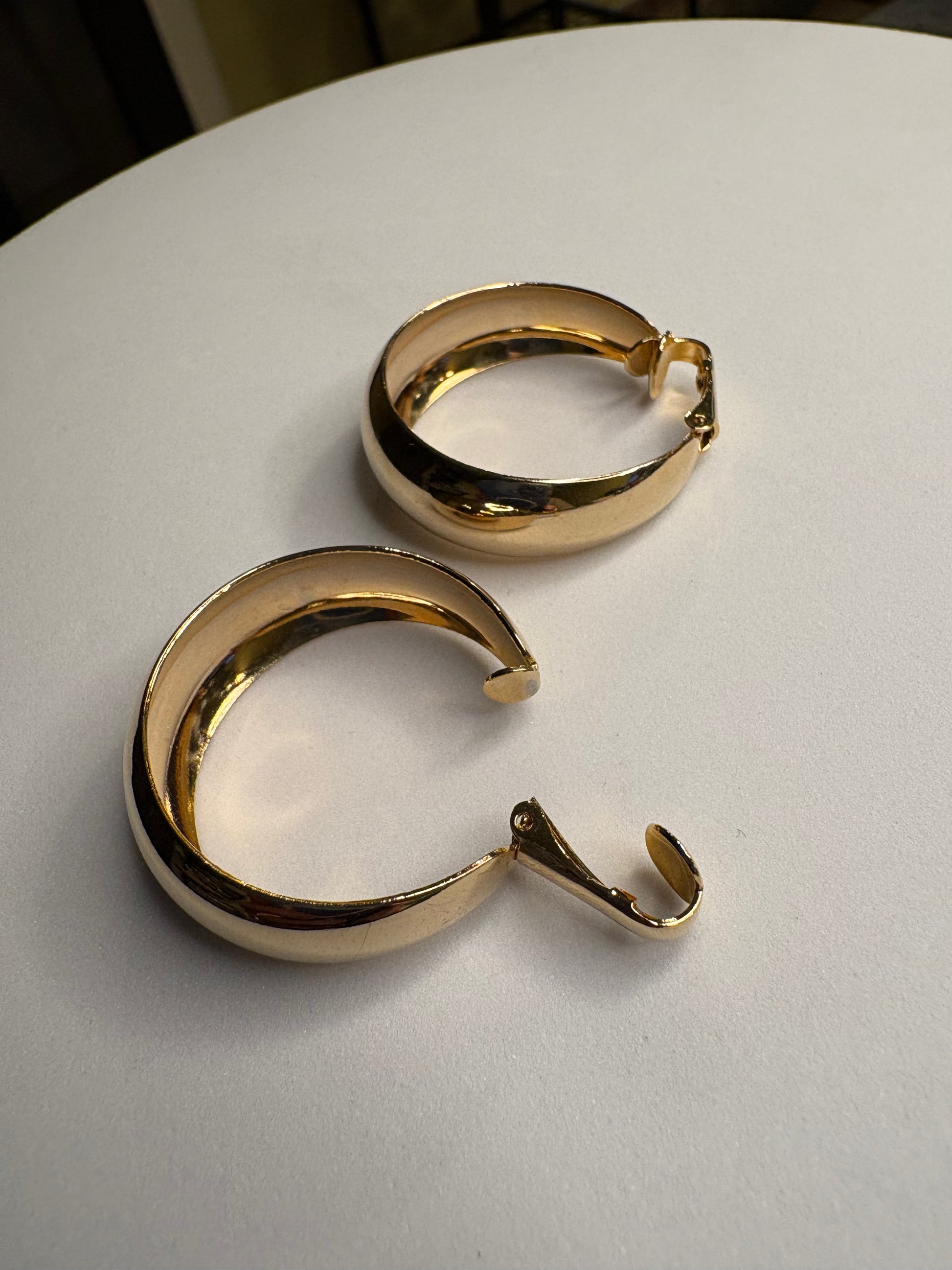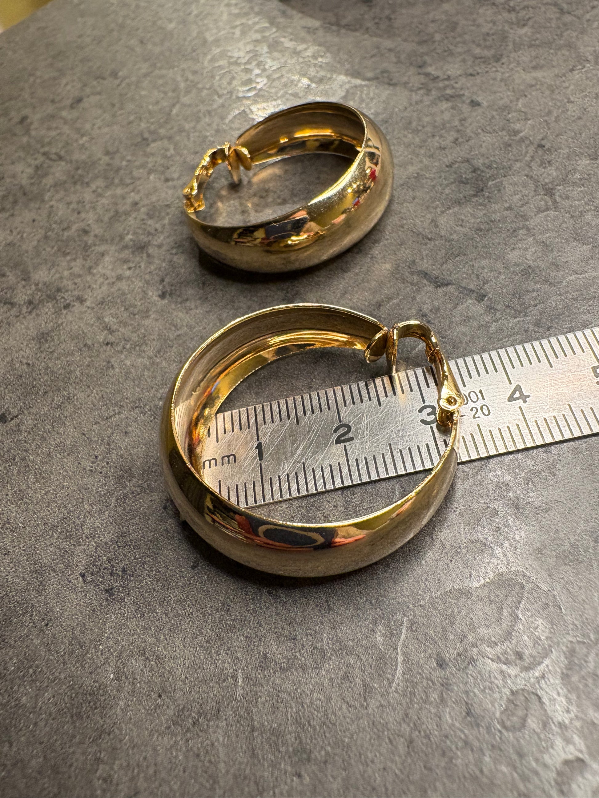 Iconici orecchini vintage a clip in metallo dorato lucido, forma tonda bombata con superficie specchiata. Design importante e scenografico anni ’80-’90, perfetti per look glamour e serali. Molto eleganti e senza tempo.