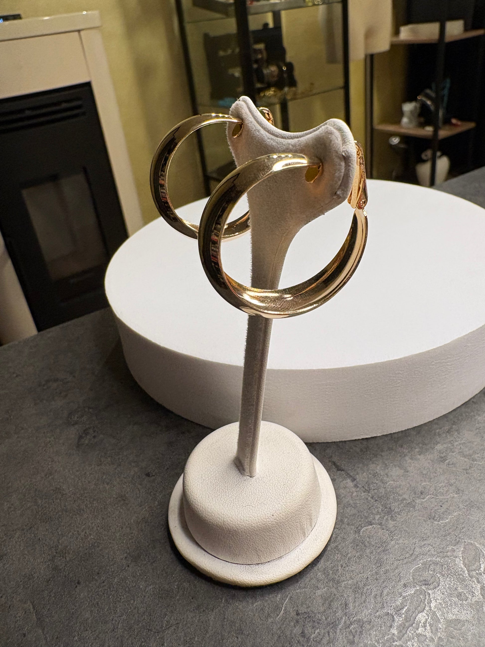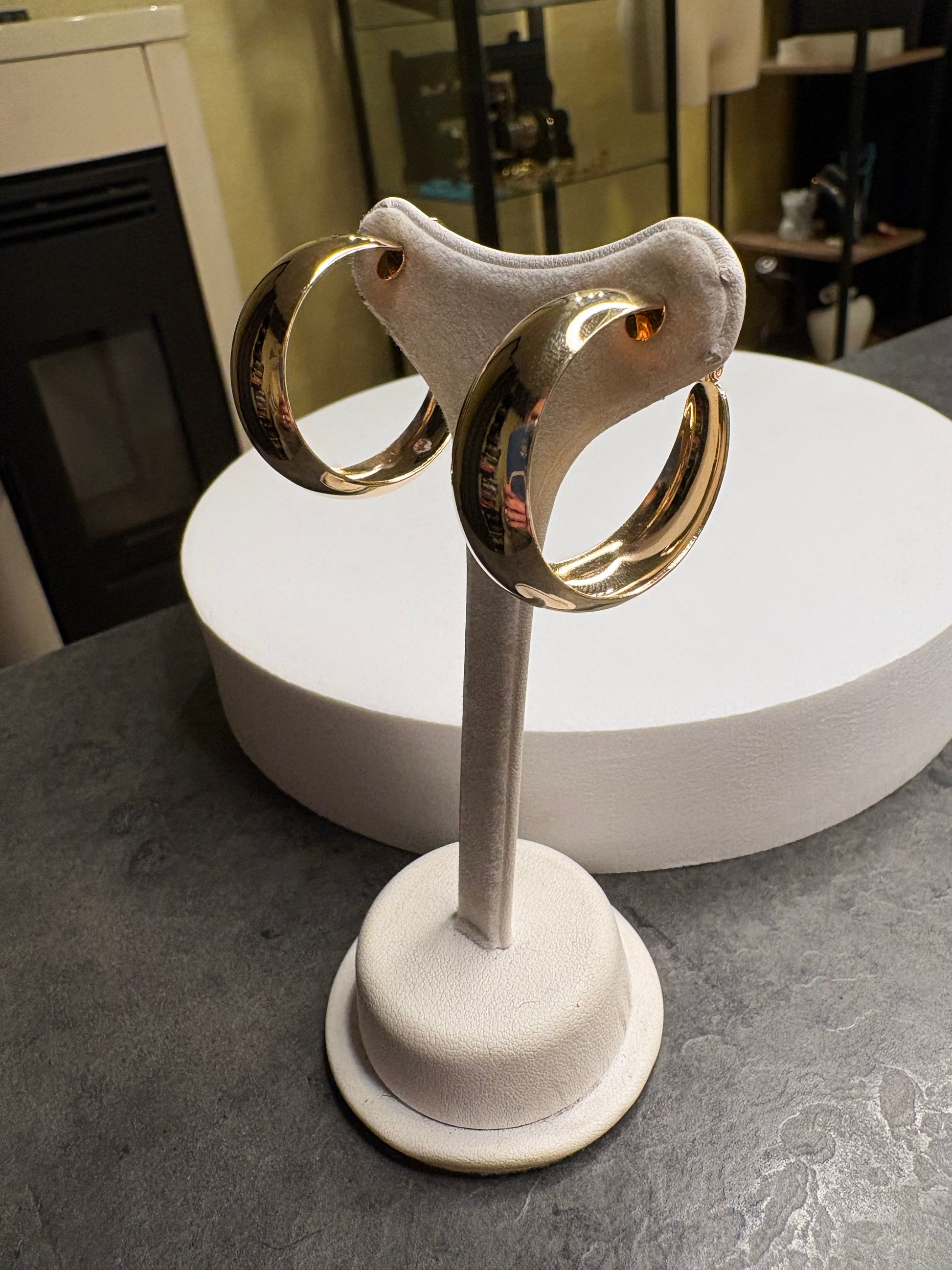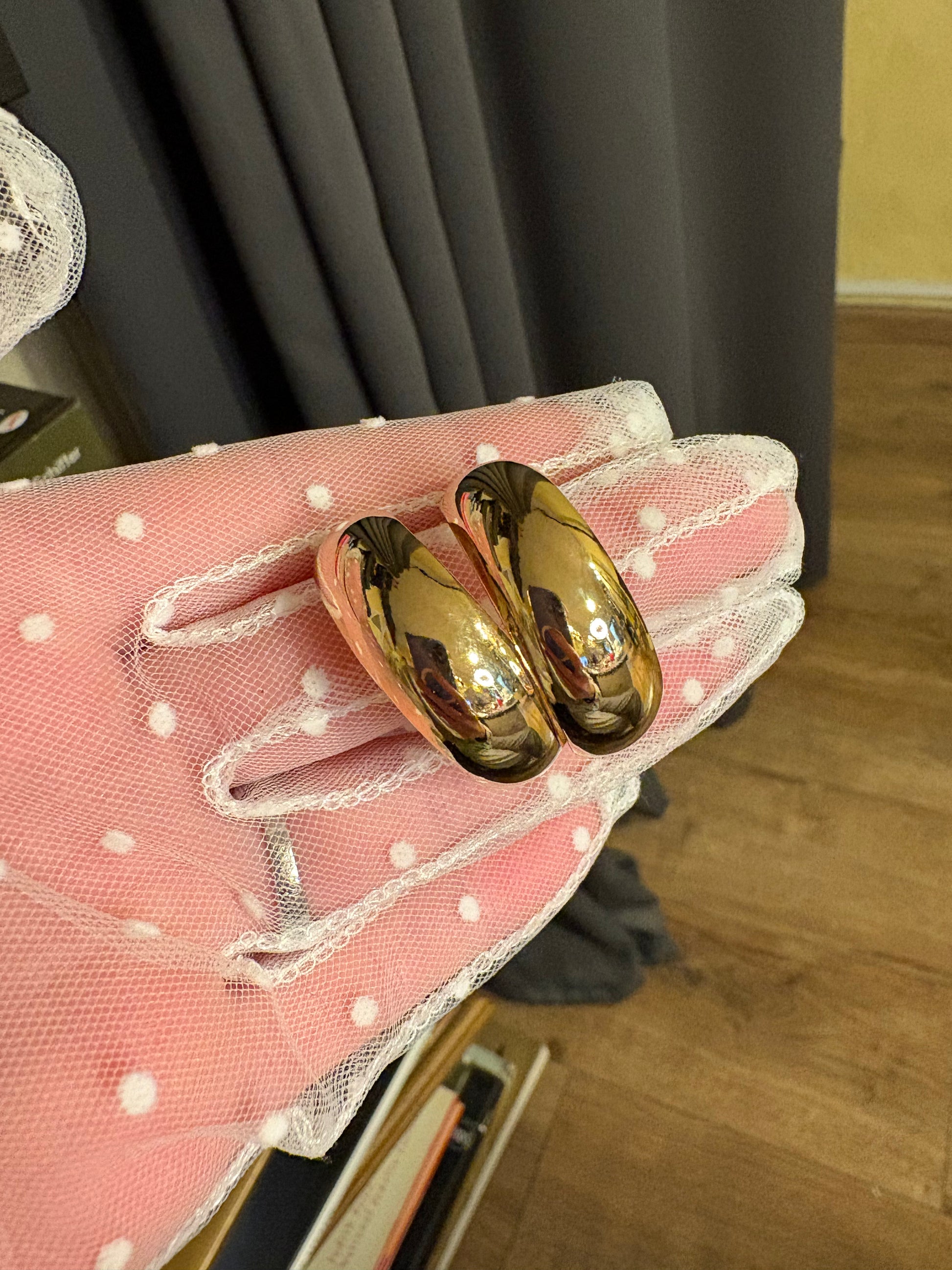 Iconici orecchini vintage a clip in metallo dorato lucido, forma tonda bombata con superficie specchiata. Design importante e scenografico anni ’80-’90, perfetti per look glamour e serali. Molto eleganti e senza tempo.