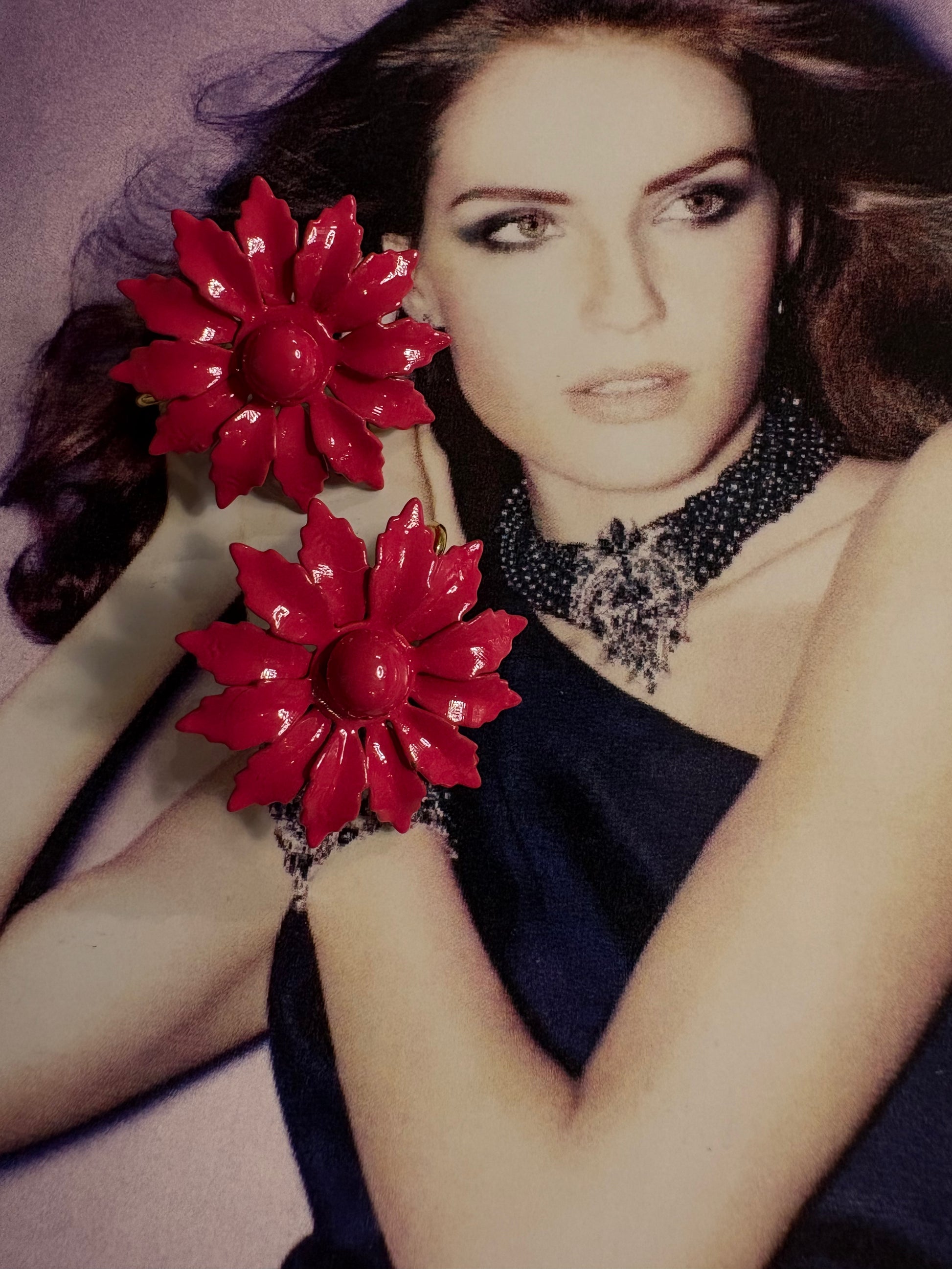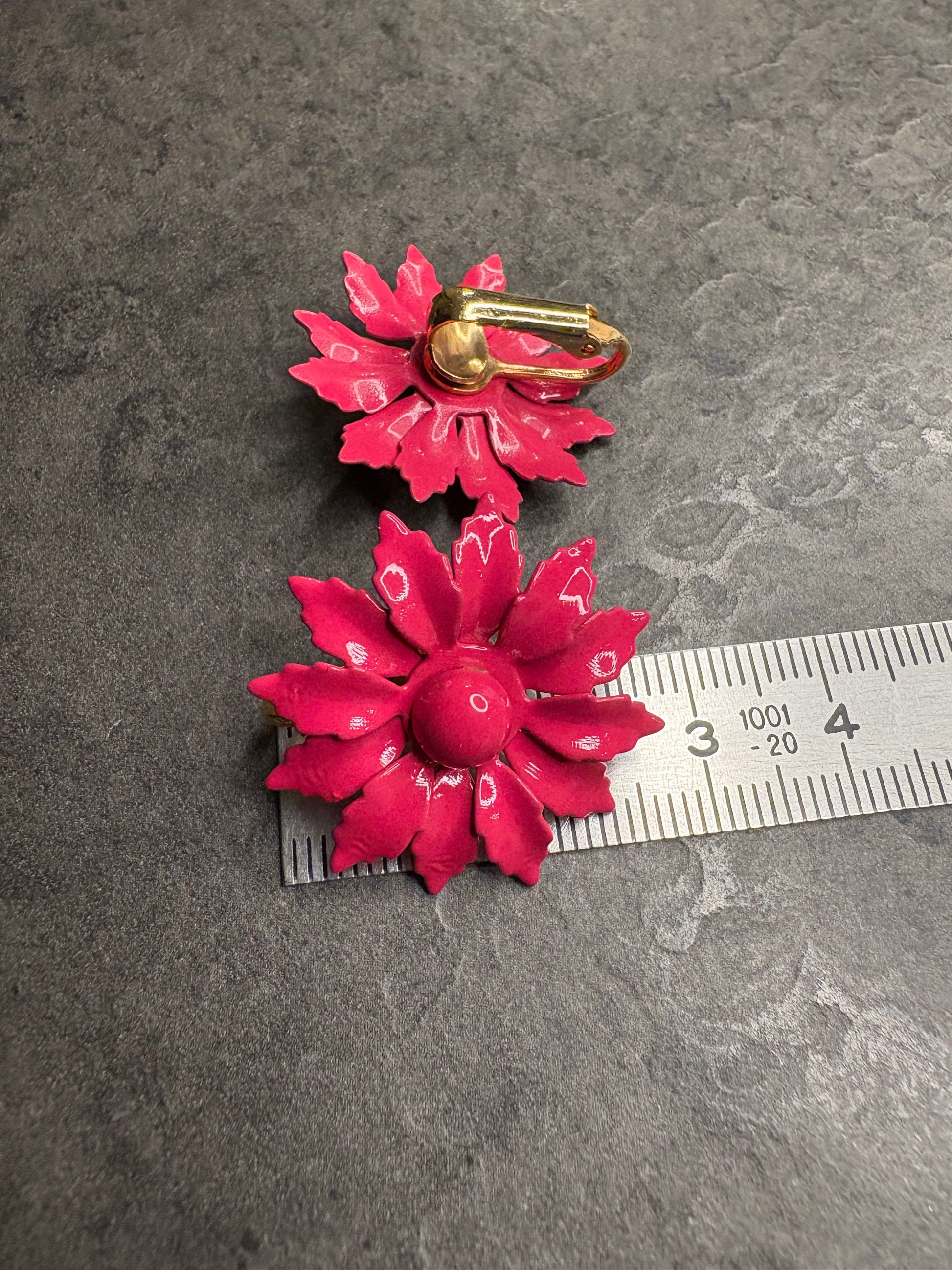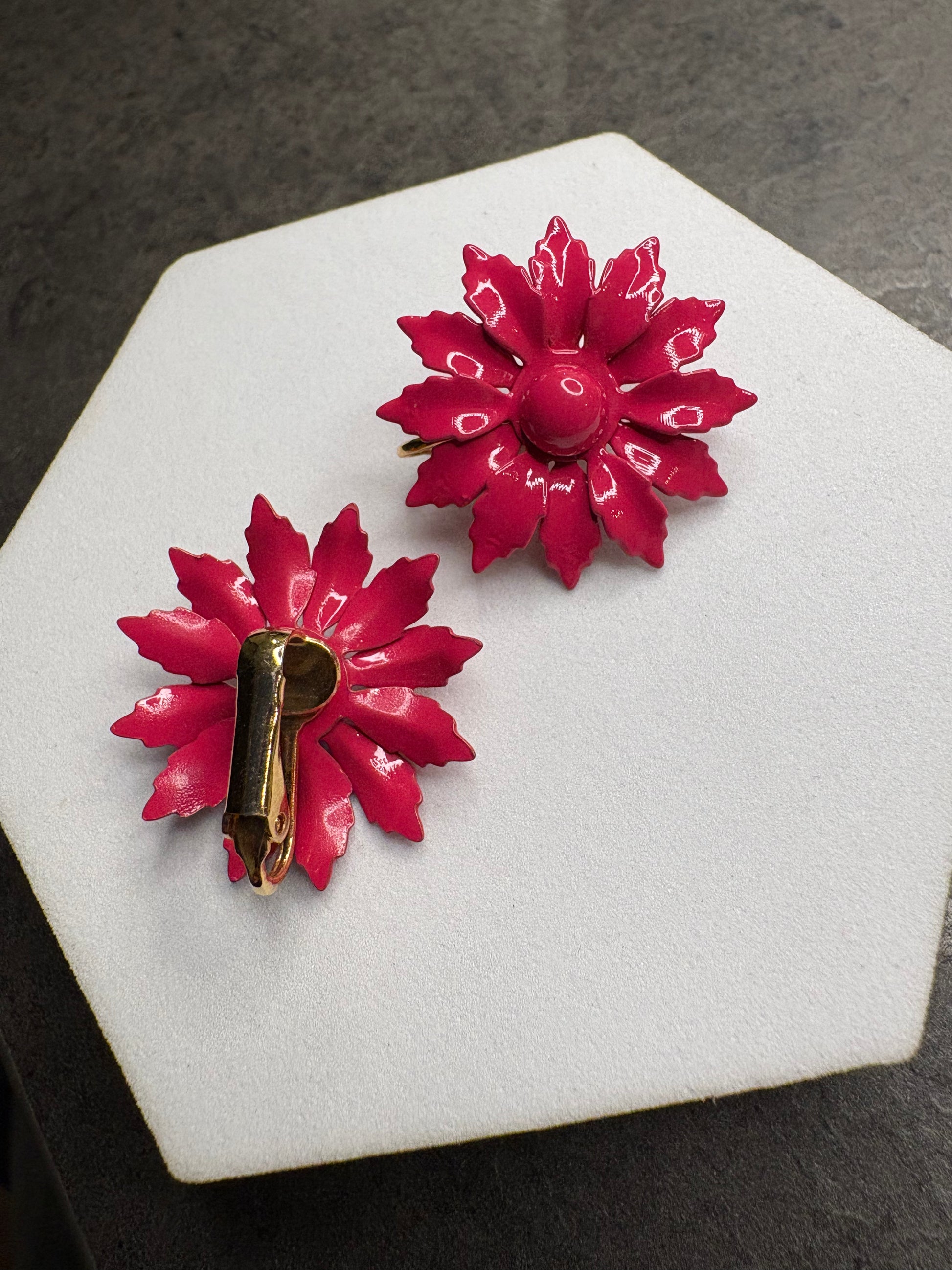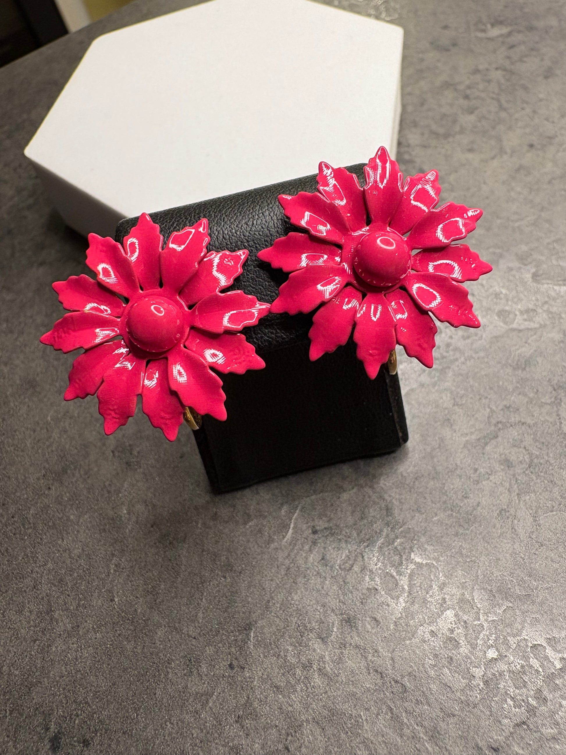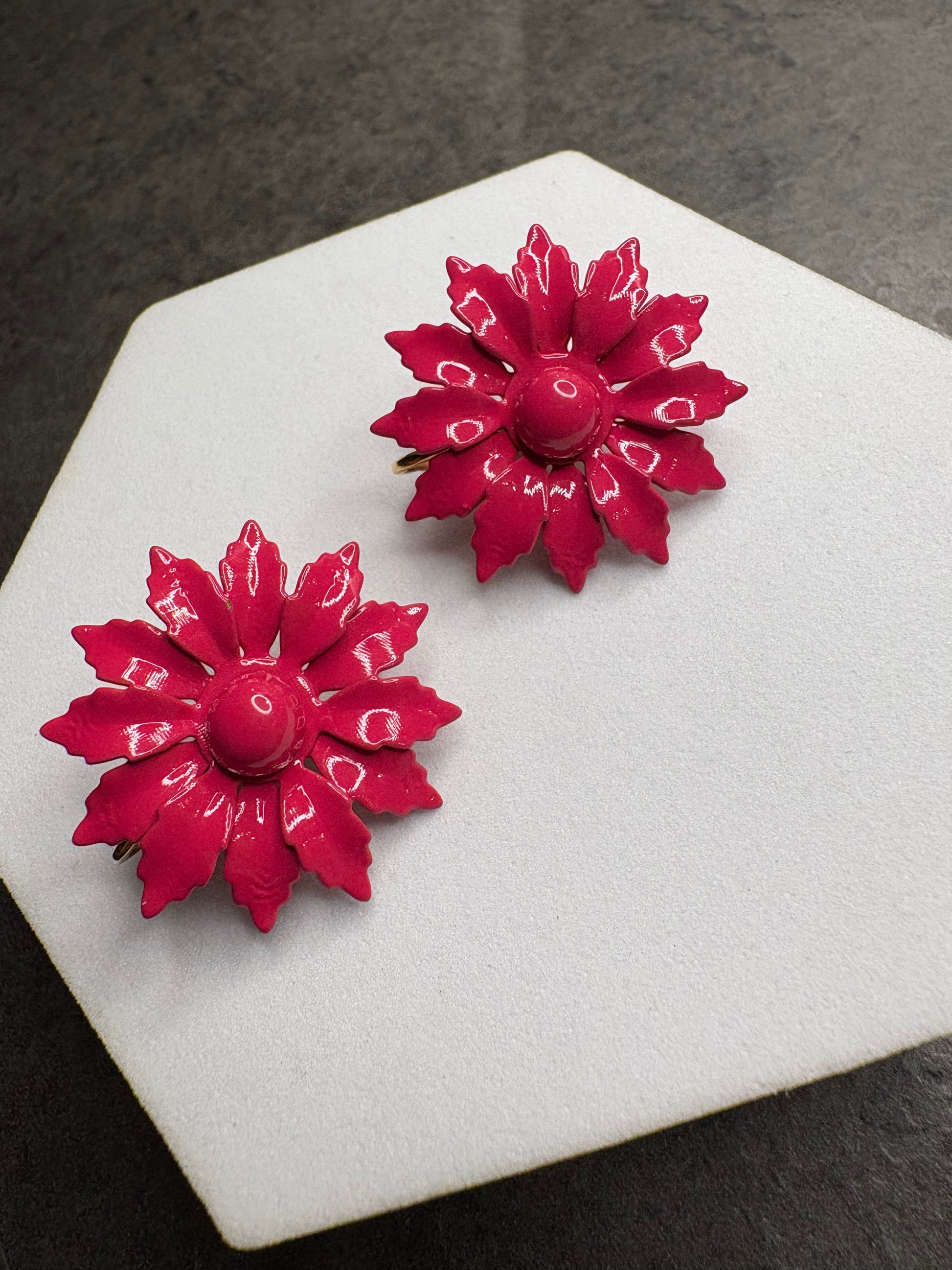 Bellissimi orecchini a clip vintage a forma di fiore, realizzati in metallo color oro e interamente ricoperti di smalto fucsia. I petali sono sagomati e leggermente tridimensionali, con una finitura lucida che esalta la vivacità del colore. Il centro del fiore è ben definito e dona equilibrio alla composizione. Un paio di orecchini allegri e femminili, perfetti per aggiungere un accento di colore deciso e rétro a qualsiasi look.