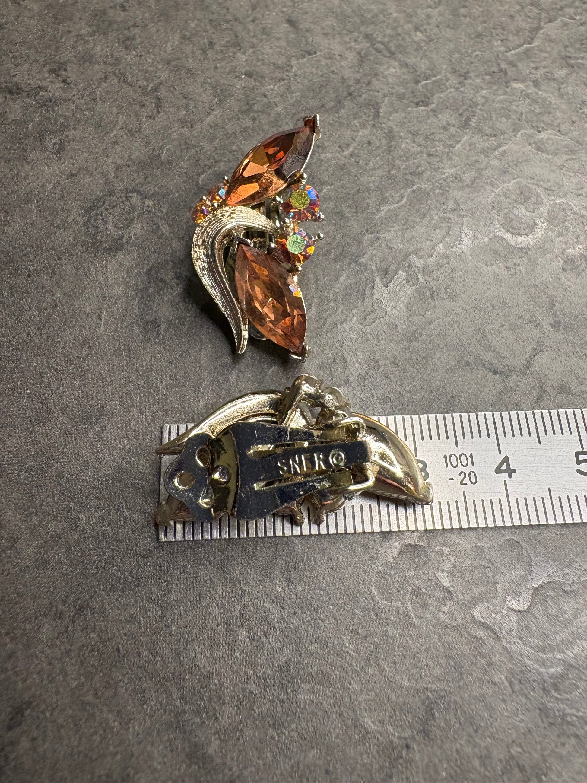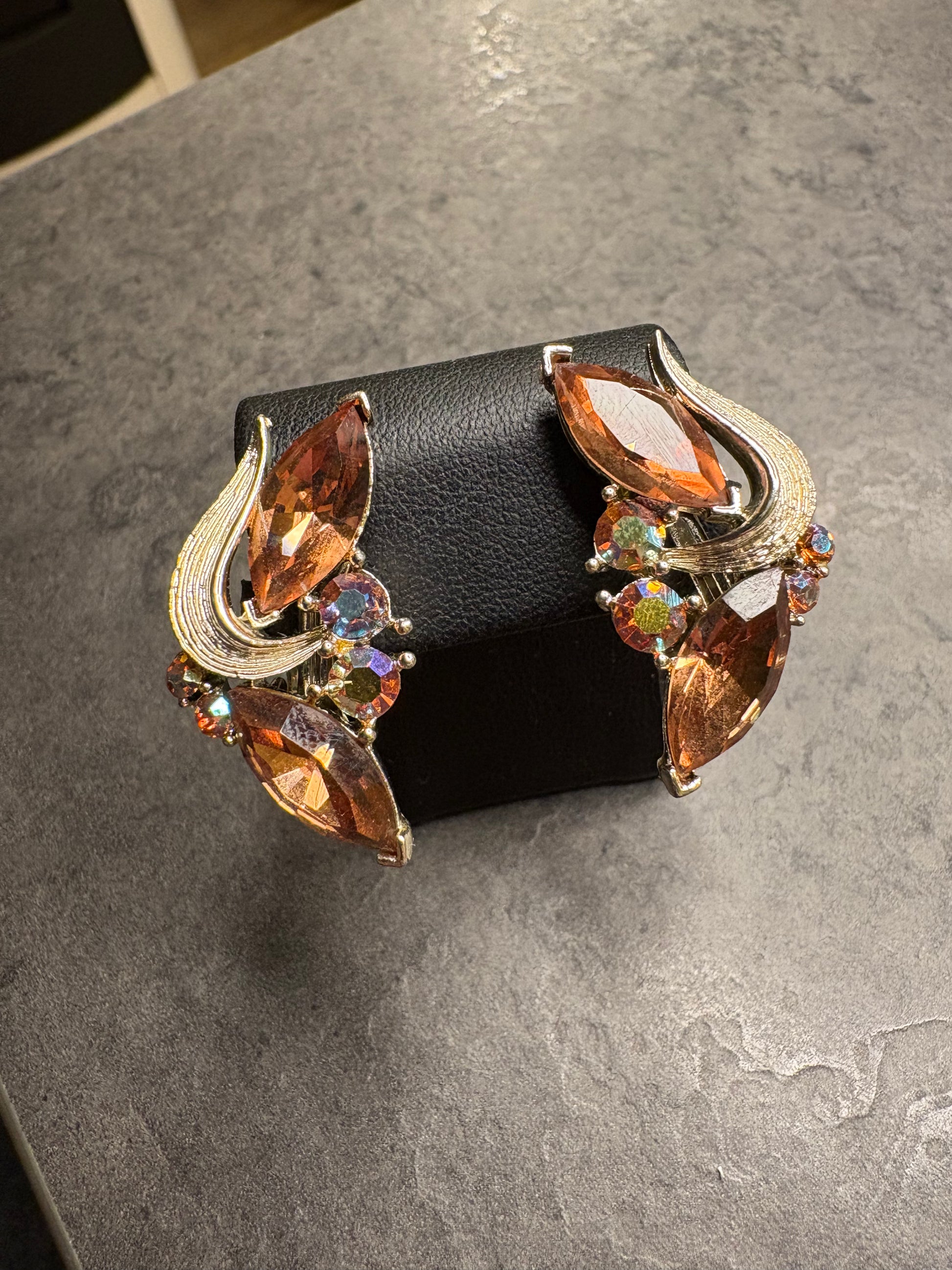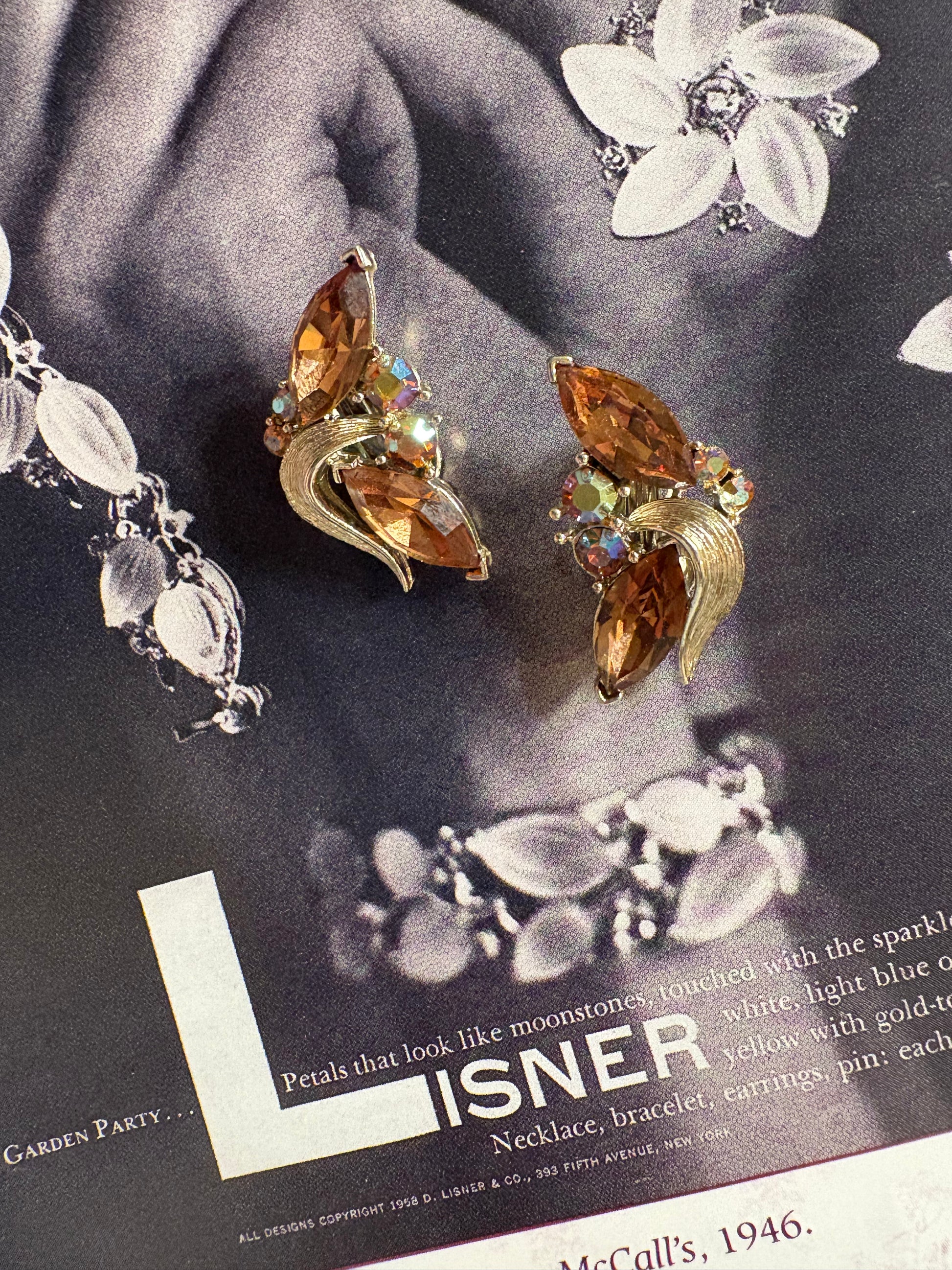 Raffinato paio di orecchini a clip firmati Lisner, iconico marchio americano attivo soprattutto tra gli anni ’50 e ’60. Il design è elegante e tridimensionale: grandi cristalli color ambra dal taglio marquise sono incastonati in una montatura dorata finemente lavorata, arricchita da piccoli cristalli multicolore iridescenti. La composizione richiama motivi floreali e fogliati, con un equilibrio perfetto tra luce, movimento e volume. Orecchini di grande presenza scenica, ideali per chi ama il glamour vintage di alta qualità.