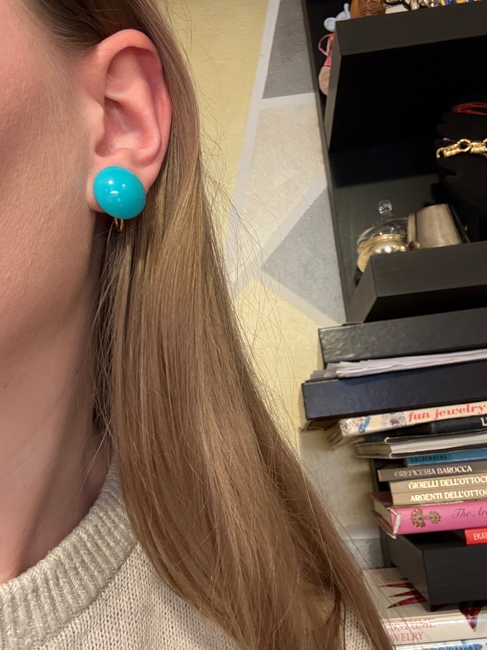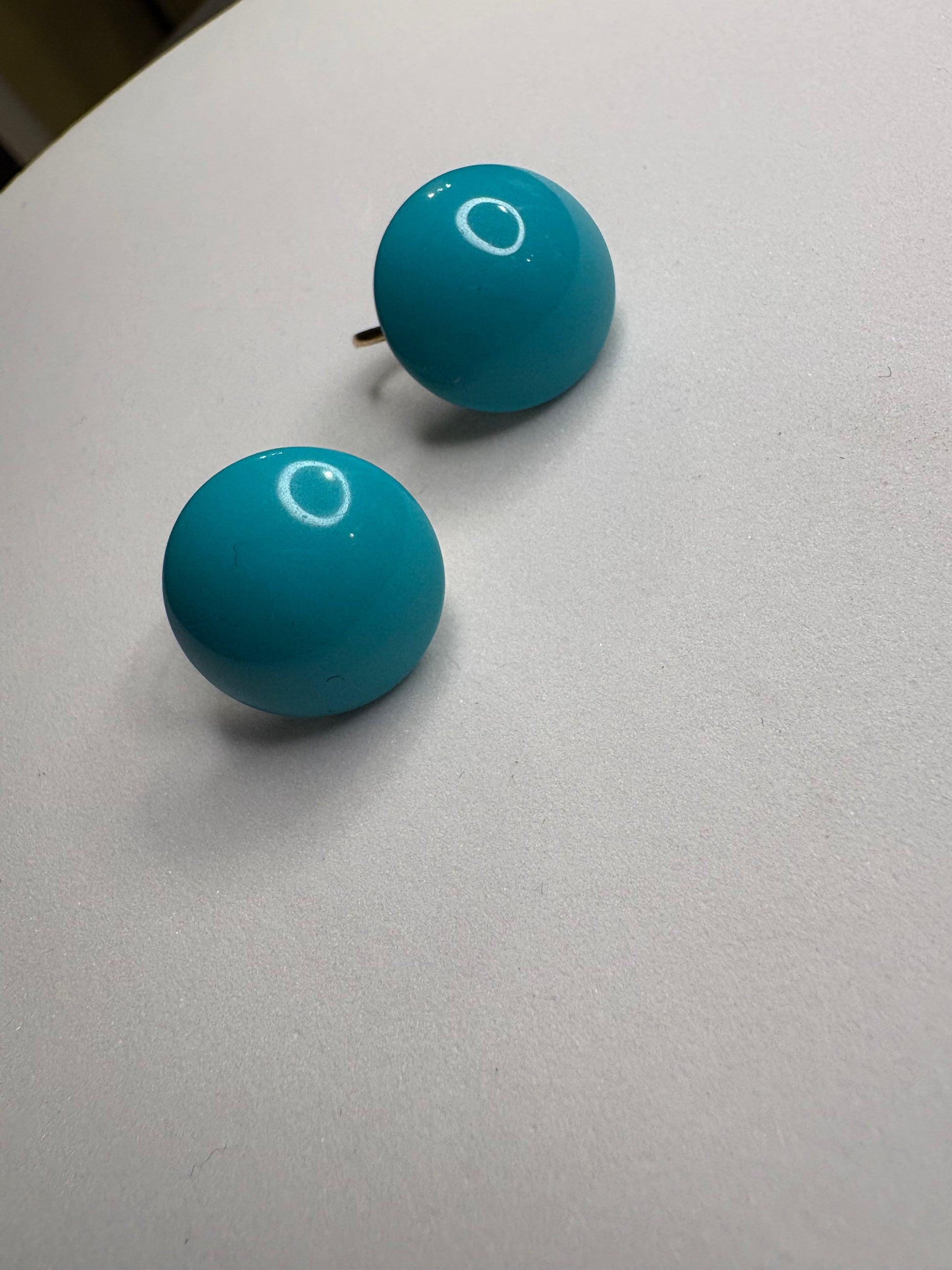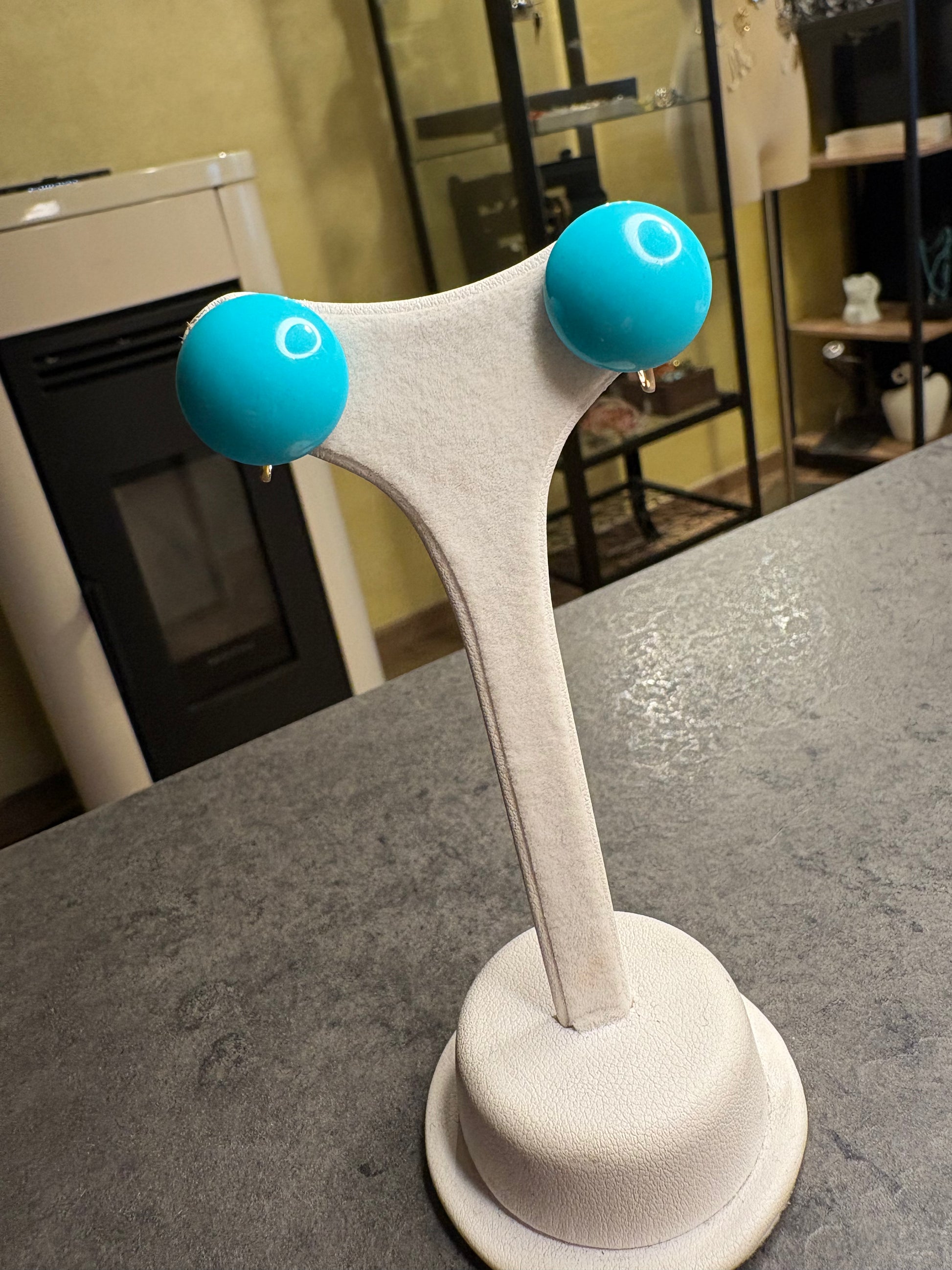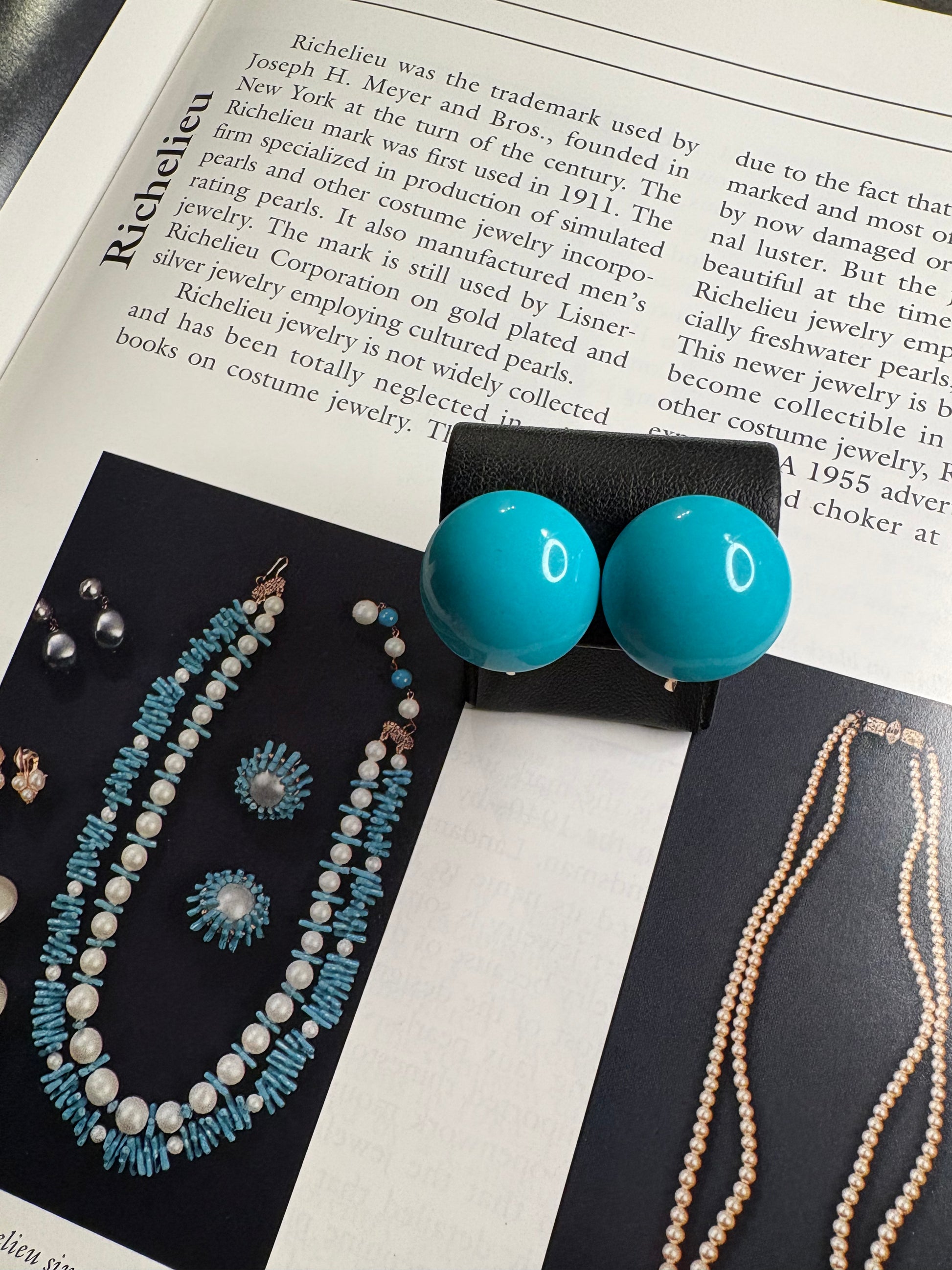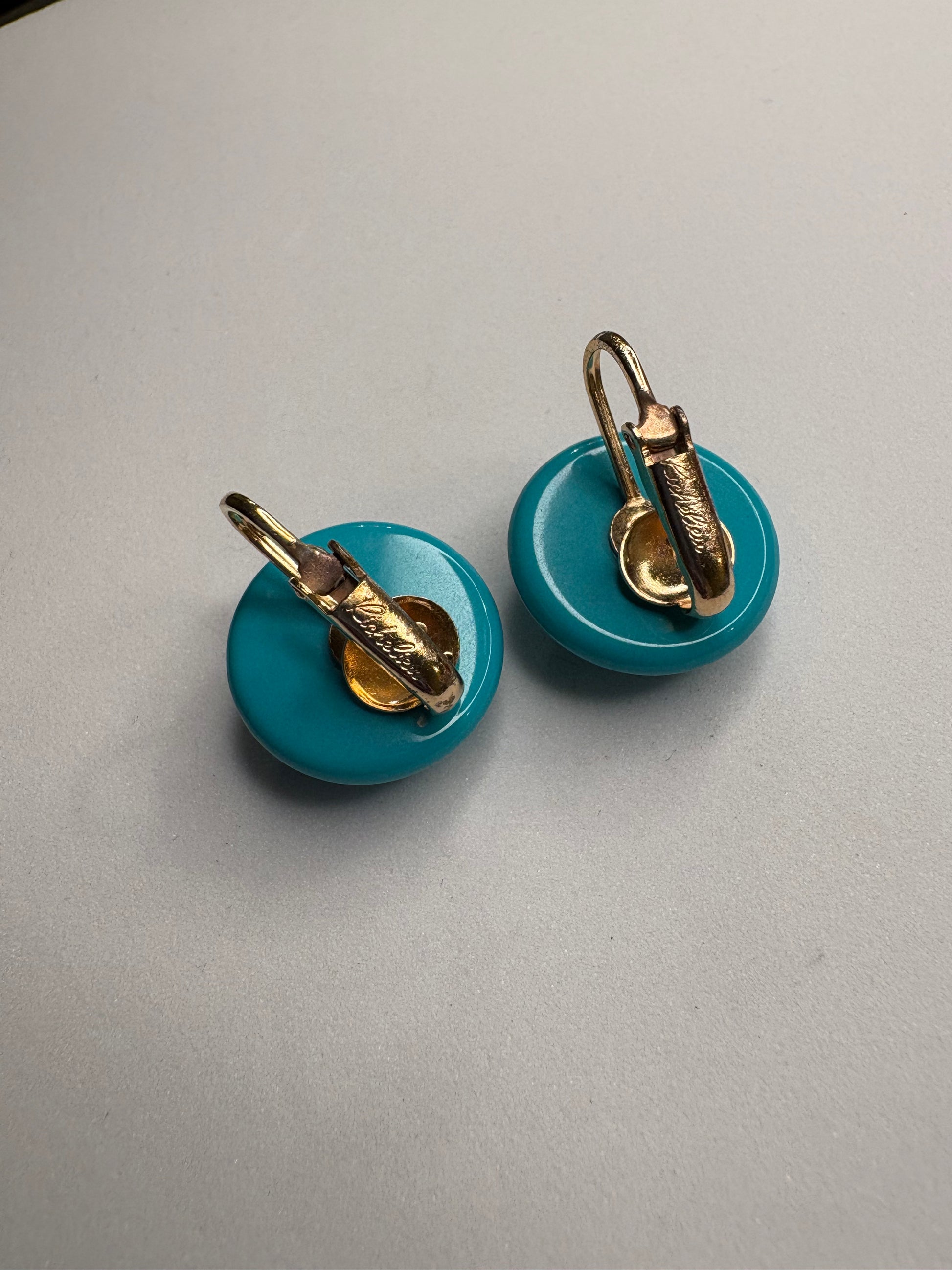 Bellissimi orecchini a clip firmati Richelieu, realizzati in plastica color turchese intenso e luminoso, dalla superficie liscia e leggermente bombata che cattura subito lo sguardo. Il colore è pieno e vibrante, tipico delle produzioni vintage di qualità, e crea un raffinato contrasto con la chiusura in metallo dorato, solida e ben strutturata. Il design essenziale li rende estremamente chic e facili da abbinare, perfetti per aggiungere un tocco di colore deciso ma elegante sia a look estivi che a outfit più sobri.